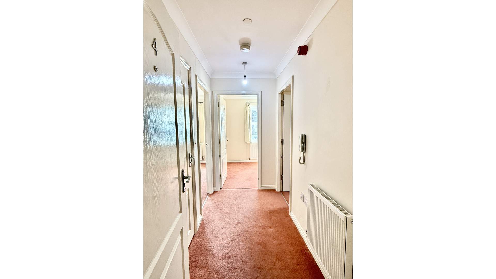 Entrance hallway with the mains electric board located behind the door when entering the apartment. Intercom to allow entry to the building, ceiling down lighters and carpeted flooring