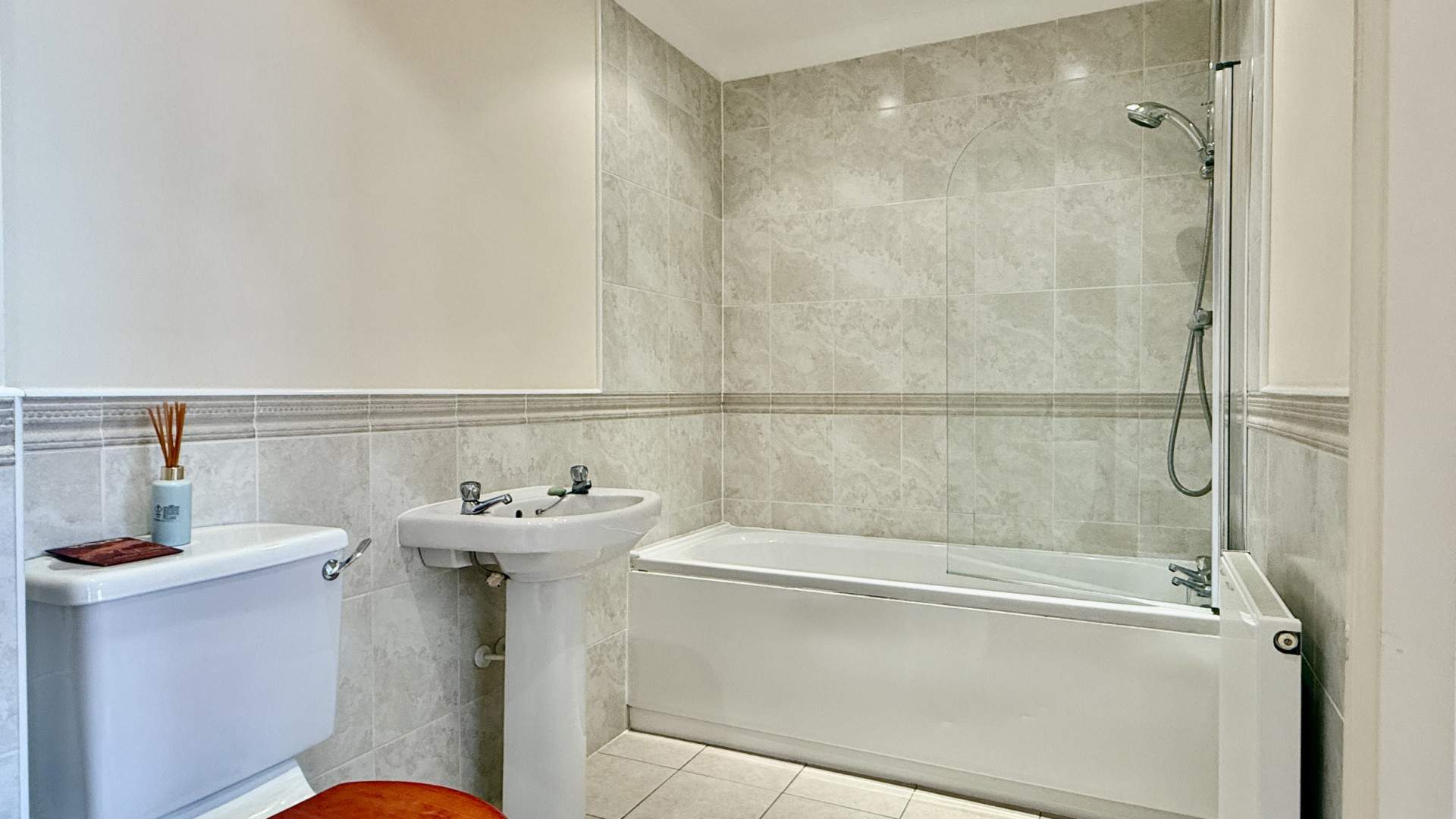 Jack and Jill bathroom with a white 3 piece suite comprising of a WC and a pedestal sink. At the far end of the bathroom is the bath with a shower attachment and a glass shower screen. The area around the bath is tiled to the ceiling, the remainder of the bathroom have the walls half tiled/half painted. The bathroom is finished with recessed ceiling spot lights and tiled flooring.