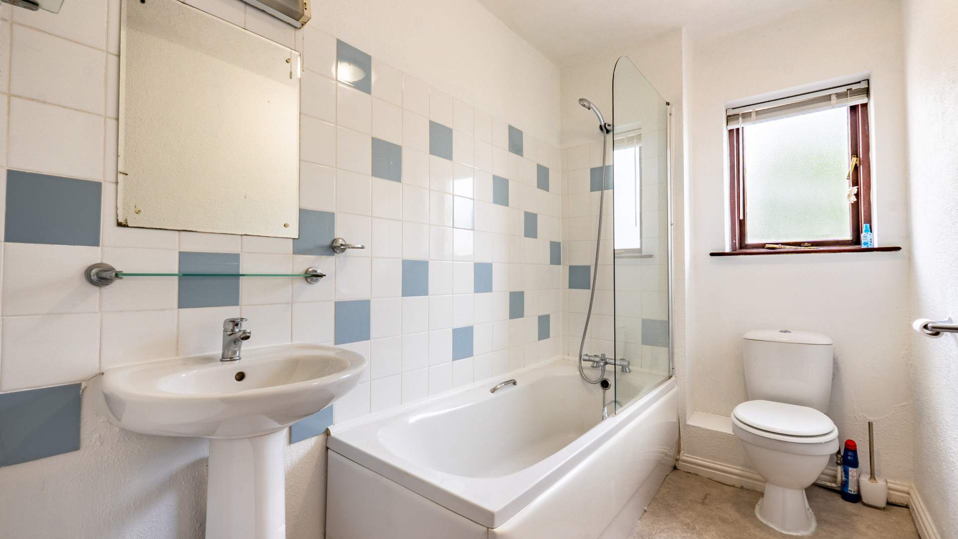 Fitted with a white three piece suite comprising of a bath tub with a shower attachment over and splash screen, pedestal wash hand basin and W.C. Frosted double glazed window. Radiator.