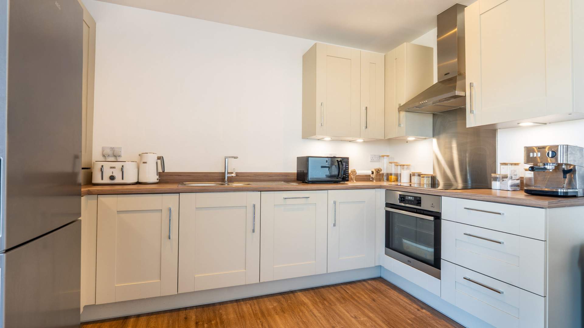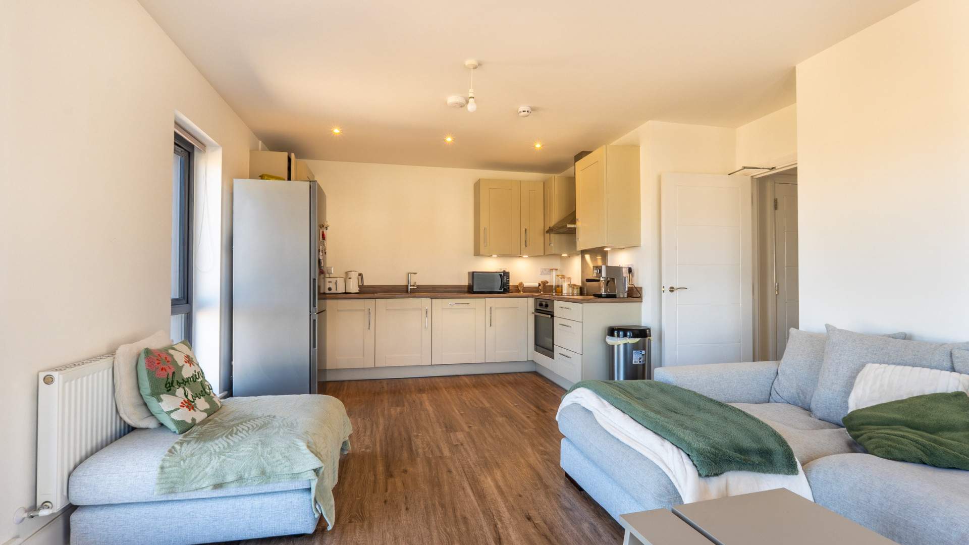 - Open Plan Lounge/Kitchen/Diner (approx. 19’2 x 12’5 min): Integrated appliances include: AEG induction hob (pans included in the sale) with a Zanussi extractor hood above.
