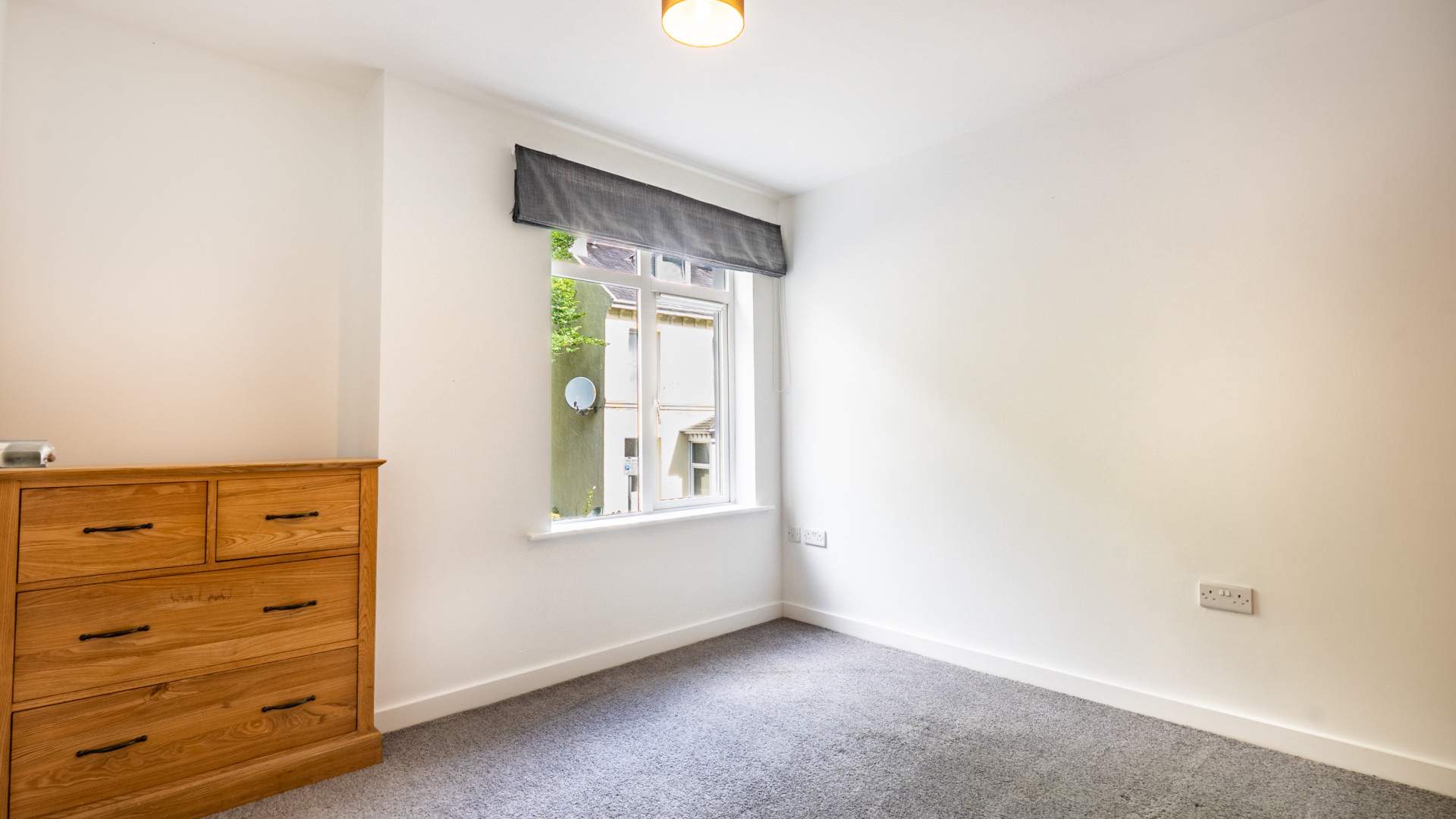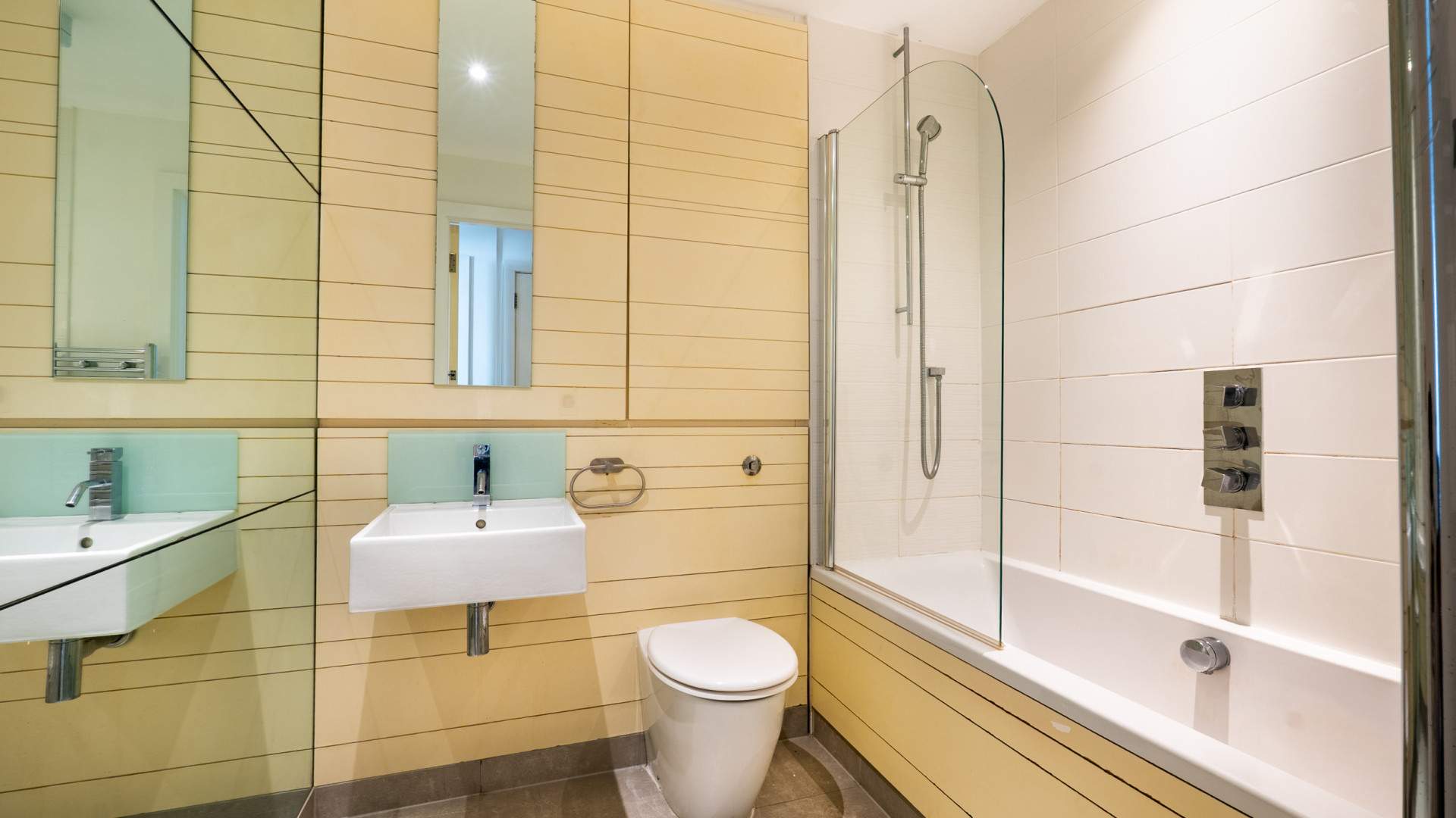 Fitted with a modern three piece suite comprising of a panel bath tub with a shower attachment and splash screen, wash hand basin and W.C. Floor to ceiling length mirror to one wall. Chrome heated towel rail. Discrete over sink storage cupboard with fitted glass shelving. Extractor fan. Ceiling downlighters. Tiled splashbacks. Tiled flooring.