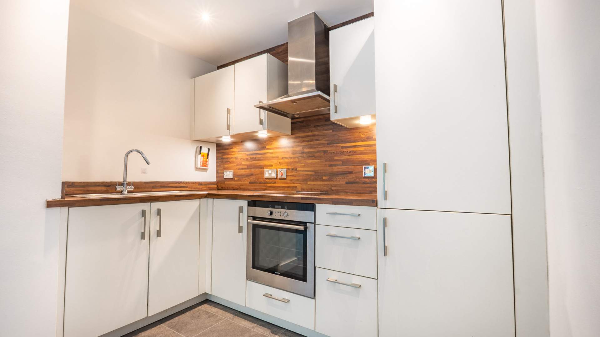 Cupboard with double doors housing the Megaflo hot water tank, fuse box and Indesit washer/dryer (option to be included in the sale). Secure entry intercom phone. Ceiling downlighters.
