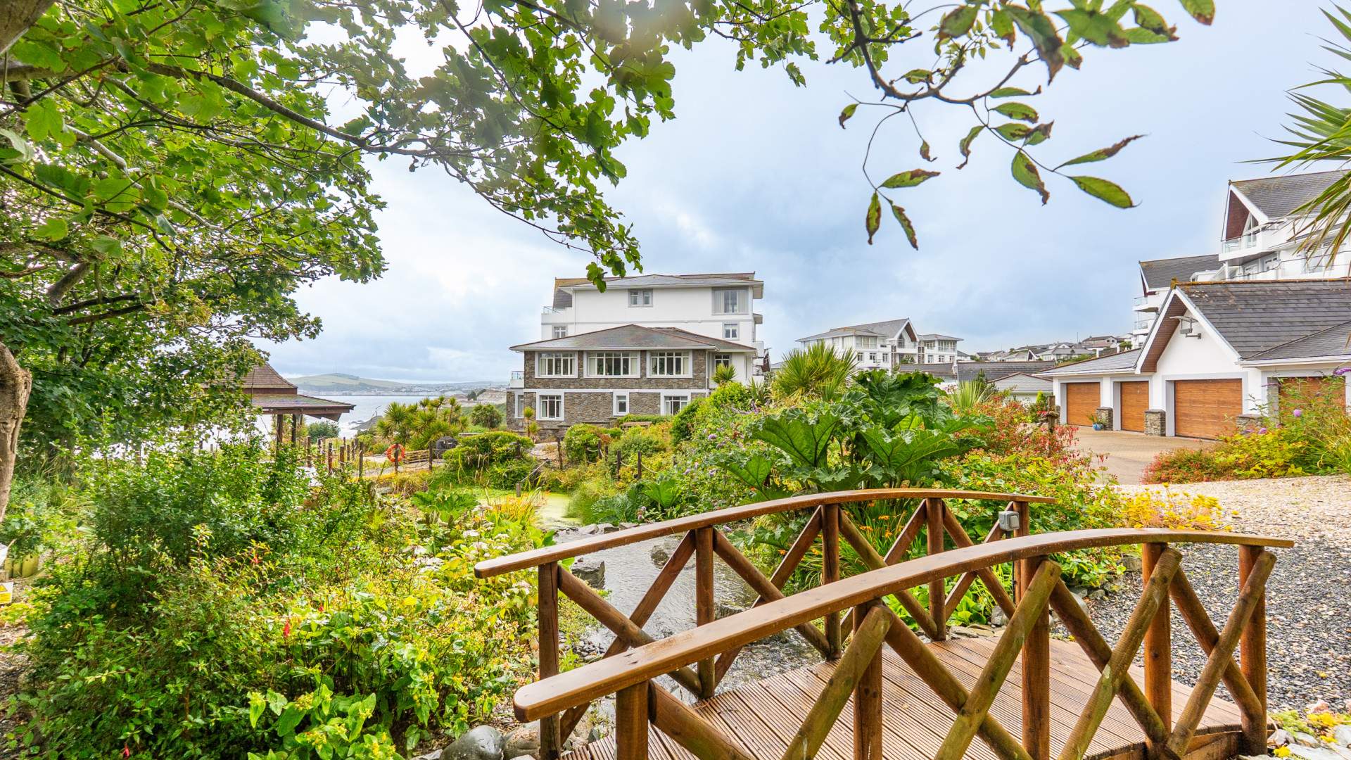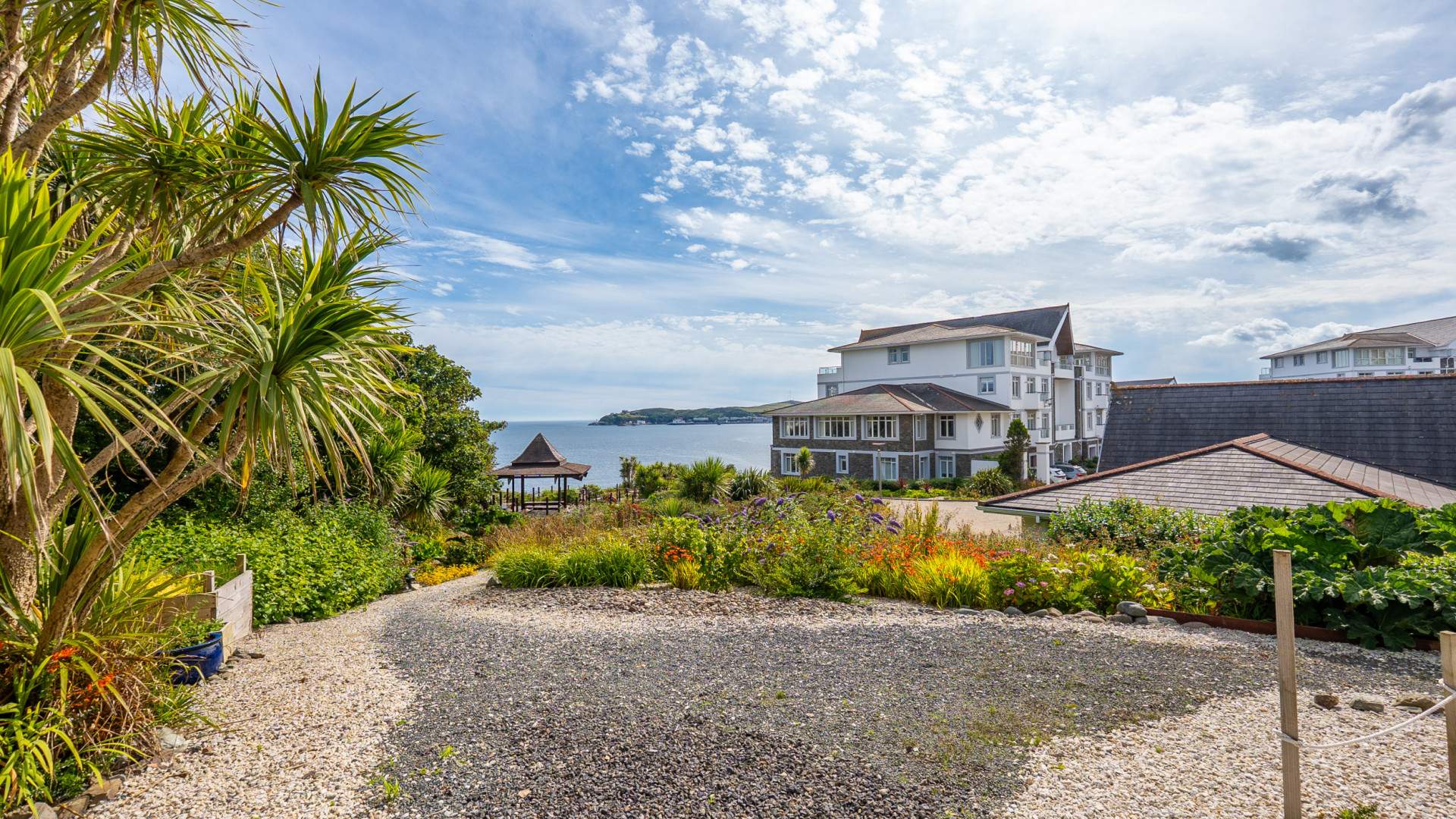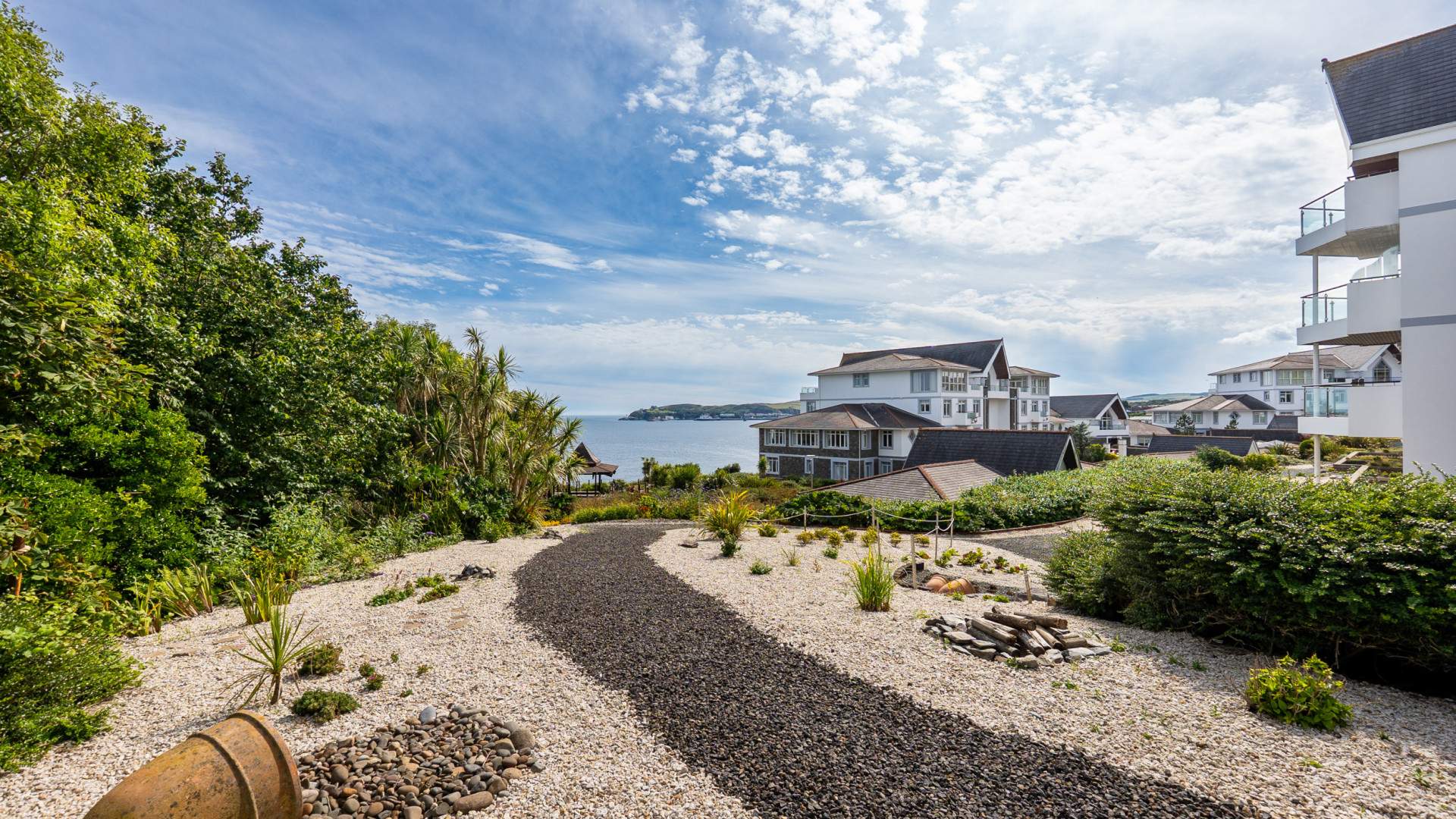 Immaculately maintained communal gardens with a pond, waterfall and pavilion with views out to sea.