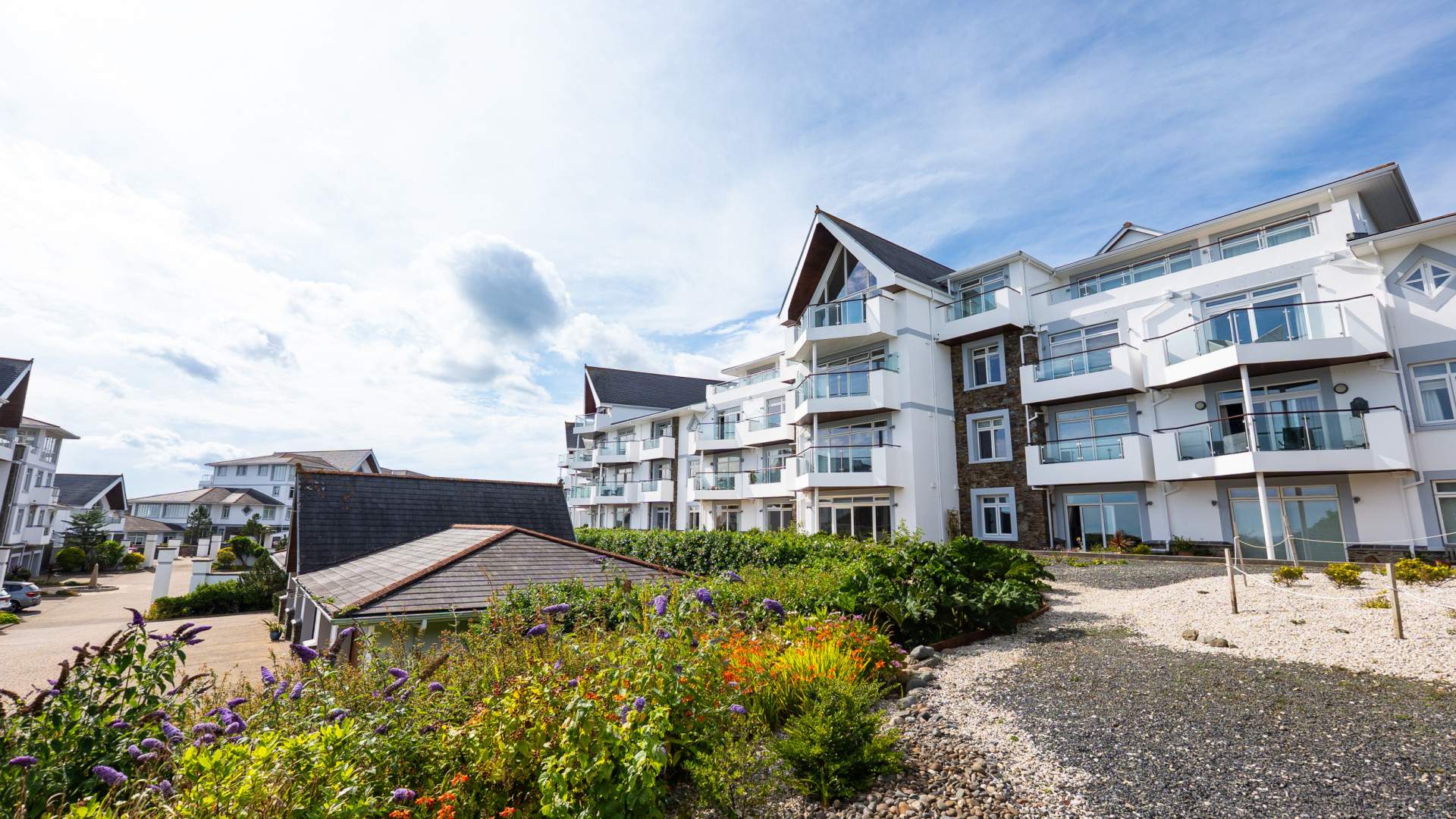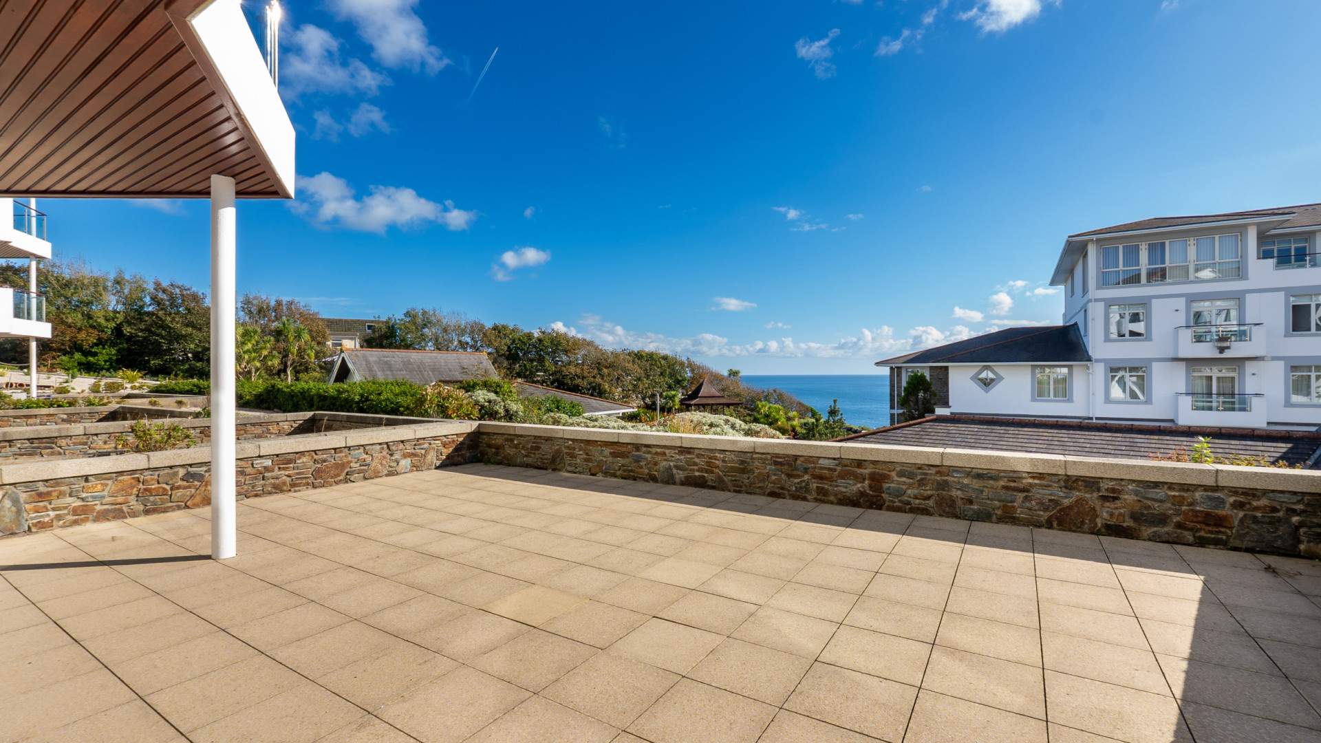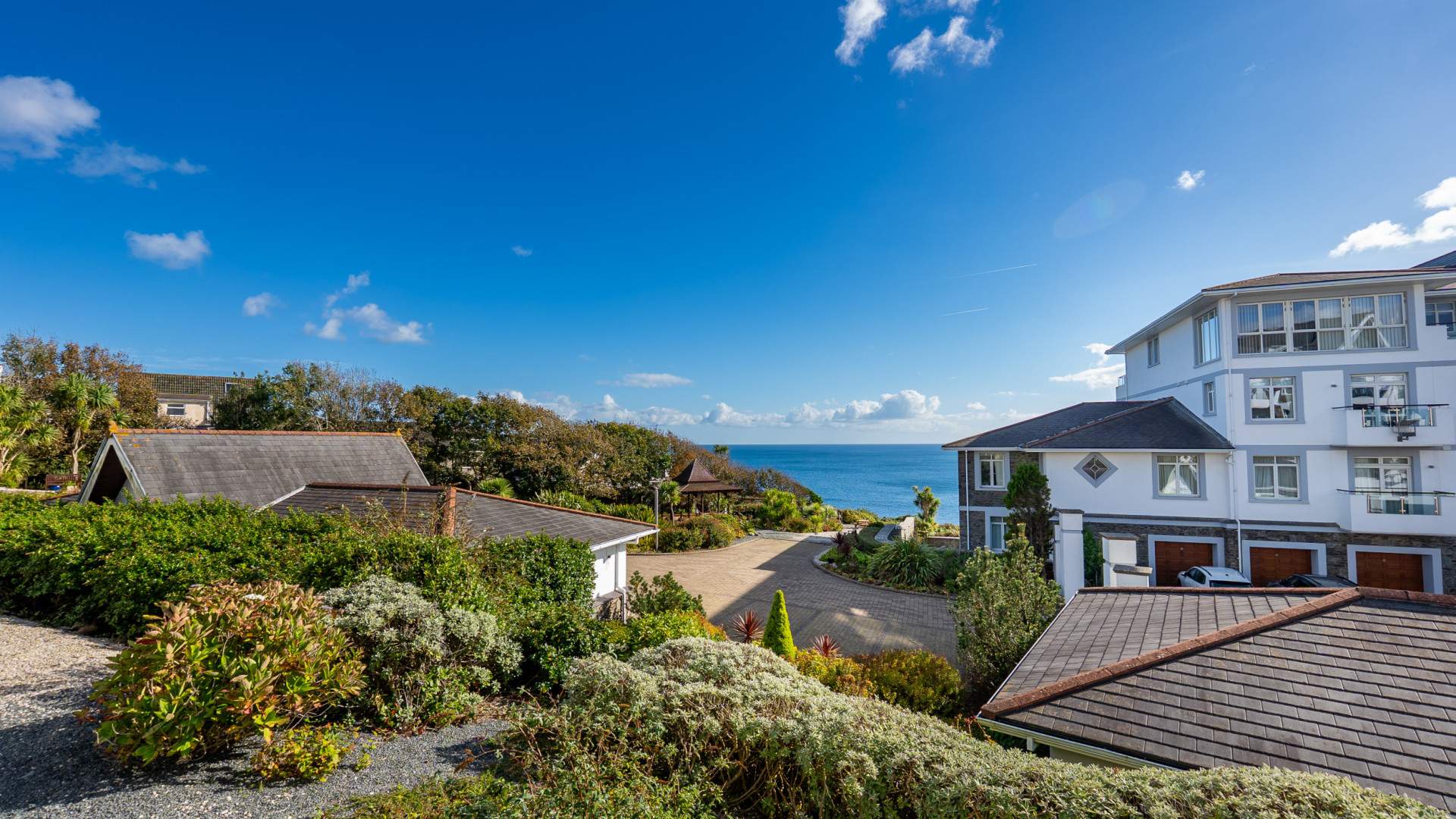 Immaculately maintained communal gardens with a pond, waterfall and pavilion with views out to sea.