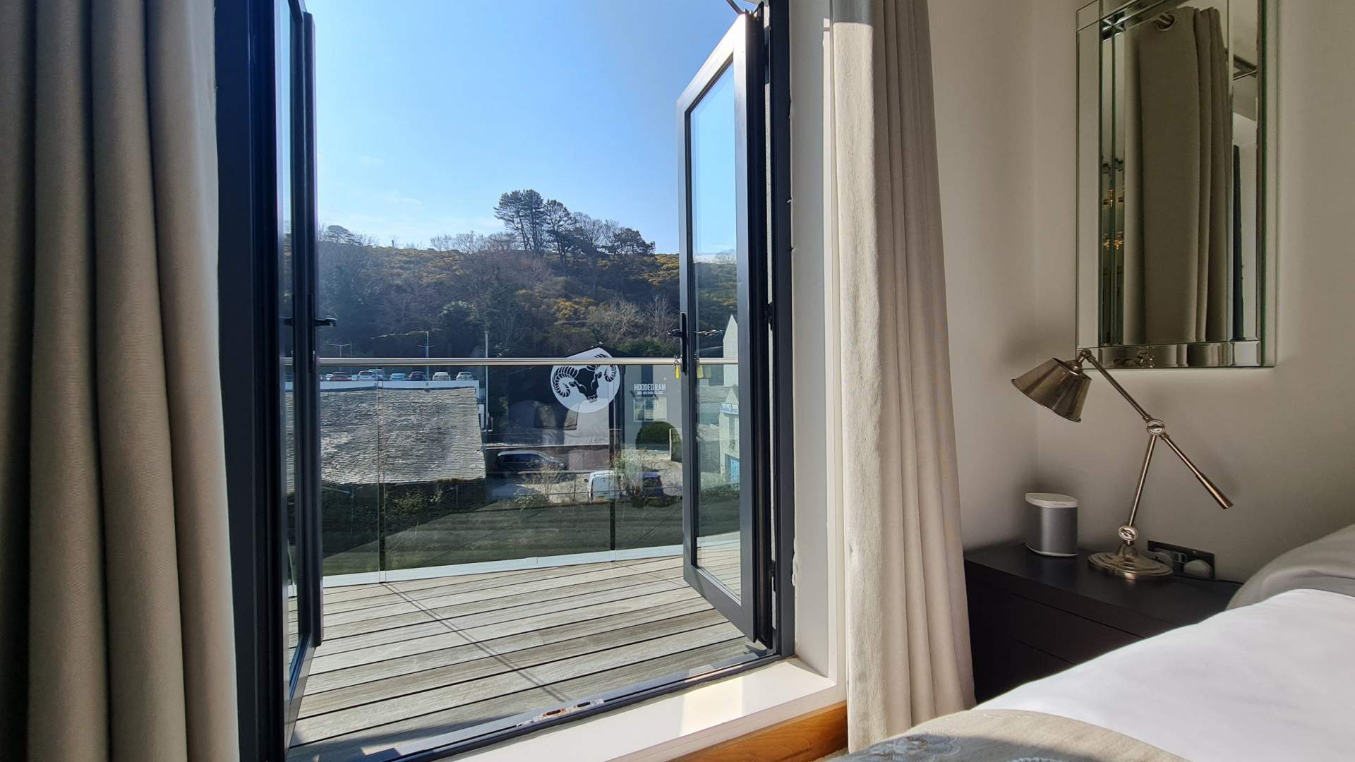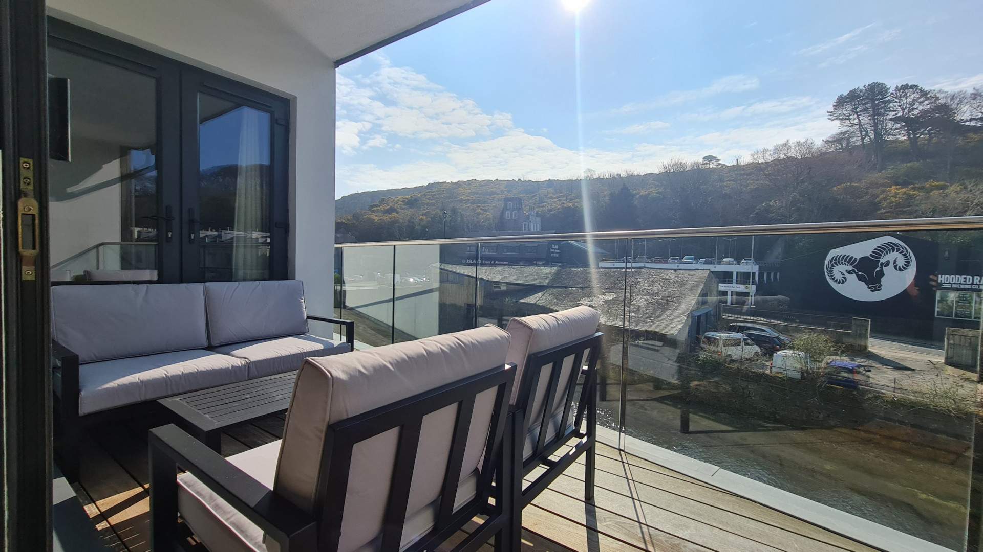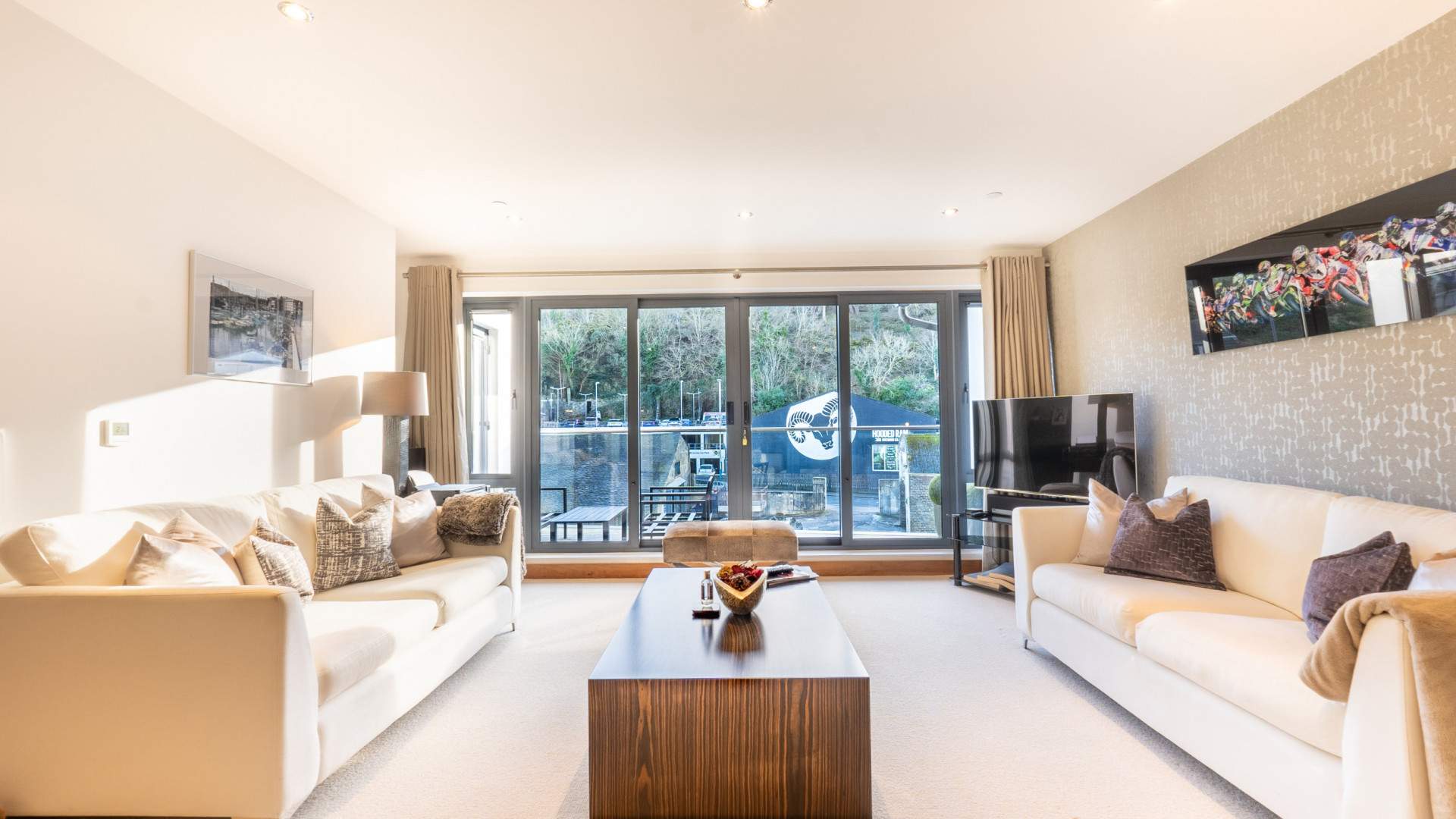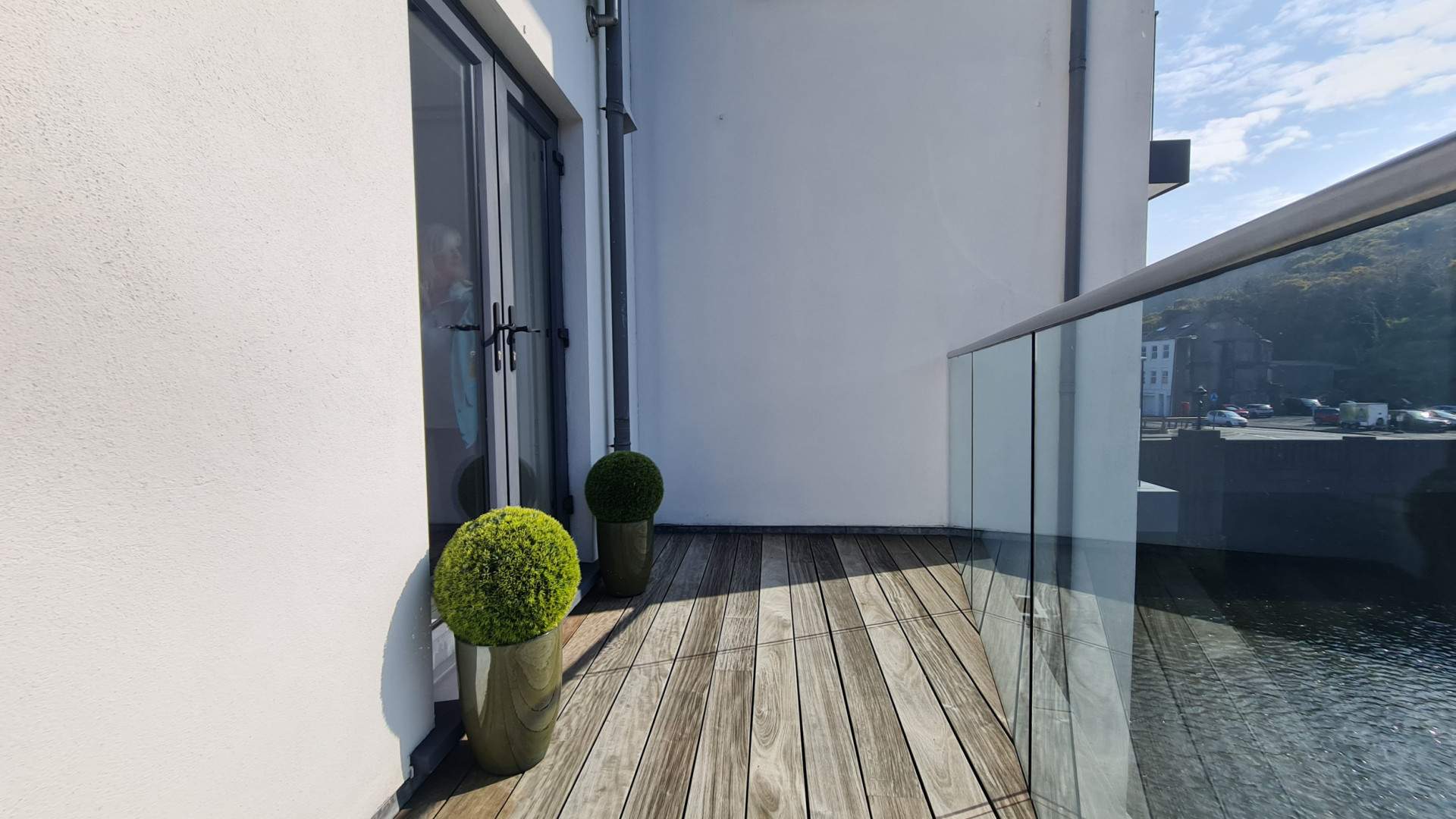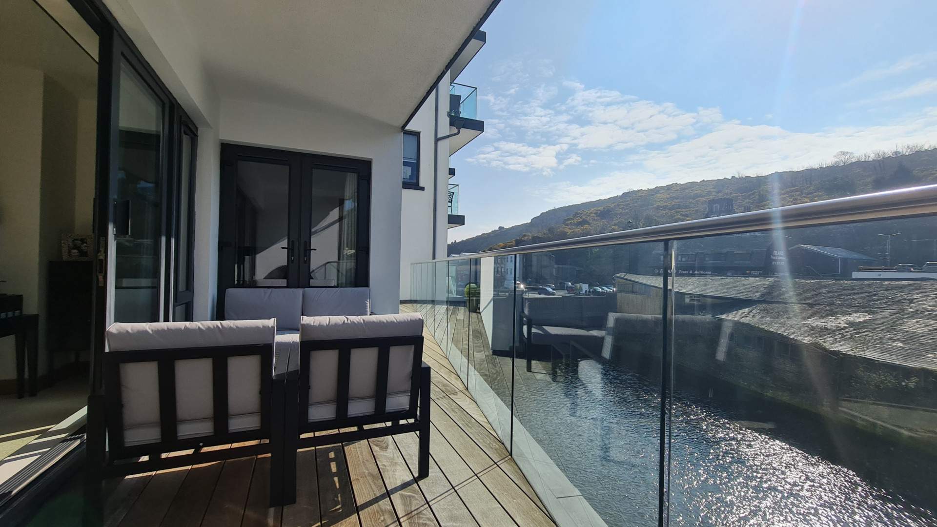 Double glazed sliding doors with windows to either side, open onto the private balcony overlooking the river and providing plenty of natural light.