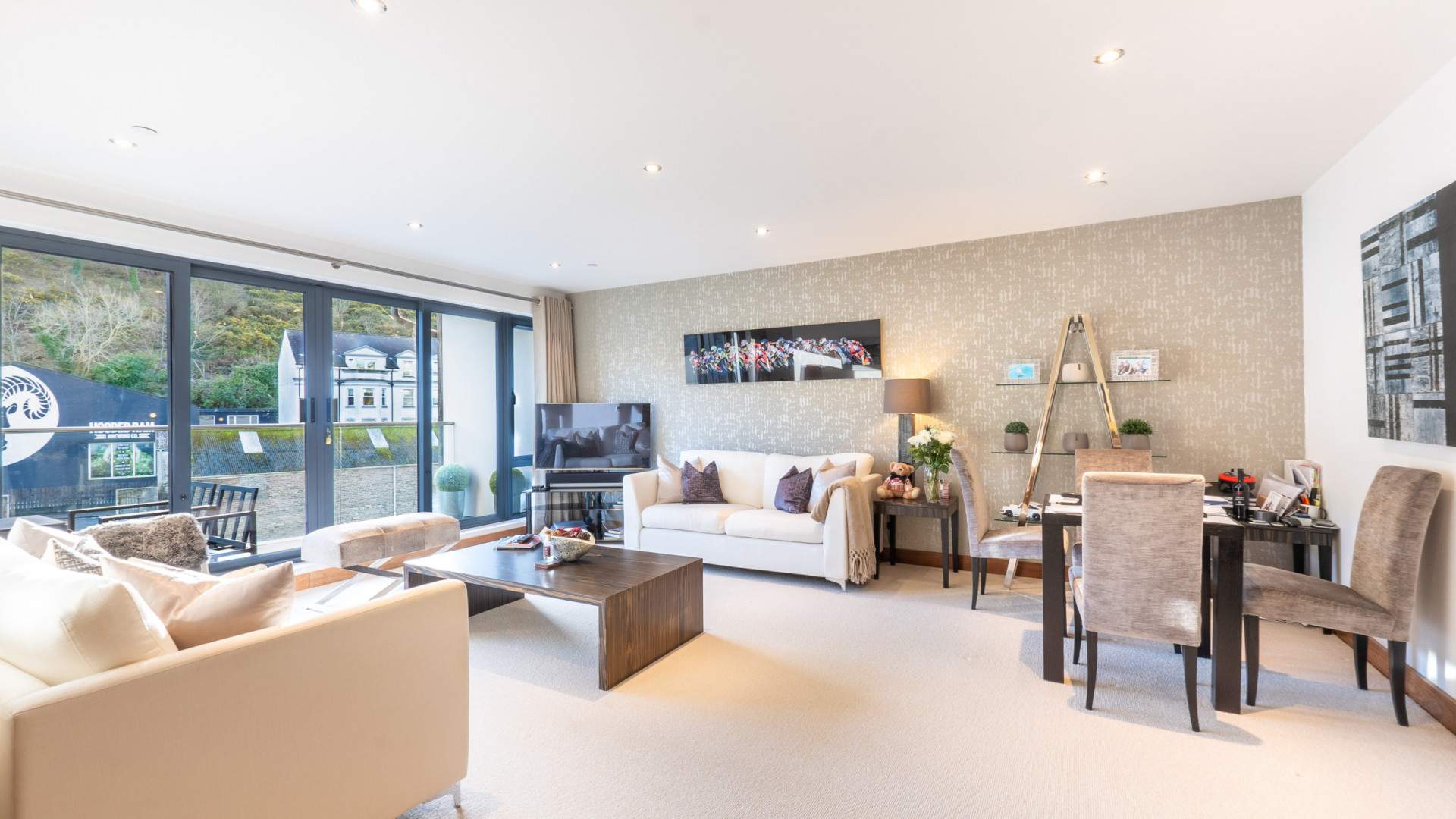 Modern Second Floor Executive 2 Bed Apartment. Convenient Location in the Heart of Douglas’ Town Centre Within Walking Distance of All Local Shops & Restaurants. Large Private South Facing Balcony Providing Views Over The River Douglas. Large 355sq/ft Garage.