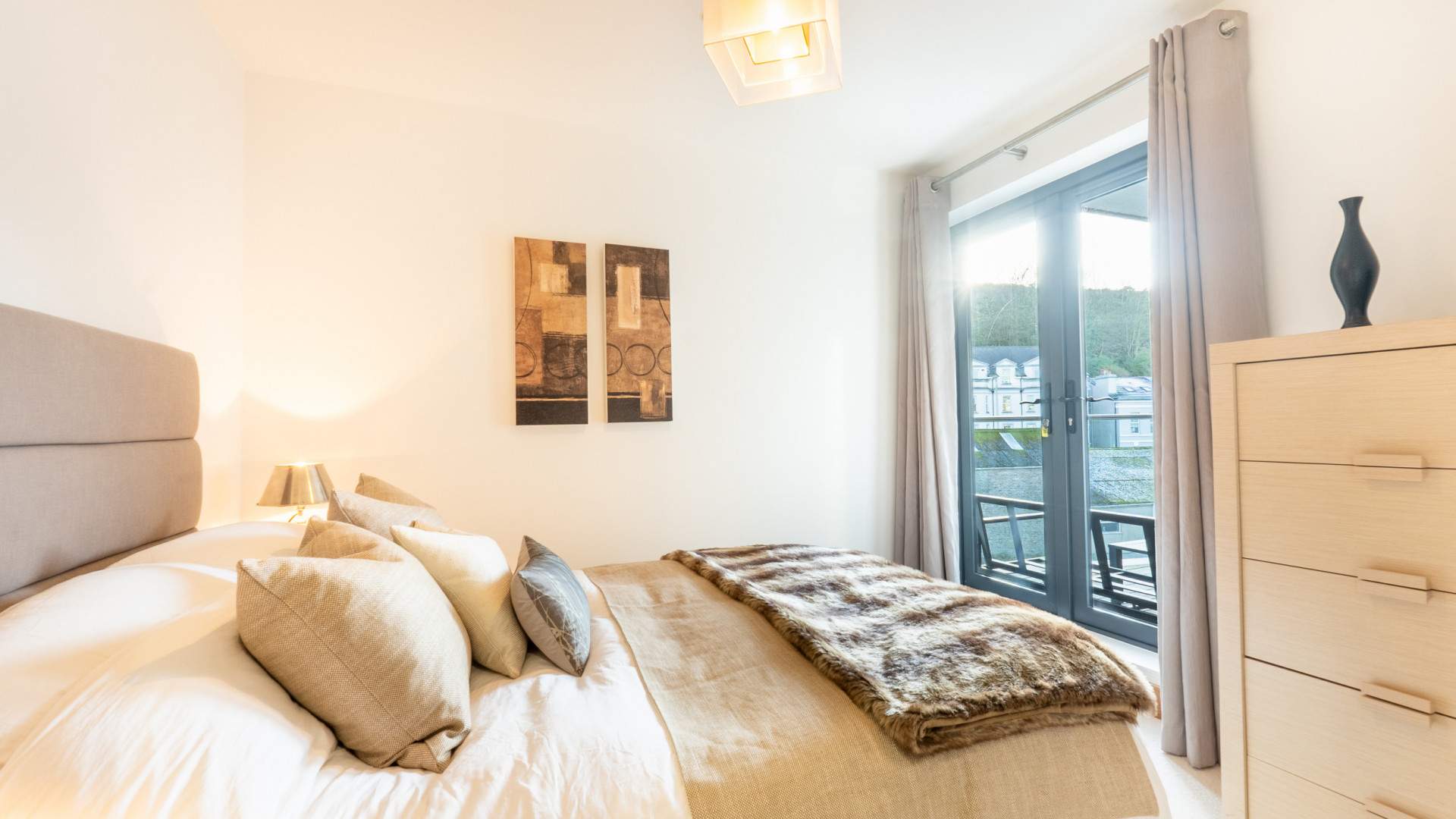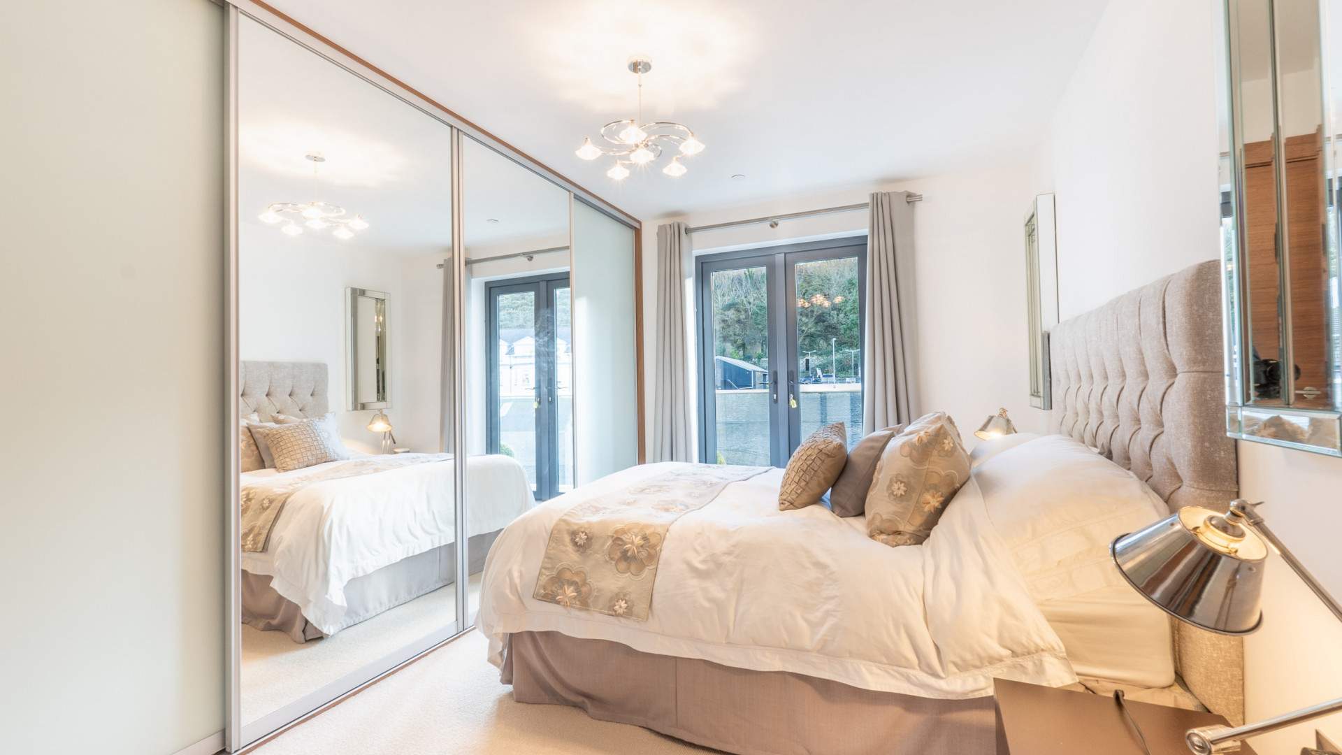 Built-in wardrobes with mirrored sliding doors. Double glazed double doors open onto the balcony and overlook the river.