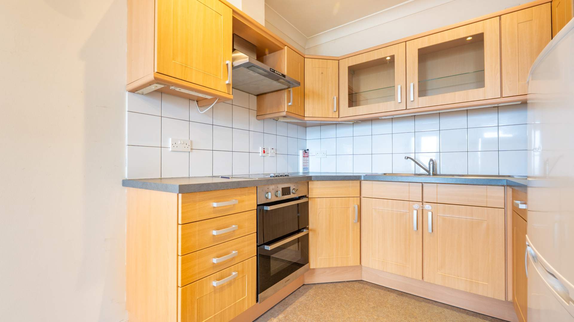 Fitted with a range of base, wall and drawer units. Work surfaces incorporate a stainless steel one and a half bowl sink with a mixer tap over and drainer. Tiled splashbacks. Indesit electric double oven/grill. Siemens four ring halogen hob with a Neff extractor hood above. Fridge/freezer, included in the sale.