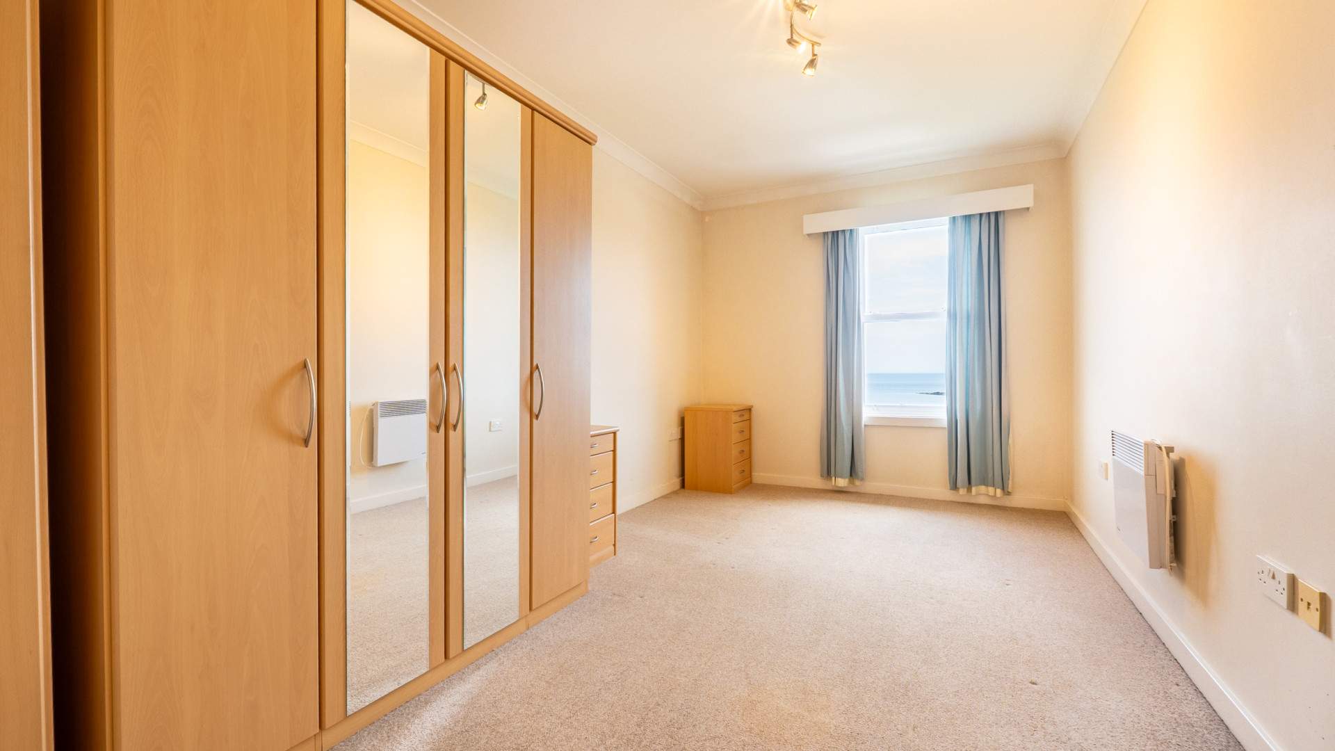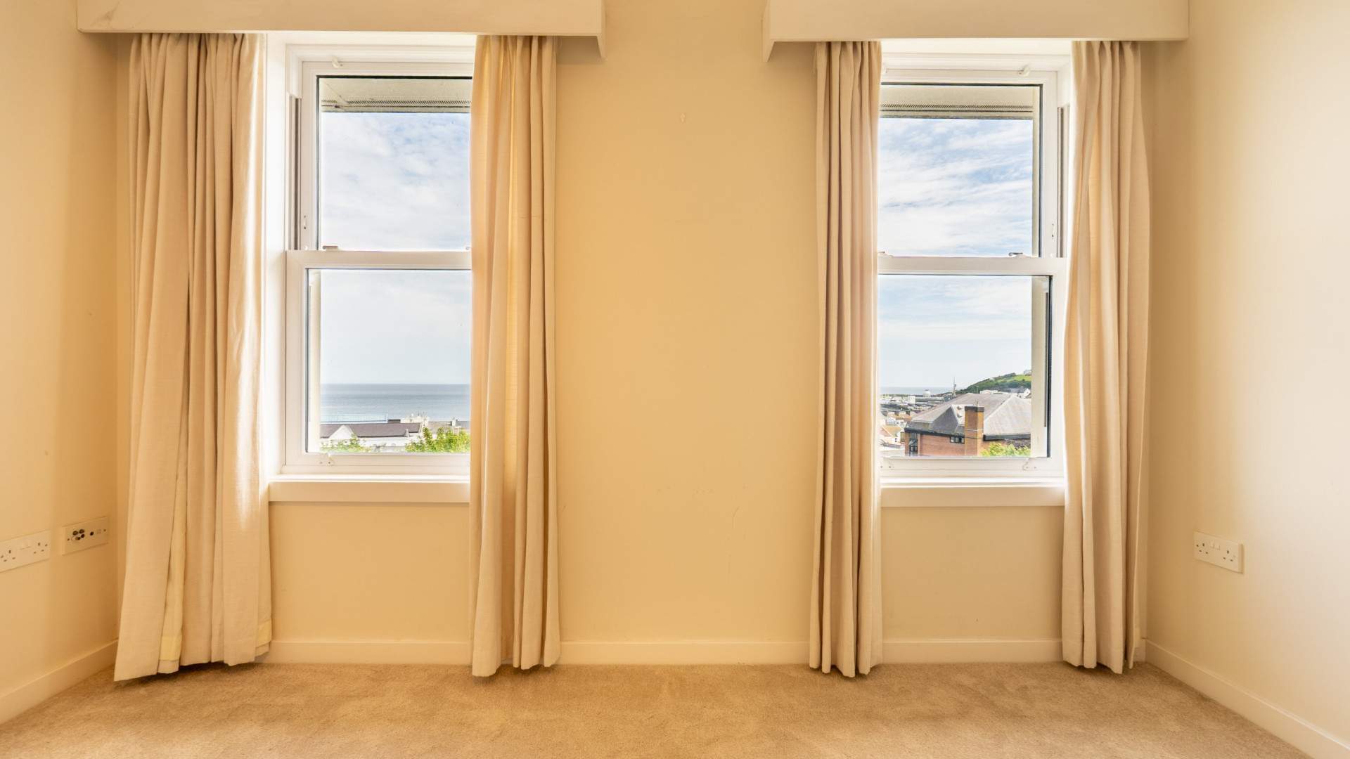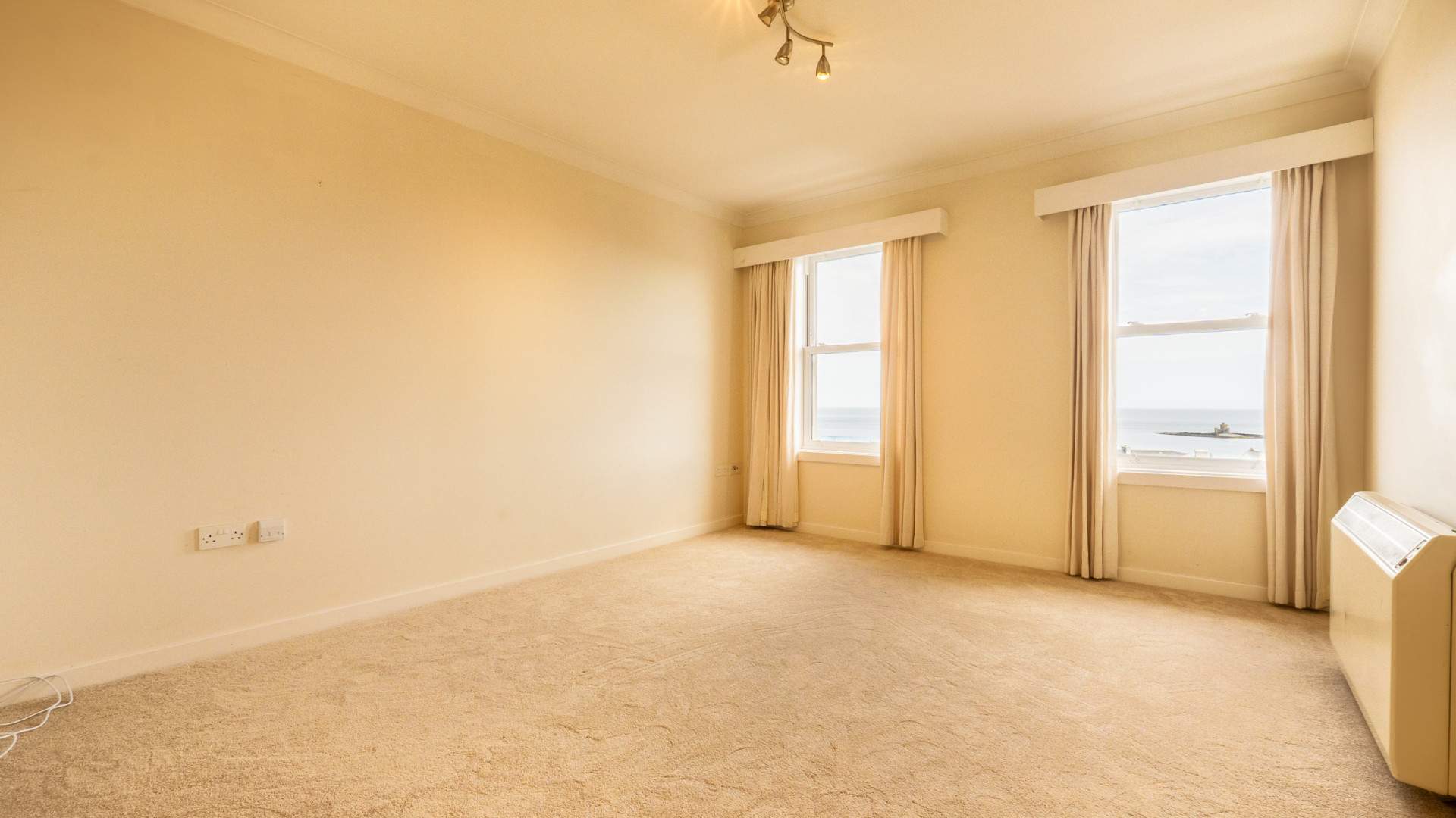 uPVC double glazed sash window providing panoramic coastal and sea views from Onchan Head to Douglas Head. Wall-mounted heater.