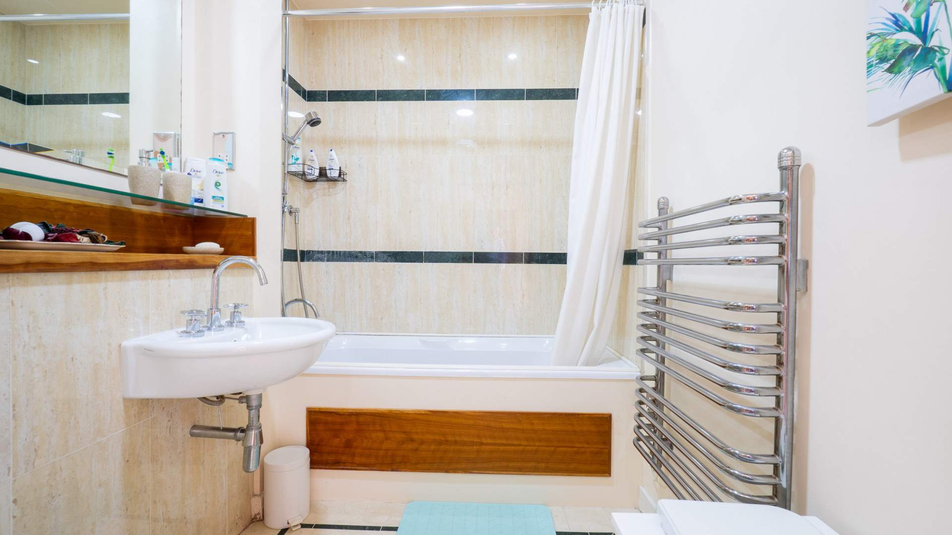 Fitted with a white three piece suite comprising of a panel bath tub with a shower attachment over and tiled surround, wall mounted wash hand basin and W.C. Wall mounted chrome heated ladder towel rail. Wall mounted mirror with glass shelf and fitted wooden shelf below. Ceiling downlighters. Part tiled walls. Tiled flooring.