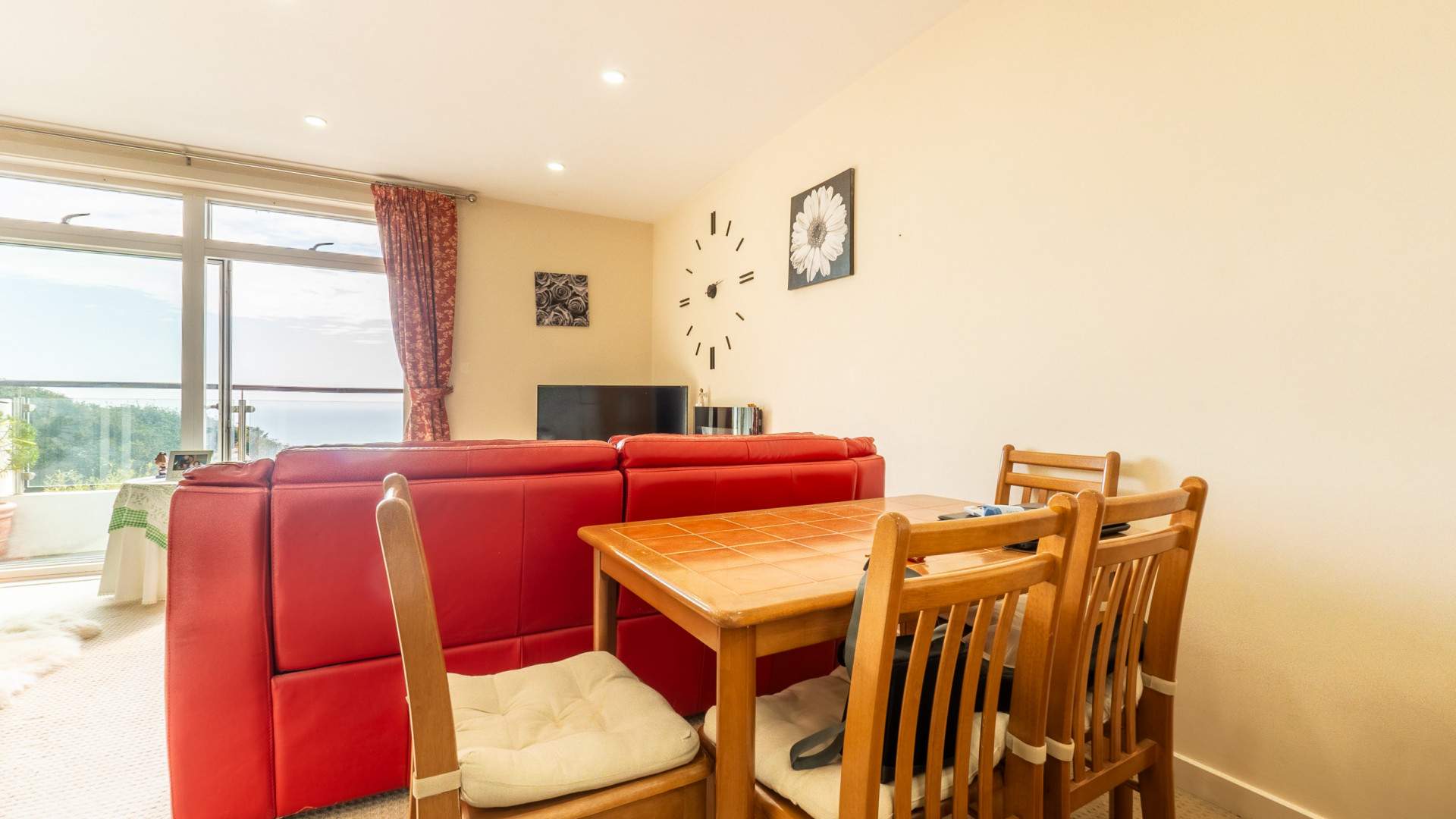 Great size room providing ample space for a sofa, dining table and a bed/sofa bed. Door leading into the kitchen. Ceiling downlighters. Carpeted flooring. Set of uPVC double glazed sliding doors with uPVC double glazed windows above, providing access out onto: