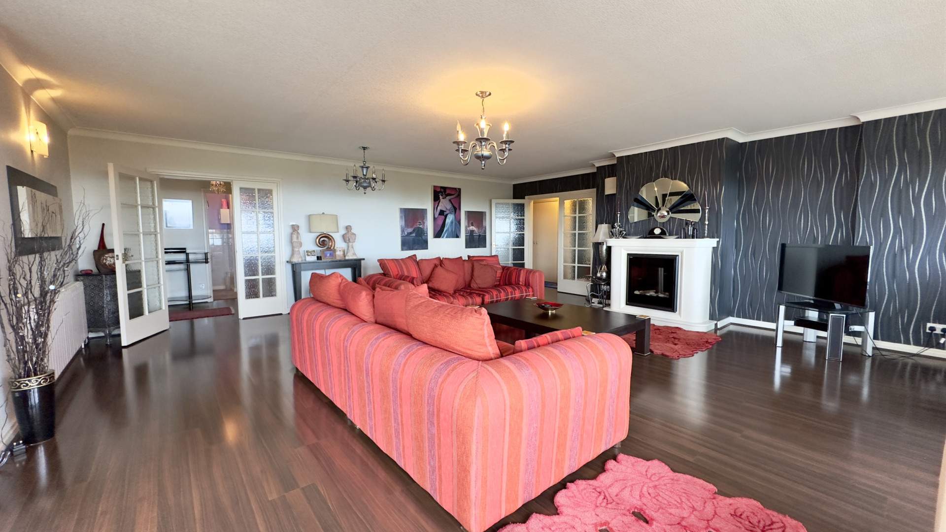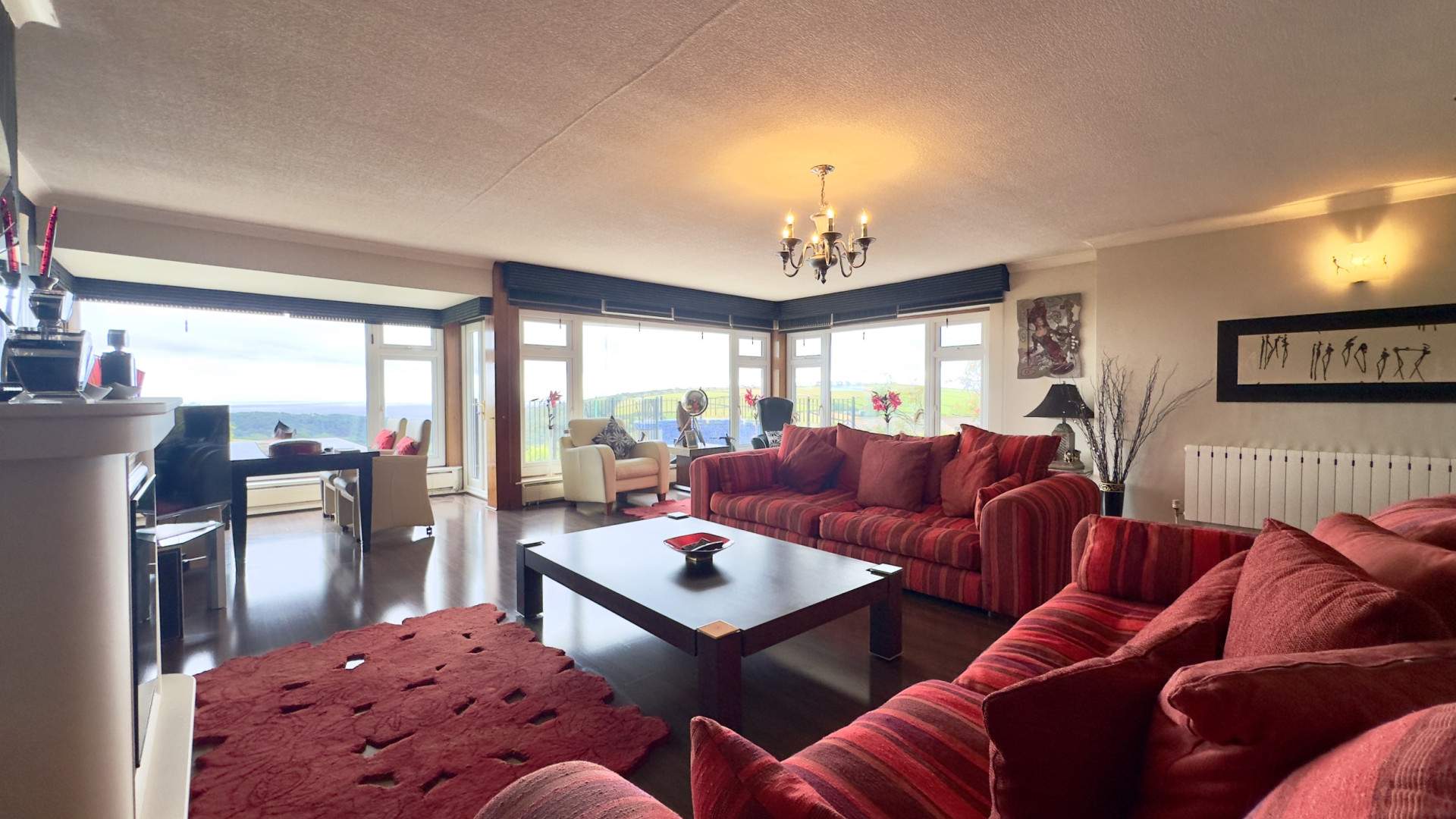 Spacious lounge with three large uPVC windows providing fantastic views of the front aspect and out to sea. There is a set of uPVC double glazed doors providing access to the tiled balcony which wraps around the lounge and to the front door of the property. A large electric fire is the main feature in the lounge, near to the fire are a set of double doors with frosted windows which provides access to a further hallway which leads to the 2 bedrooms and bathroom. The lounge is finished with wall and ceiling lights, with the flooring finished with a wood effect vinyl throughout.
