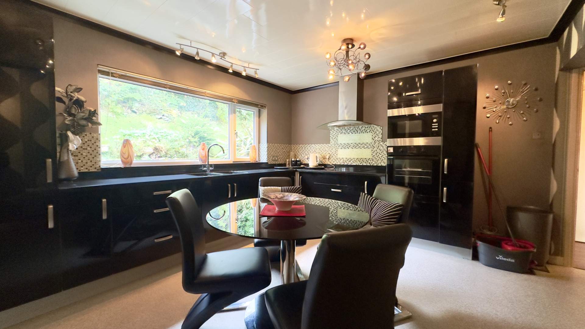 Located at the rear of the property with black gloss effect cupboards and charcoal effect work top. The integrated fridge freezer is positioned near to the uPVC double glazed door accessing the rear aspect. There are two sinks with drainer positioned under the uPVC double glazed window, along with an Electrolux integrated dishwasher. Along the wall to the right of the sink are further units with a four-ring induction hob and extractor above. To the right of the hob is an integrated AEG oven and a separate AEG microwave. The rear of the property can be accessed through a uPVC double glazed door with a frosted window, next to the door is a storage cupboard.