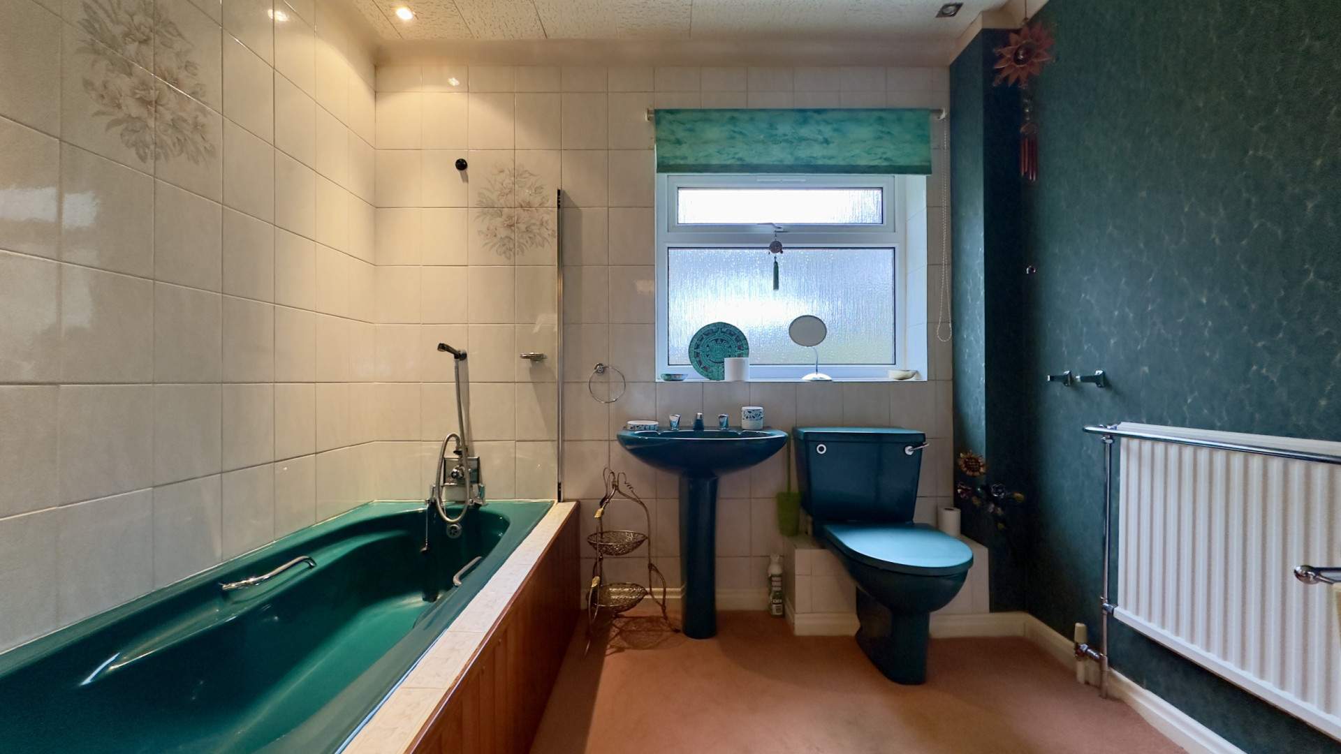 A large bathroom located in the hallway between the two bedrooms; there is a green 3-piece suite comprising of a bath with shower attachment. The pedestal sink and toilet are positioned beneath the uPVC double glazed frosted window looking on to the side aspect. There is a further sink with storage below and a wall mounted mirror above with two lights located behind the door. The bathroom is finished with a ceiling light and carpeted flooring.