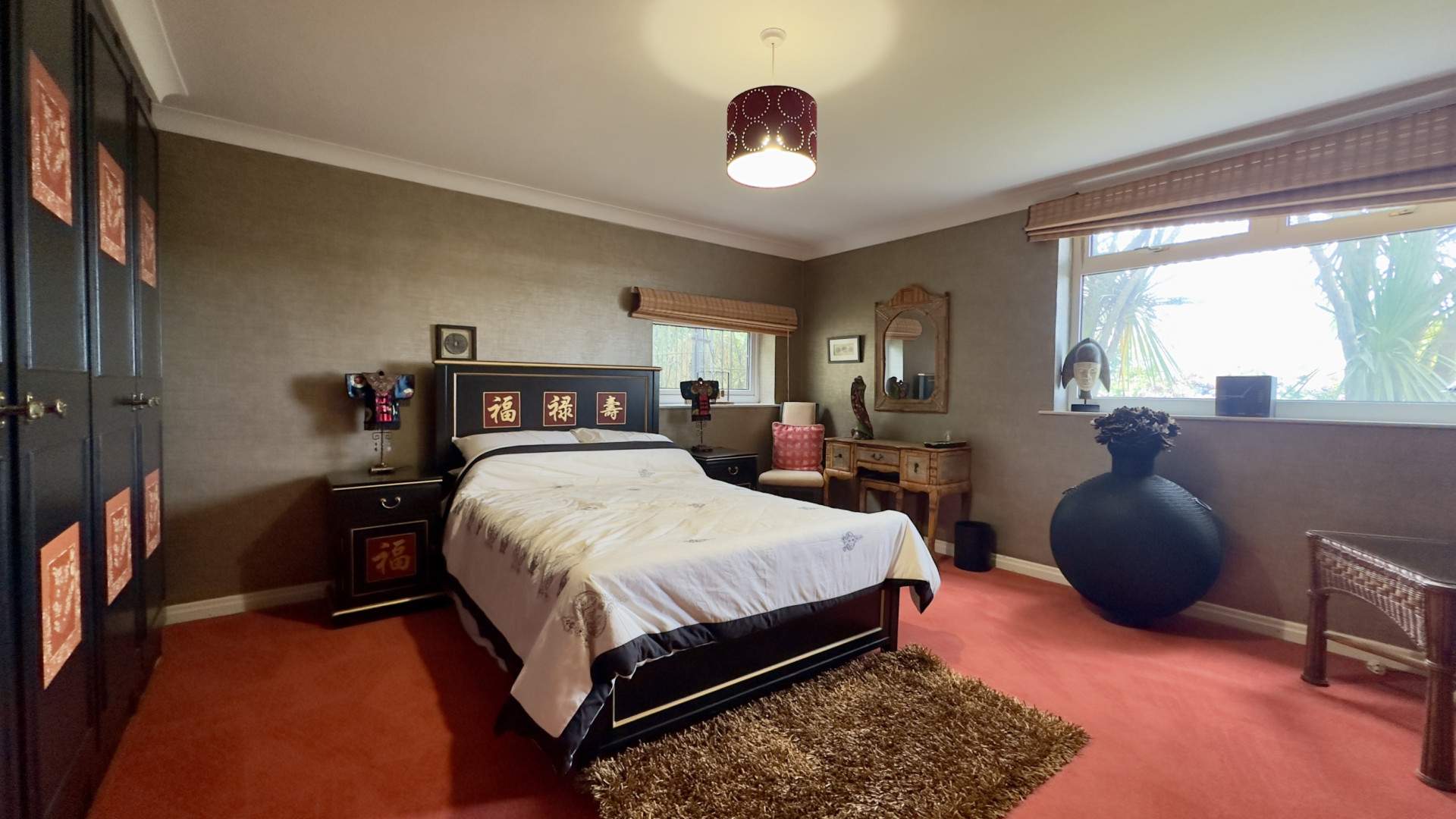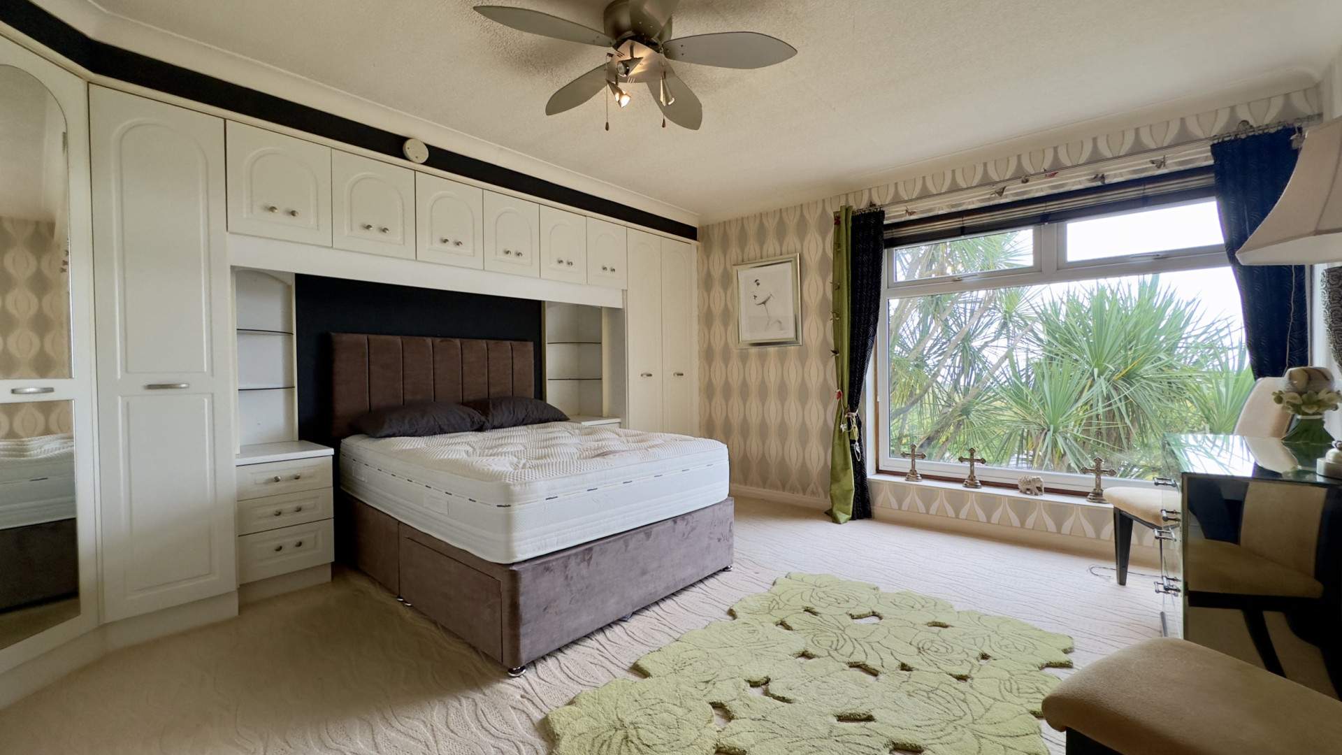 A large bright double bedroom at the front of the property with views of the front aspect and out to sea. To your left when entering the bedroom are built in wardrobes which provide further storage above the bed. There are four double cupboards with a mixture of hanging and shelving space. Either side of the bed are bed side tables with 2 glass corner shelves and a fluorescent light under the overhead cupboards. The bedroom is finished with a ceiling light and carpeted flooring throughout.