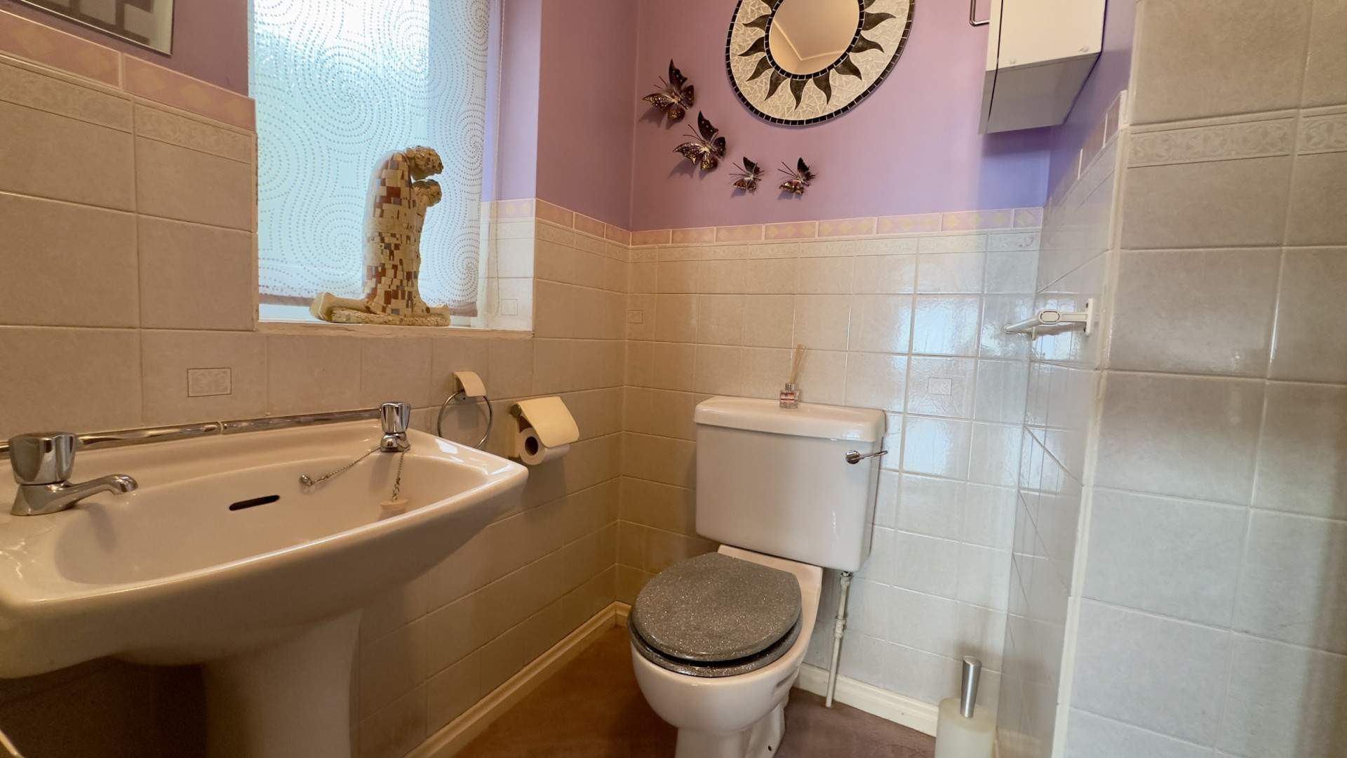 Comprising of a white pedestal sink positioned under the uPVC double glazed window, WC ahead of you with a wall mounted cupboard to the right. There is a shower cubicle positioned behind the door with an extractor fan above. The bathroom is finished with a ceiling light and carpeted flooring throughout.