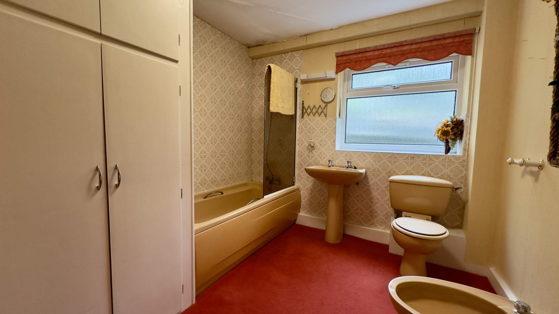 A spacious bathroom with a four-piece suite comprising of a bath with shower attachment and glass shower screen. Positioned under the uPVC double glazed frosted window is the pedestal sink and WC. The bidet is to your right next to the radiator behind the door. The bathroom has a double storage cupboard to your left and the bathroom is finished with a ceiling light and carpeted flooring.