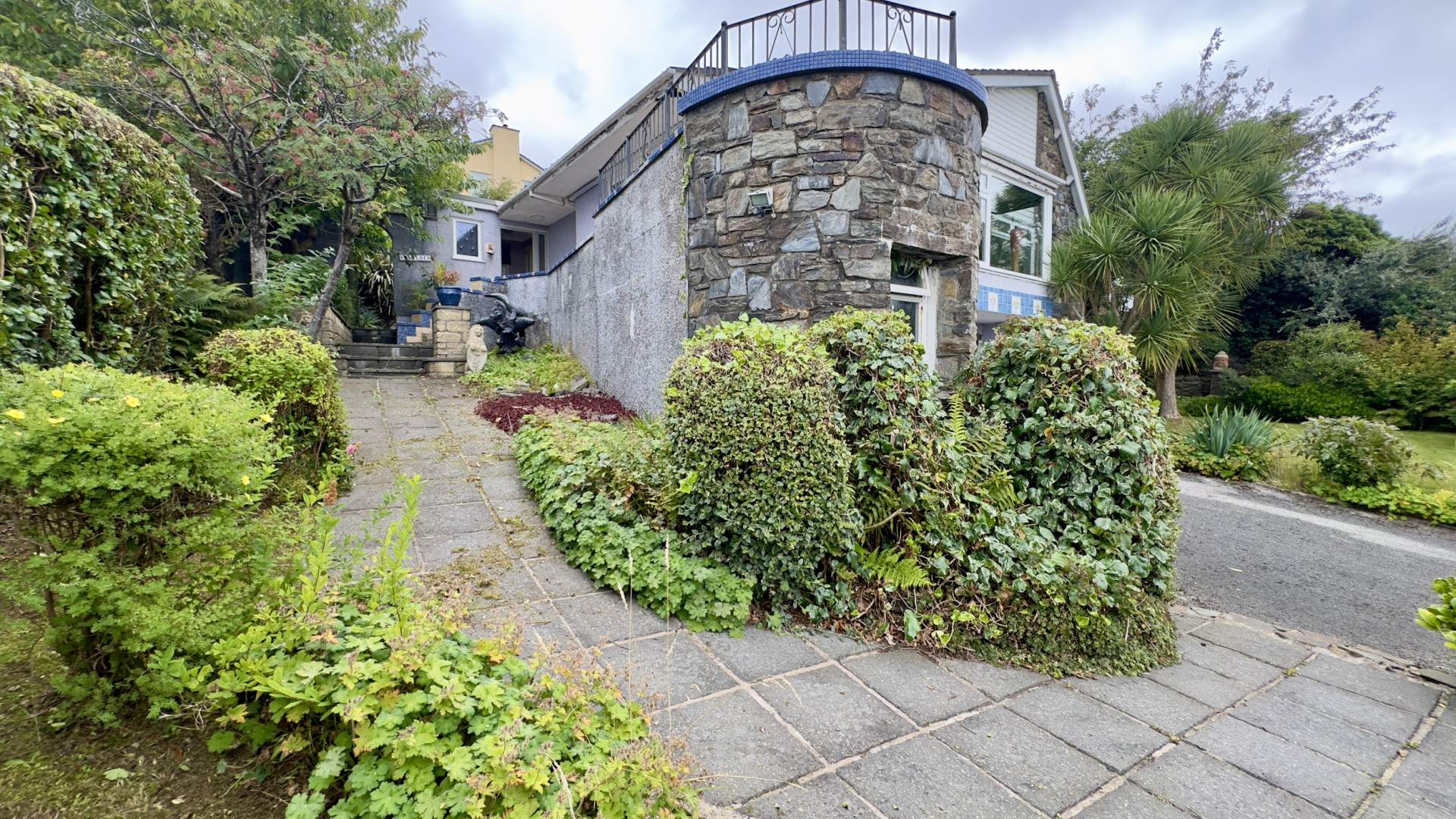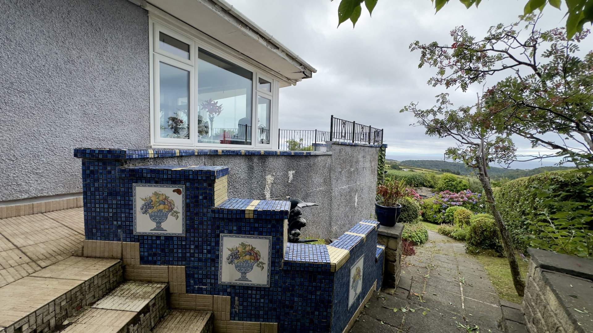 To the left of the property the boundary is a mixture of hedging, footpaths, leading to the front door. There is a blend of flower beds, pond and a stone wall to your right which is the terrace leading from the front door to the longer. The terrace has tiled walls and flooring.
