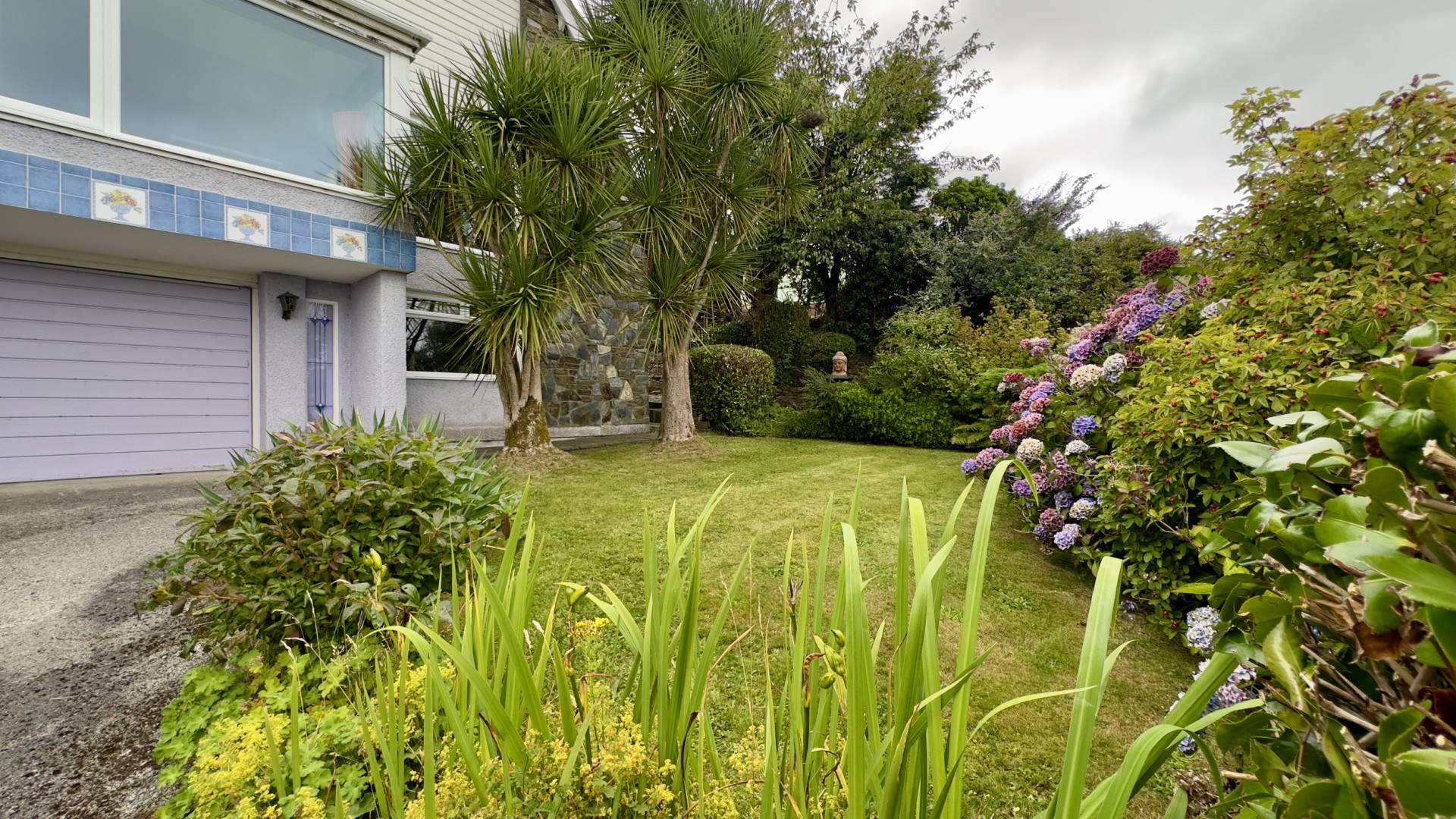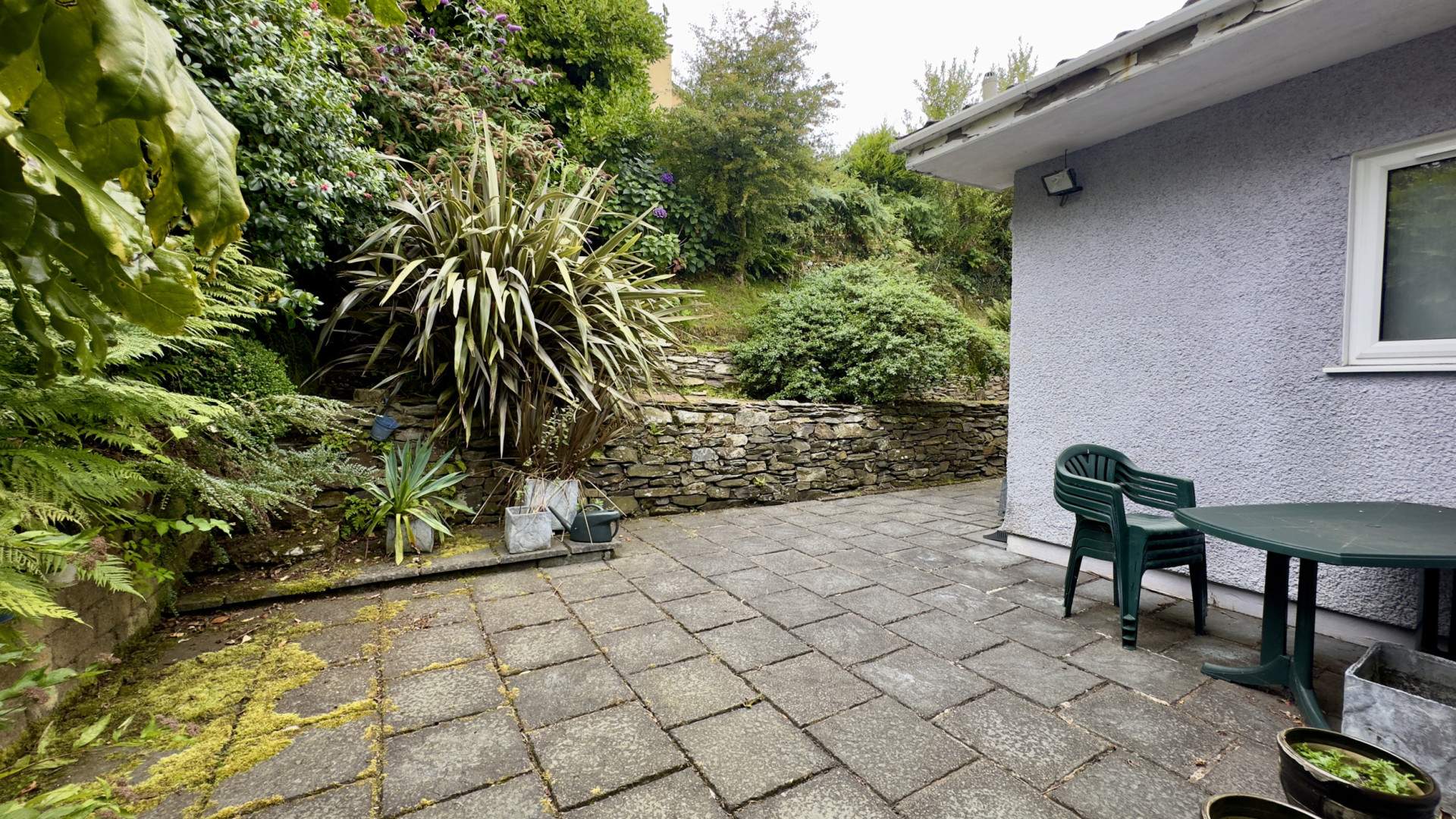 To the right the garden is patio with a stone wall defining the boundary and raised garden beds.