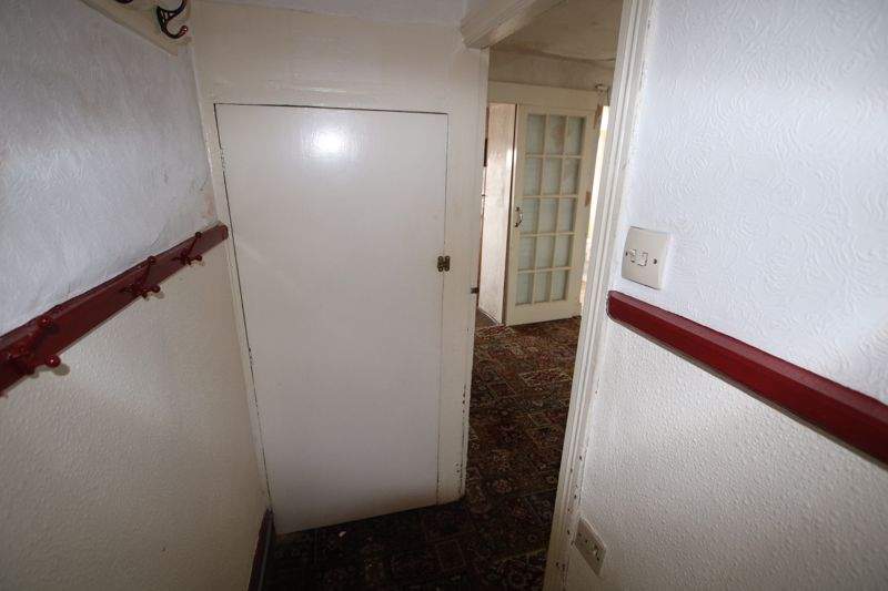 Front aspect. Built-in cupboards, shelving. Double sliding doors to: