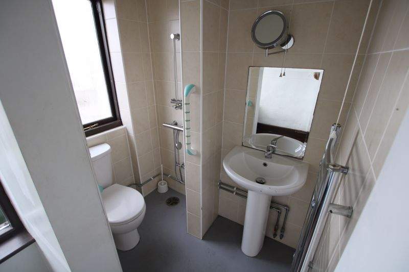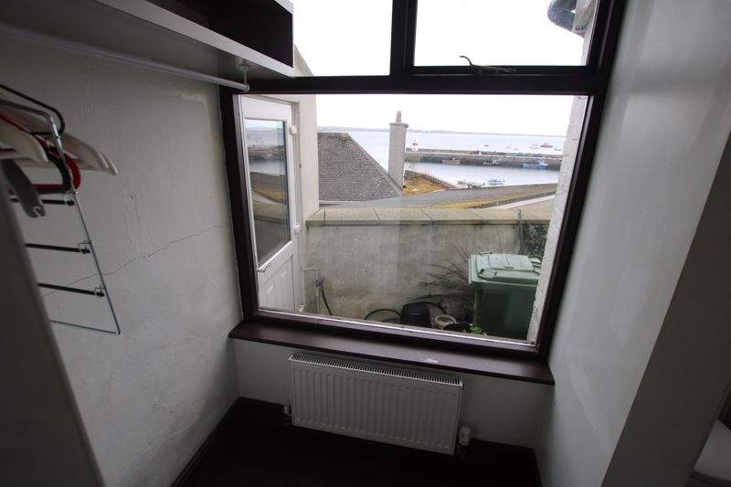 Hanging space for coats, opening to w.c., shower, wash hand basin, chrome ladder style towel rail, tiled walls. Sea and harbour views.