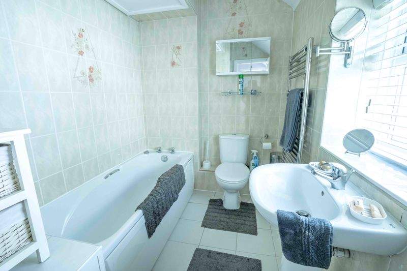 White suite comprising panelled bath, shower cubicle, w.c., wash hand basin, chrome ladder style heated towel rail.