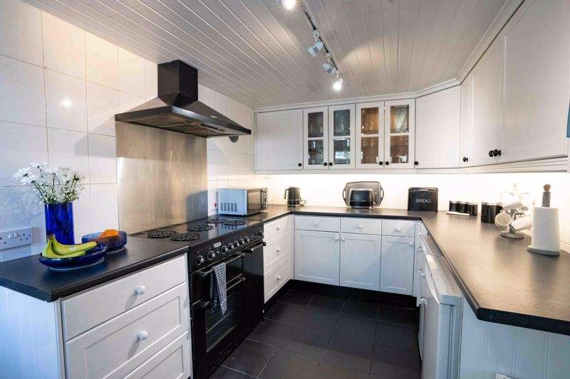 Well fitted kitchen with good range of quality white wall and base units with contrasting worktops incorporating range-style cooker with 5 ring hob, cooker hood, white sink unit, plumbing for washing machine. Tiled splashbacks and tiled floor. Half-glazed door to: