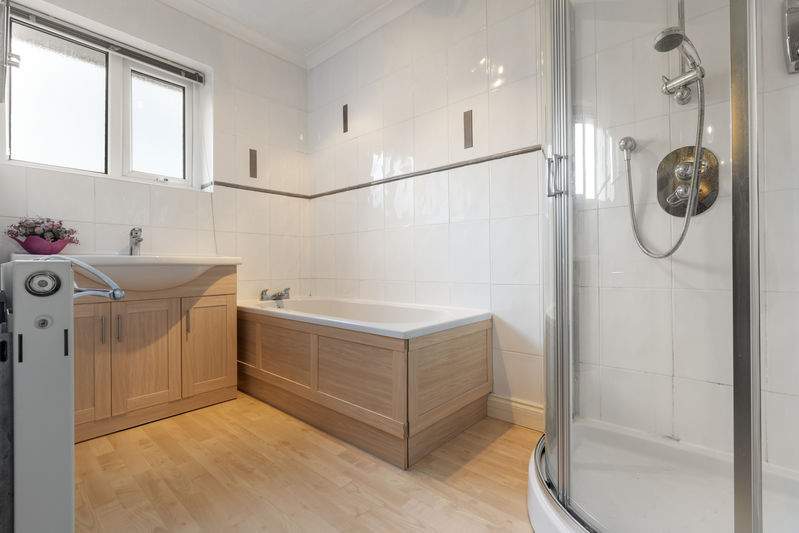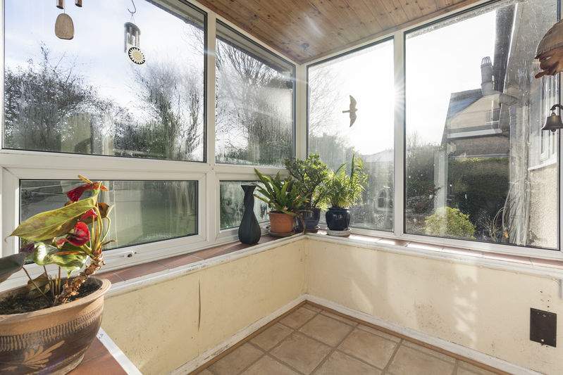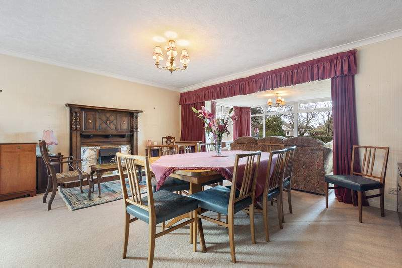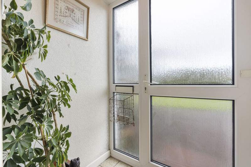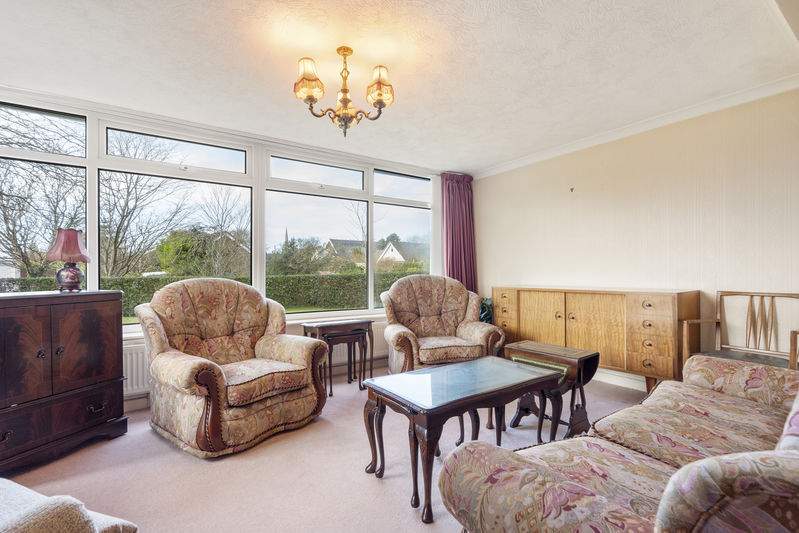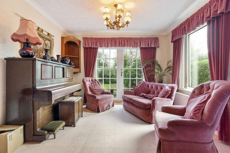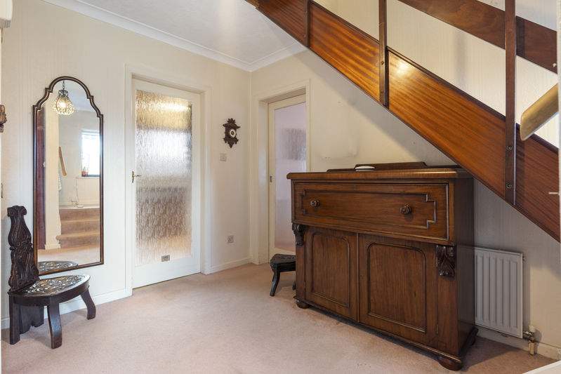 Brick paved driveway with parking for several vehicles. Lawn to front with hedge boundary. Paved patio to rear. Mature planting to boundary.