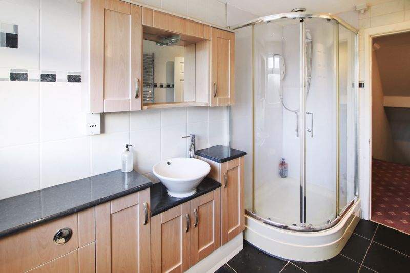 Modern suite comprising w.c., round wash hand basin in vanity unit, corner shower cubicle, chrome ladder style heated towel rail. Fully tiled walls and tiled floor. Spotlights.