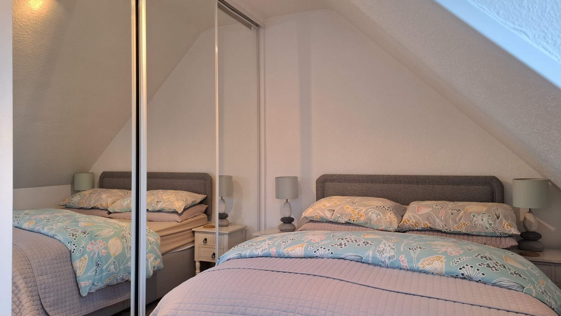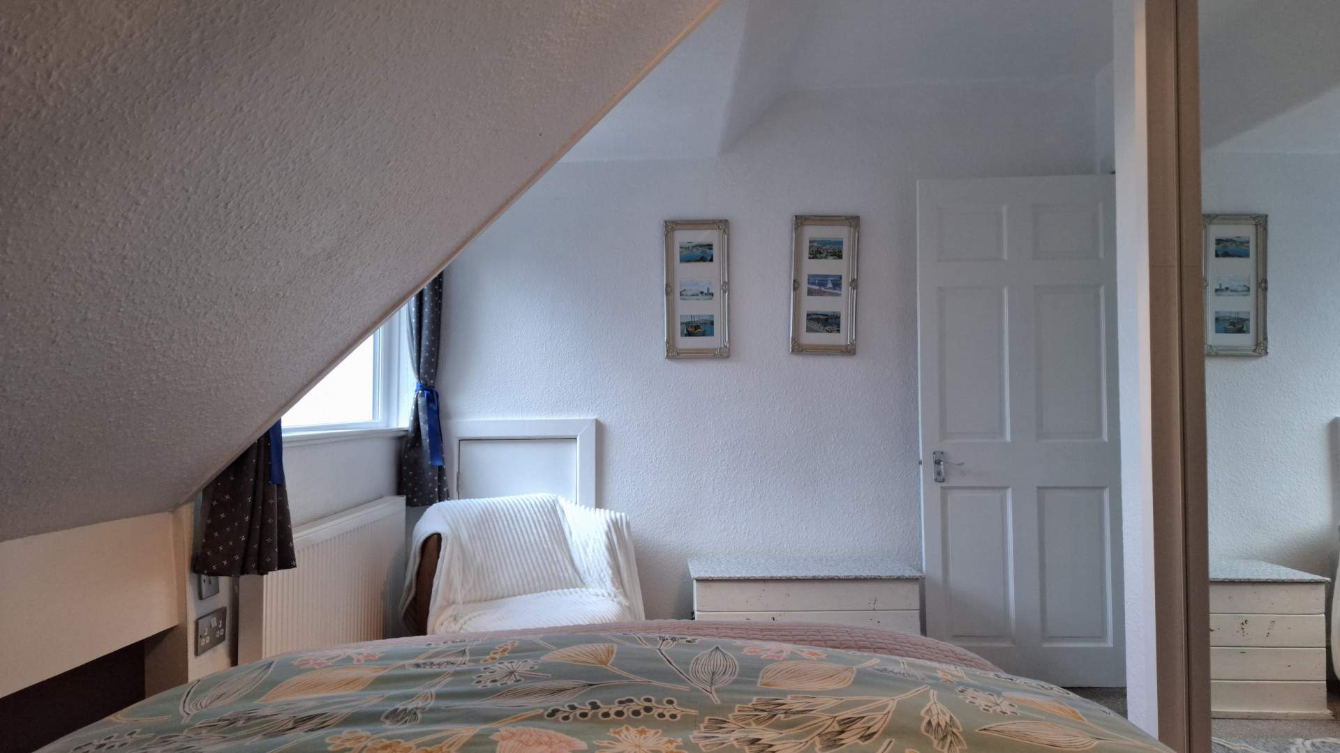 A further double bedroom on the left of the landing with a uPVC double glazed window providing views across Ramsey. There is a built-in triple wardrobe with mirrored doors on your left when entering the room. The bedroom has a ceiling light and carpeted flooring throughout.