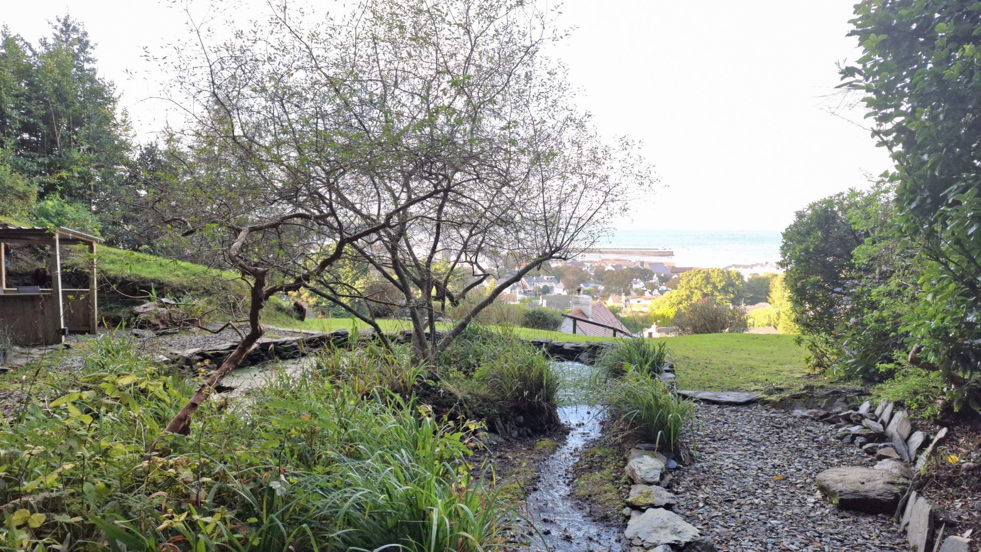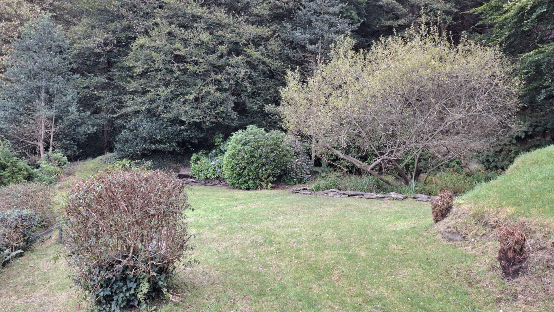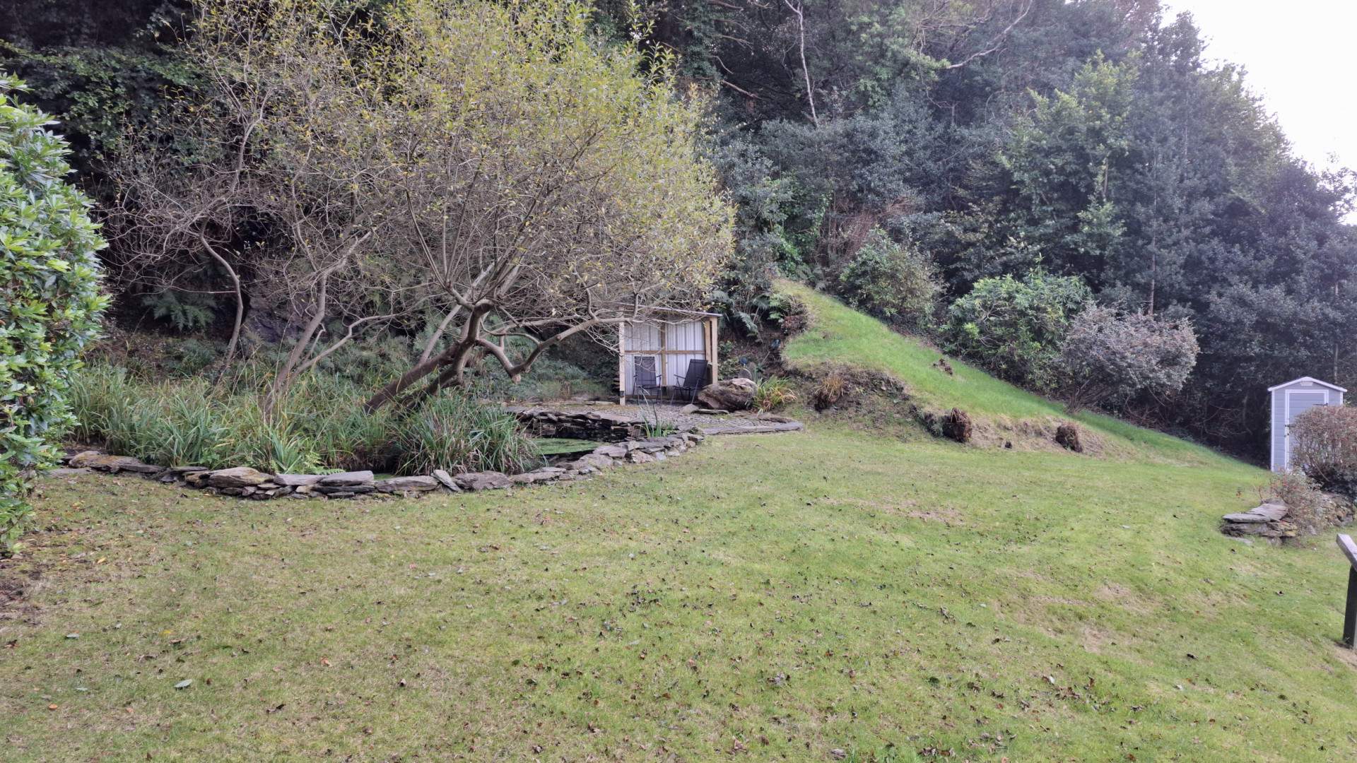 To the side of the property the gardens are tiered areas of garden with various seating areas and lawns meandering up the hill side and past the house. When reaching the top of the garden you have a wonderful lawn area with a pond and fantastic views over the top of the property and across the north and out to sea. The boundary is woodland to all sides at the top with a steep incline in the hillside behind the pond area.