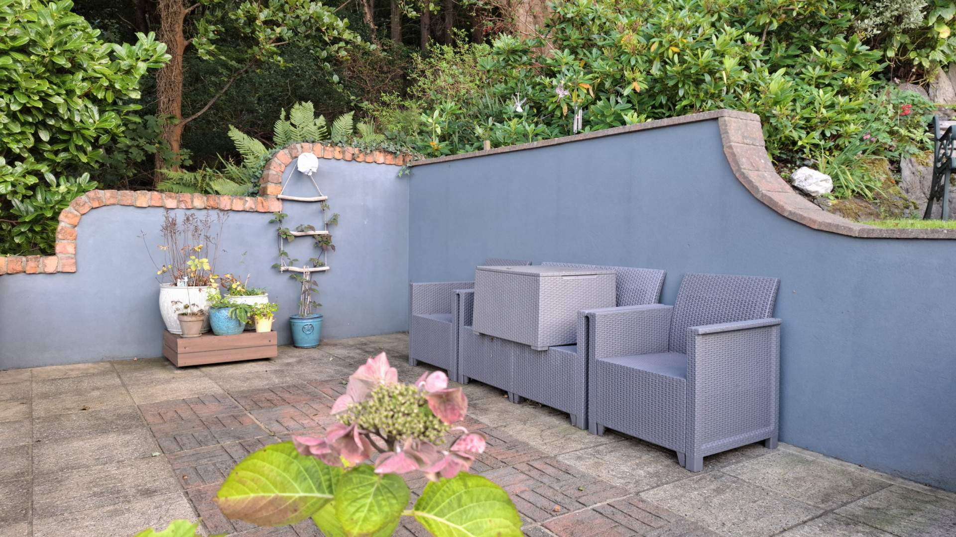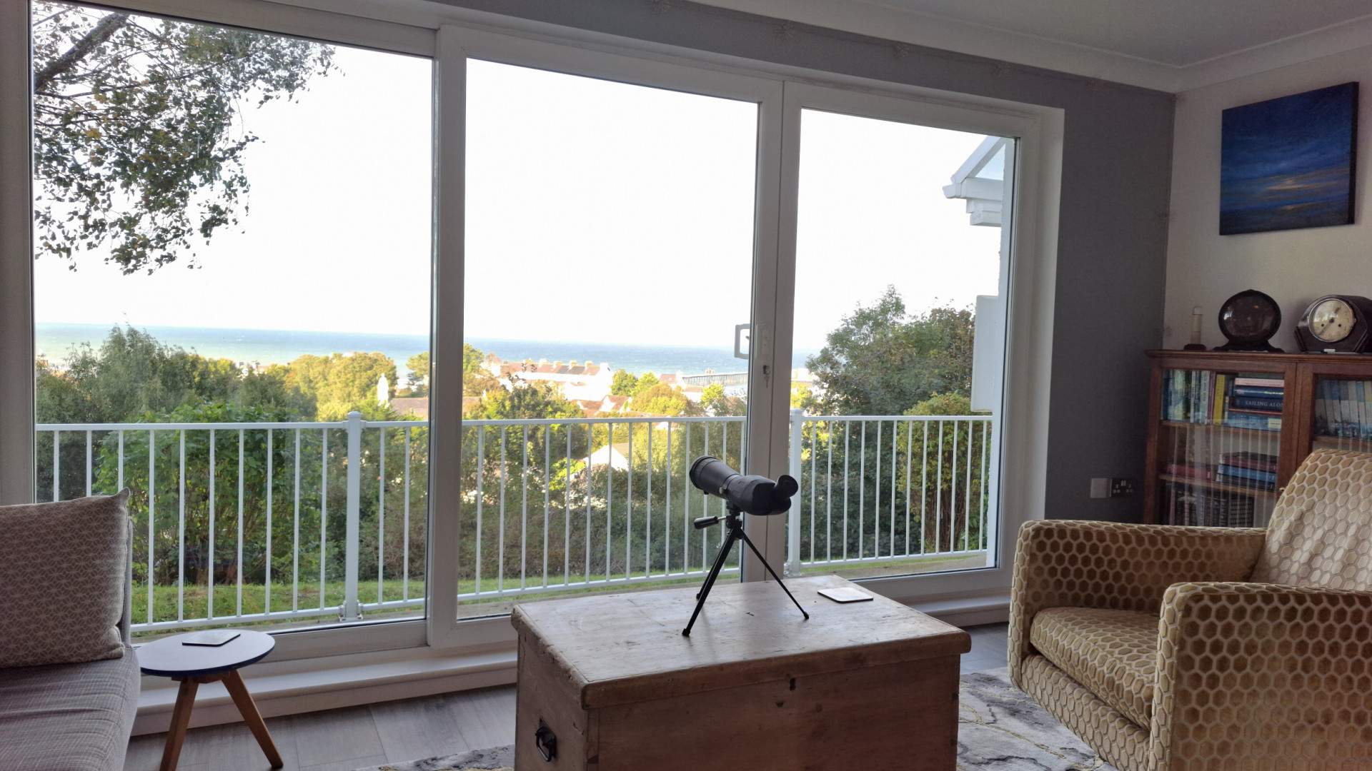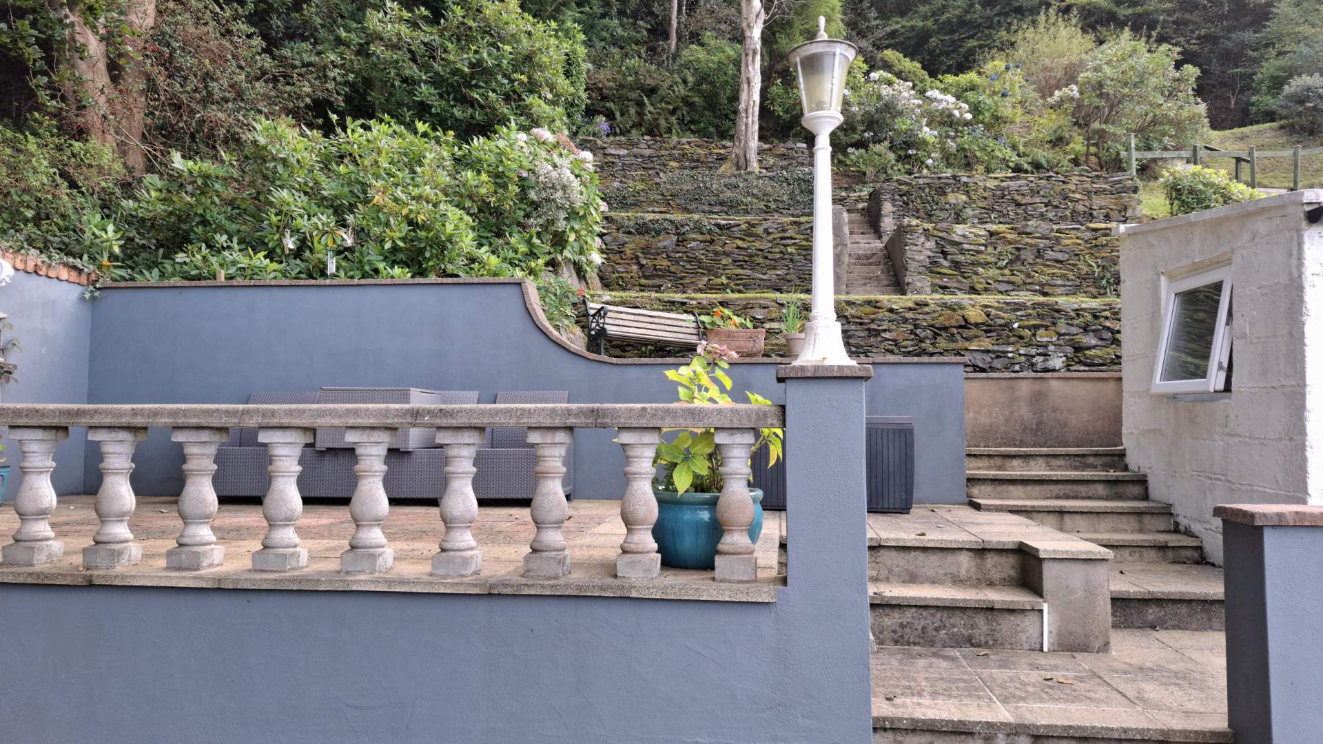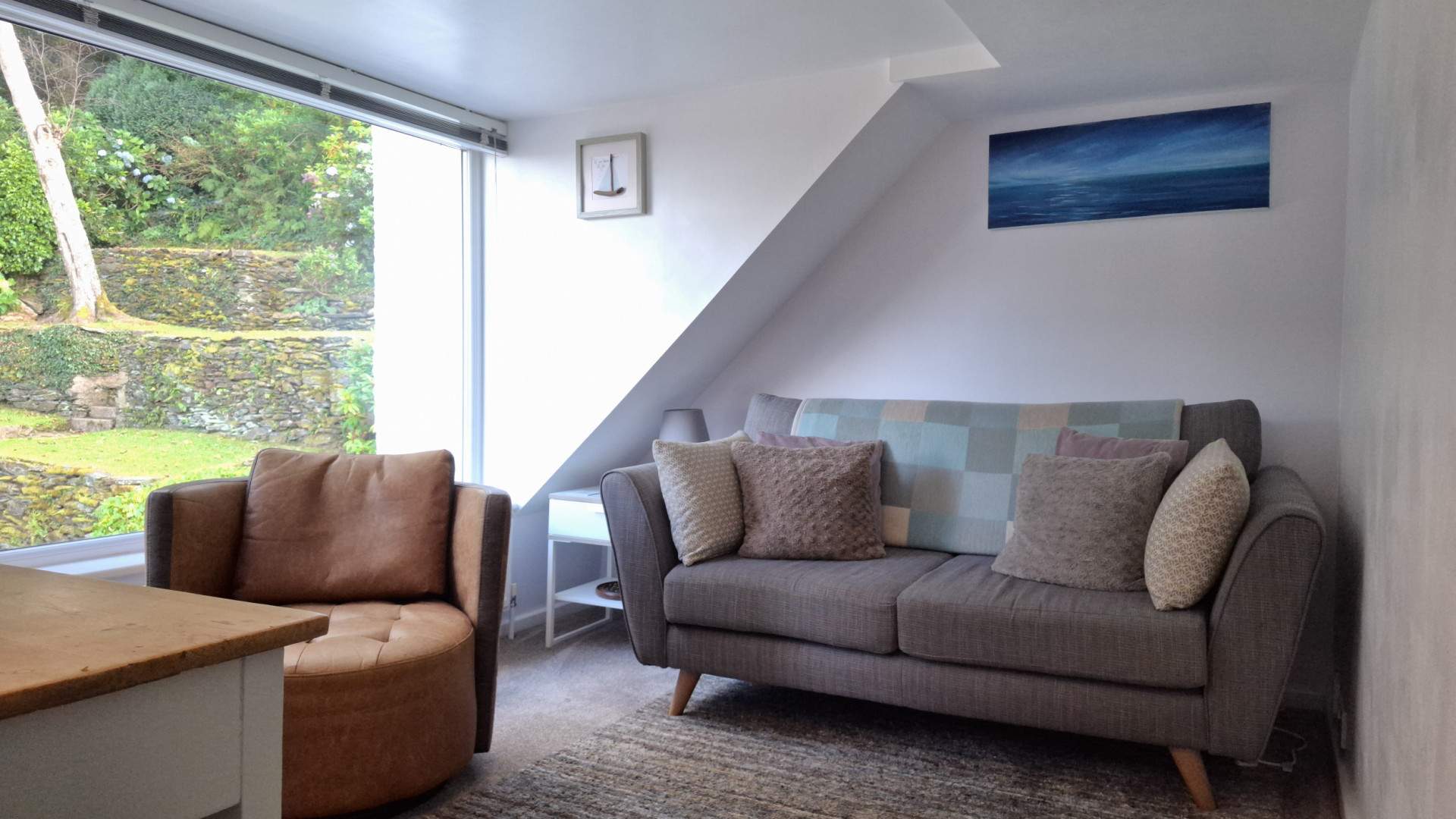 To the side of the property the gardens are tiered areas of garden with various seating areas and lawns meandering up the hill side and past the house. When reaching the top of the garden you have a wonderful lawn area with a pond and fantastic views over the top of the property and across the north and out to sea. The boundary is woodland to all sides at the top with a steep incline in the hillside behind the pond area.