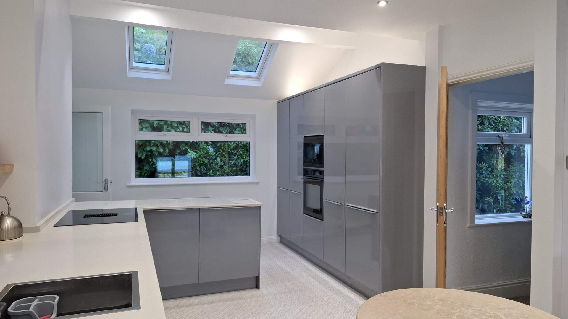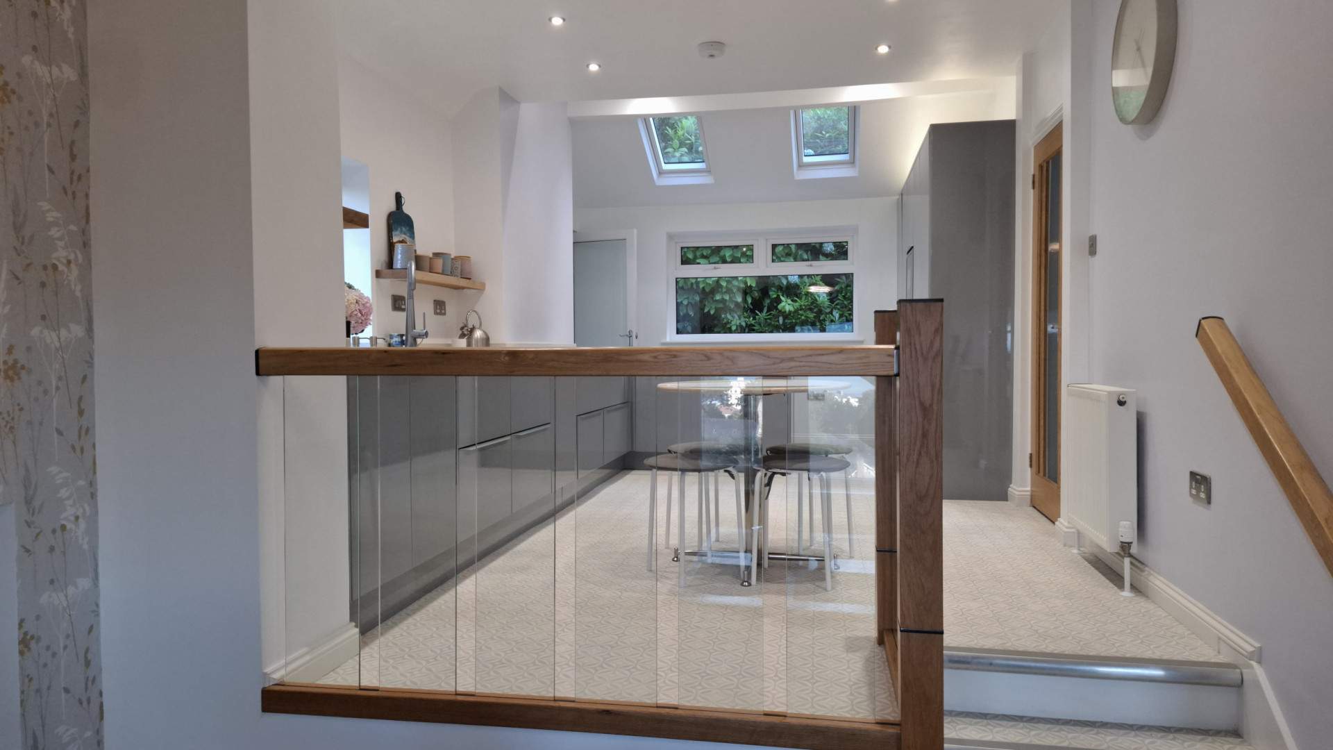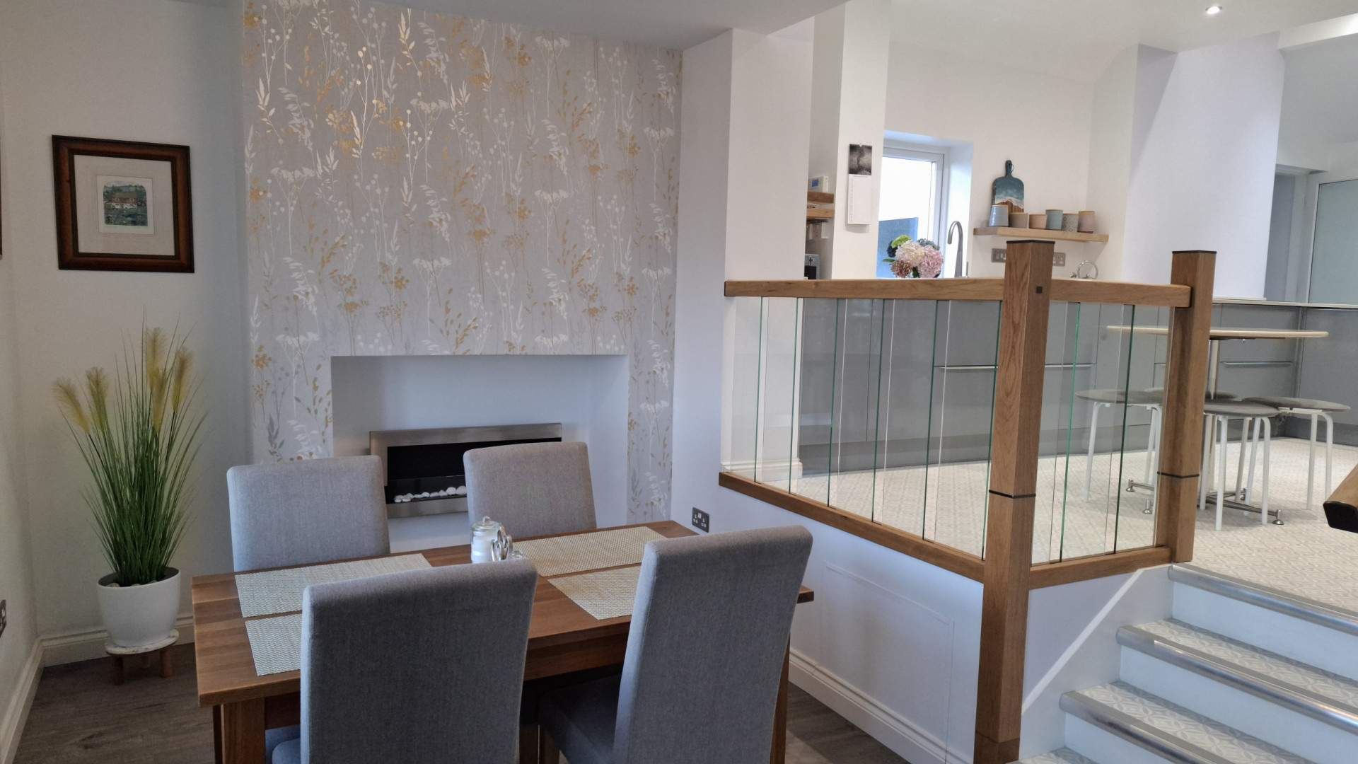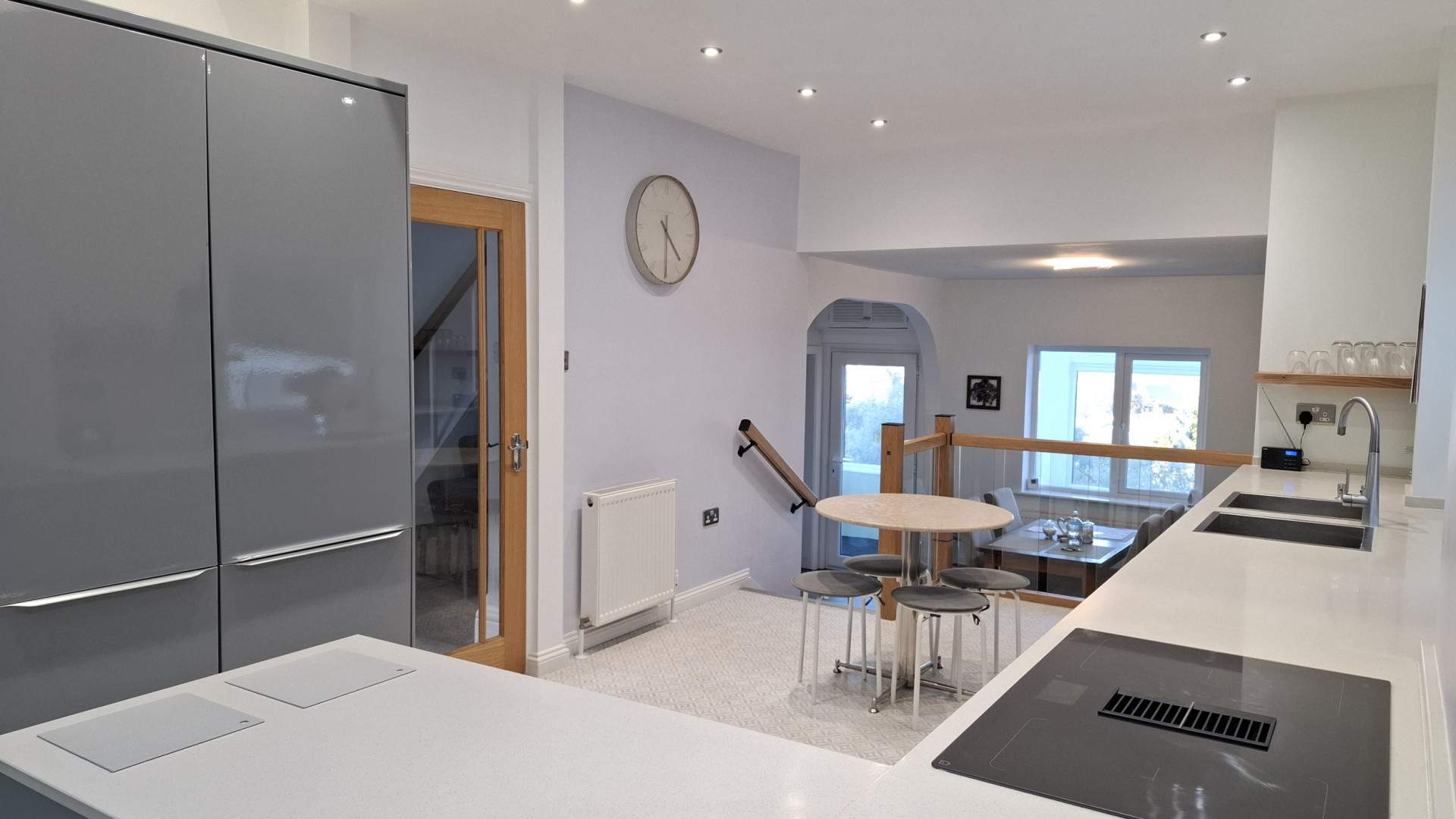 A spacious bright split-level room with the dining area in front of you when entering the property. Ahead of you is a deep under stairs storage cupboard. To your left is a closed off chimney with a wall mounted biofuel fire. Walking up three steps with a glass balustrade into the spacious kitchen area. On your left are floor mounted cupboards with two Cooke & Lewis stainless steel sinks with a mixer tap. To the left of the sink are two small taps which provide hand wash and dish washing liquid. Behind the sink is a uPVC double glazed window looking on to the side aspect. There is a 4 ring induction hob with extractor fan built in. On the opposite side of the kitchen is a mixture of tall storage cupboards and integrated fridge freezer. There is a fan assisted oven with microwave above. Above this part of the kitchen are two velux windows and a further uPVC double glazed window looking on to the rear aspect. There are multiple recessed ceiling lights throughout, the flooring in the kitchen area is finished with linoleum flooring. The dining area is finished with vinyl flooring.