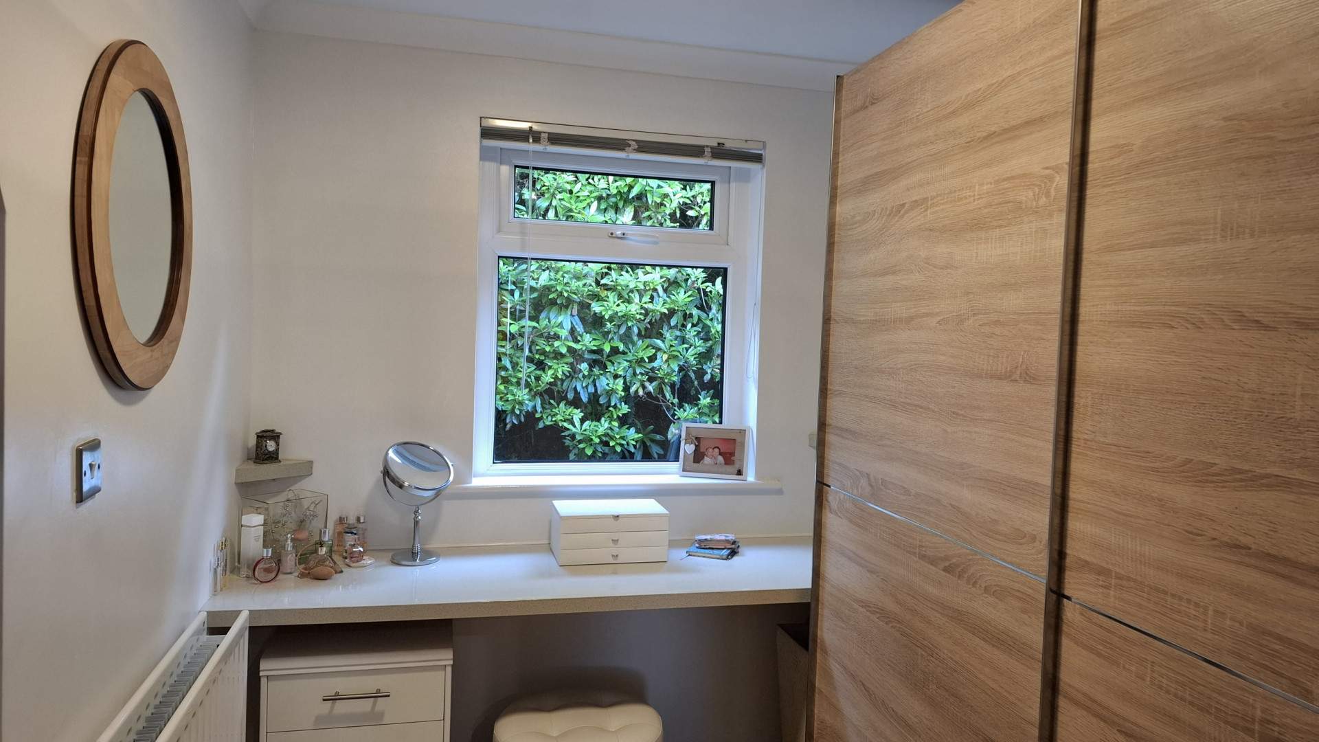 A uPVC double glazed window provides views on to the rear aspect. There is a double wardrobe with sliding doors for storage and a countertop positioned under the window used as a dressing table. A wooden door with a glass pane leads into the ensuite bathroom.