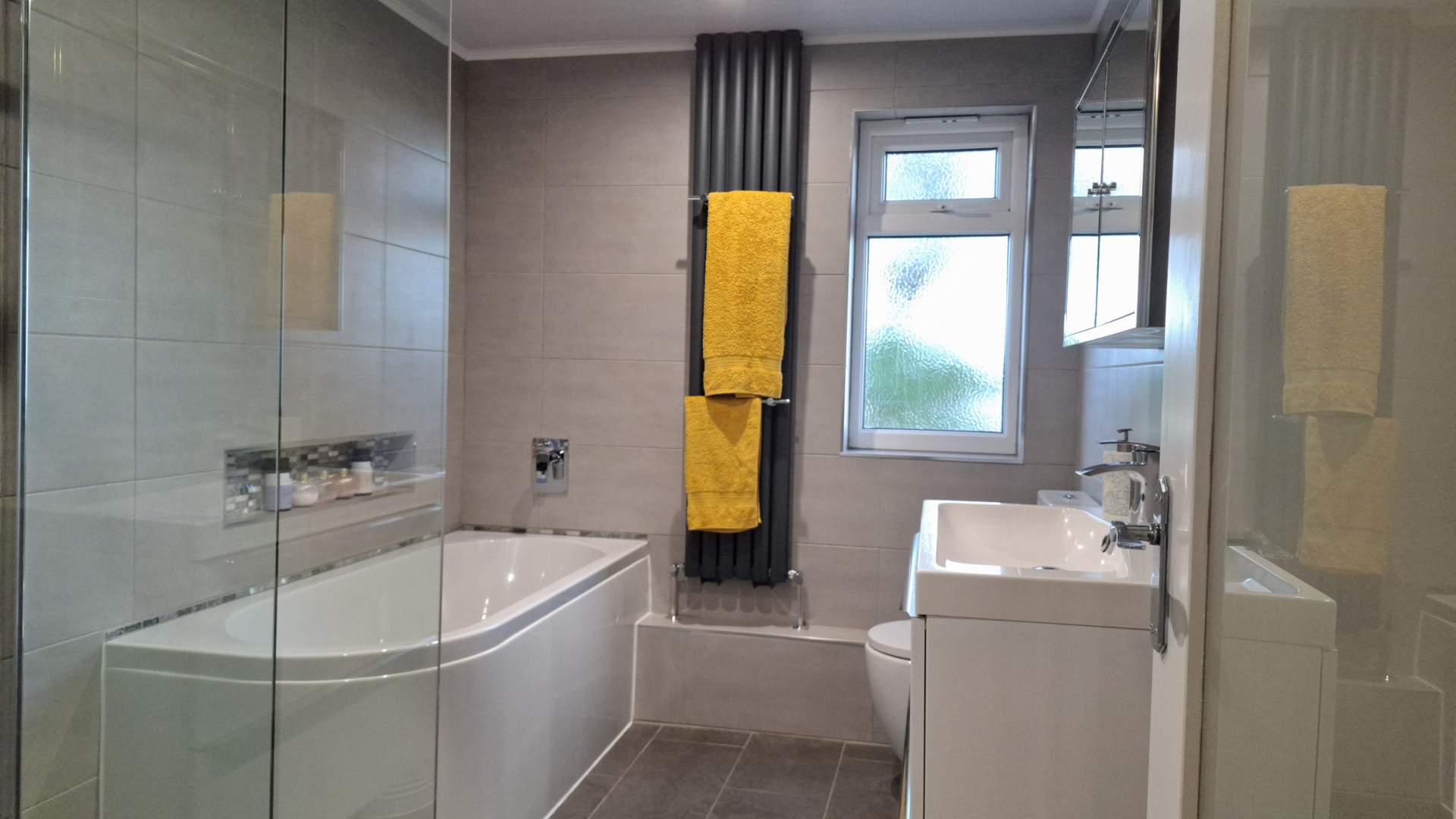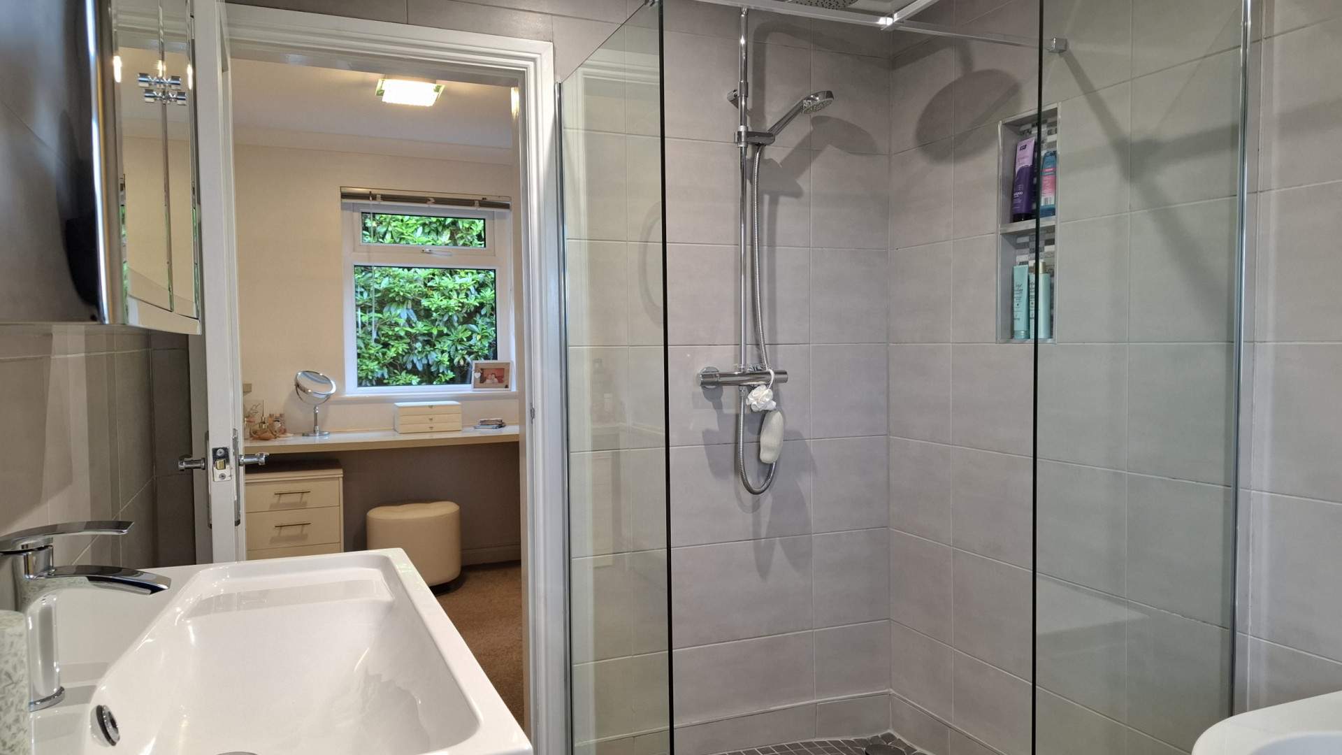 Spacious bathroom with a uPVC double glazed frosted window looking on to the front aspect. On your left when entering the bathroom is a large walk-in shower with two shelves built into the wall. A white bath is positioned left of the window with a further recessed shelf in the wall. Located in front of the window is a white WC and a wall mounted white sink with storage below in front of you on the right-hand wall. There is a wall mounted cupboard with two mirrored doors for storage. The walls are tiled floor to ceiling, recessed ceiling lights and extractor fan. The bathroom is finished with tiled flooring throughout.