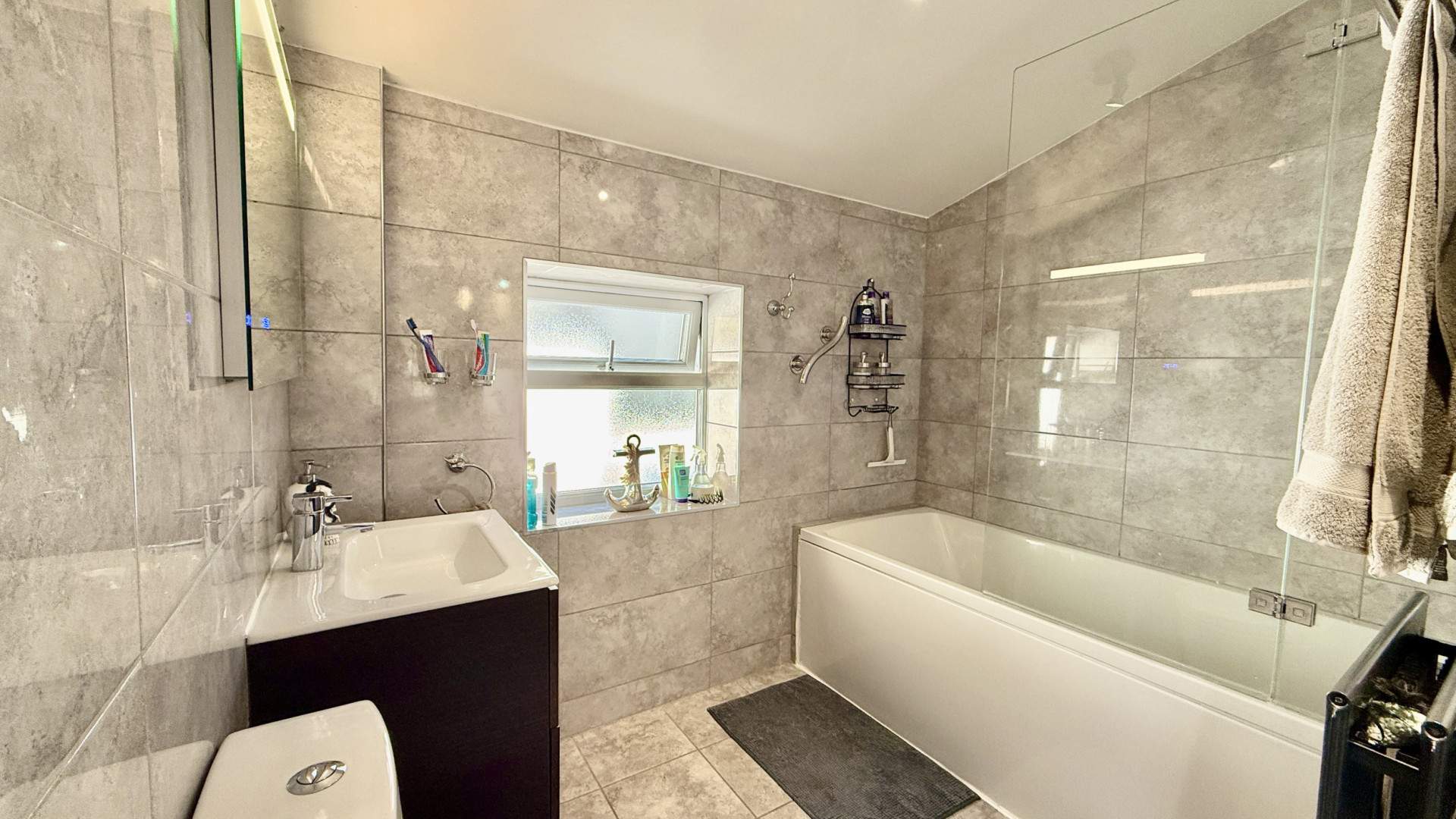 Spacious bathroom located off the kitchen via a hallway, with a 3 piece suite comprising of a white WC and sink with vanity unit below. The bath is to your right when entering the bathroom with a shower attachment and bi-fold glass shower screen. The bathroom is finished with a ceiling light, tiled walls and tiled flooring throughout.
