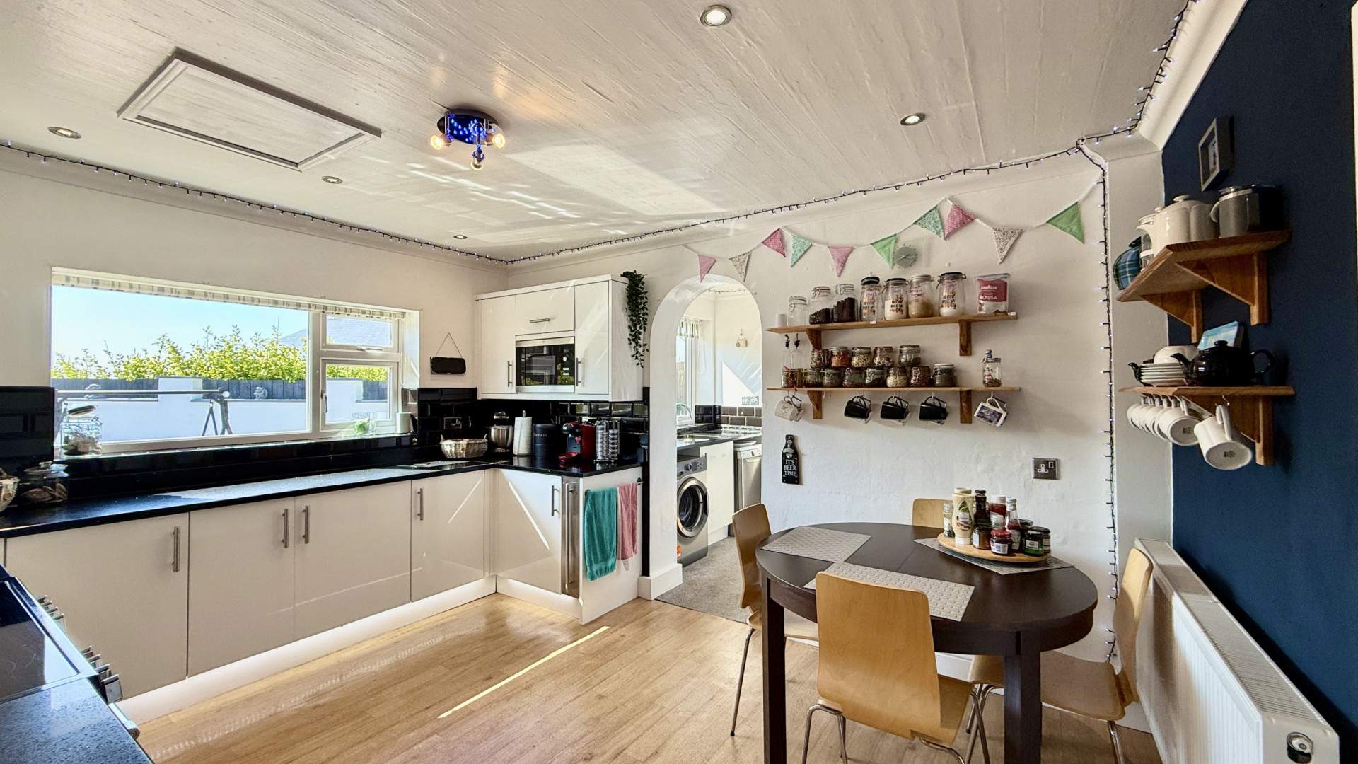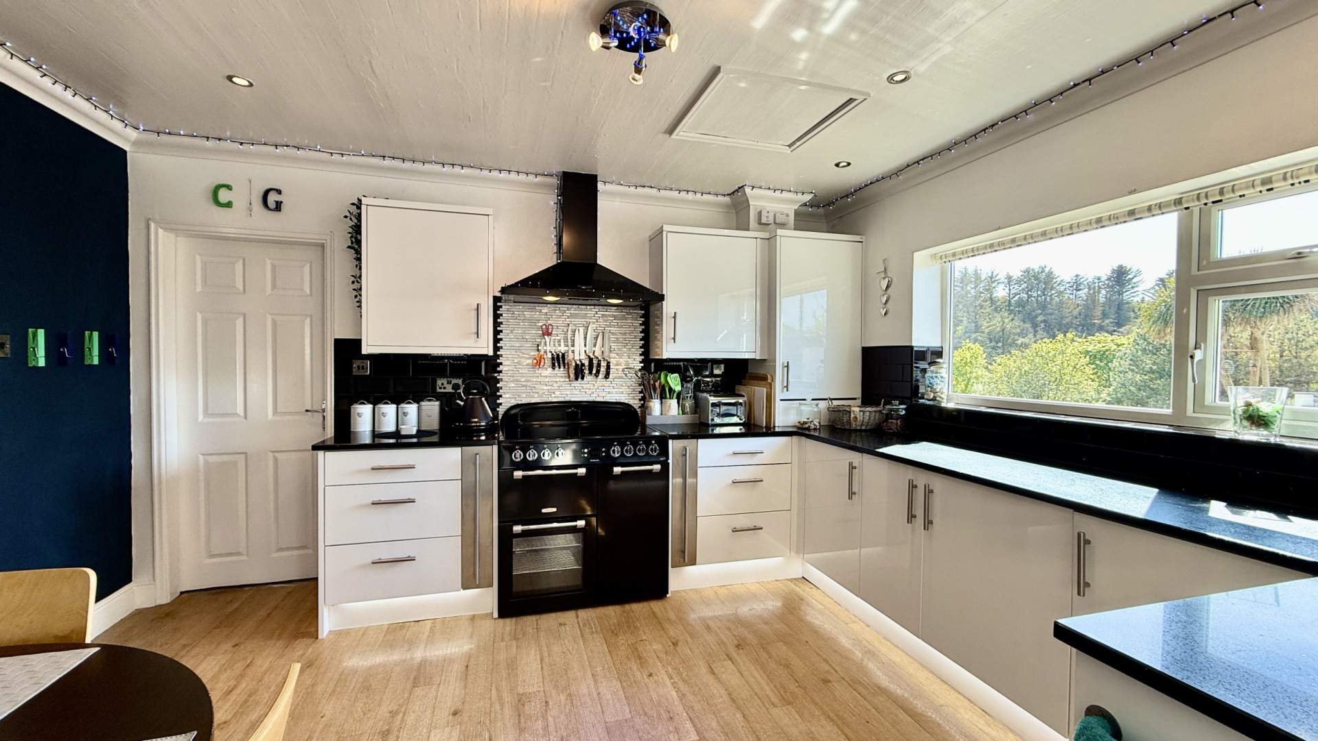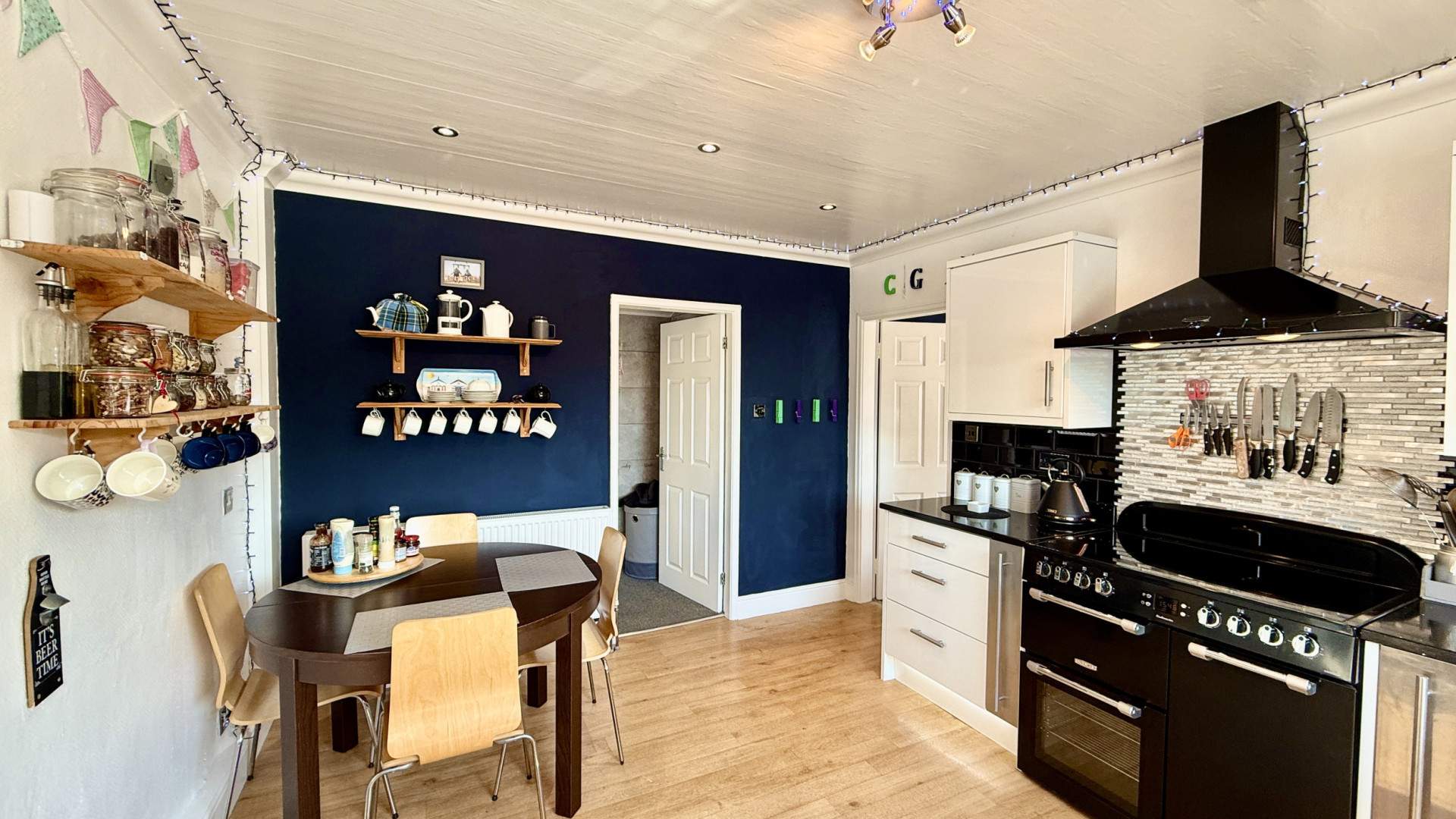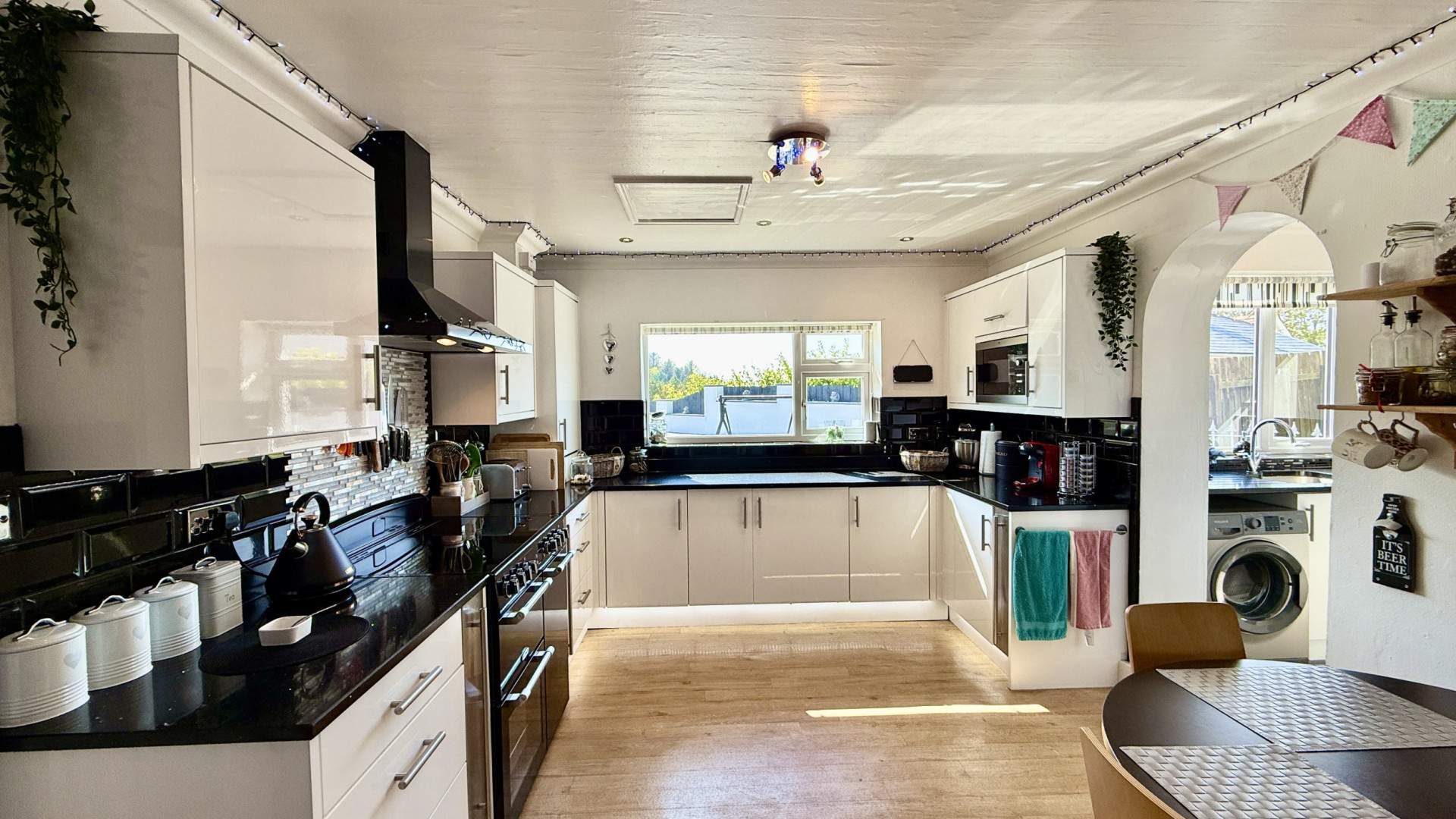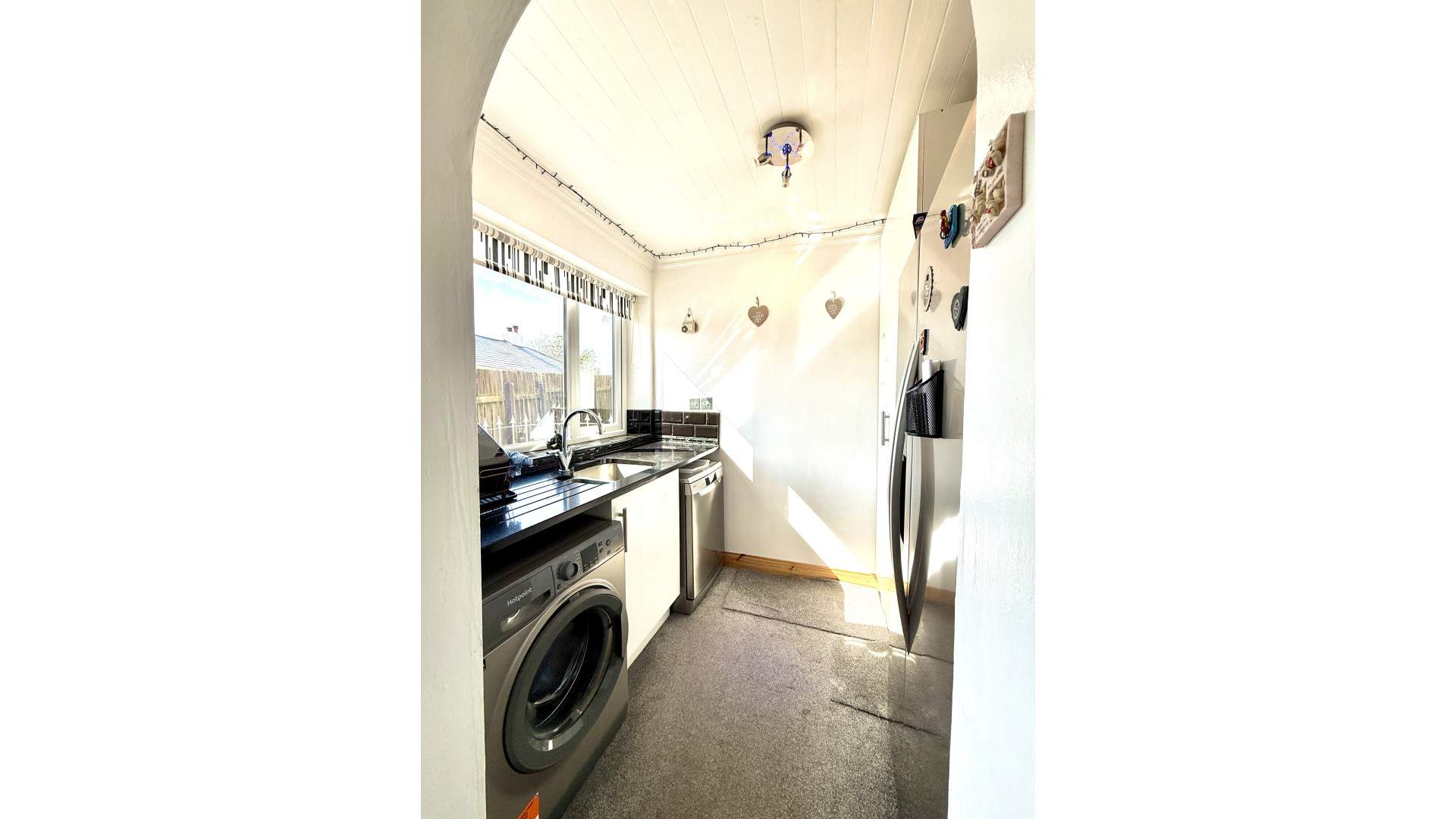 Bright spacious kitchen with views on to the front aspect of the property through a large uPVC double glazed window. On your left when entering the kitchen are floor and wall mounted white cupboards with a black countertop. There is a large standalone electric cooker with 5 rings on top with a extractor fan wall mounted above. The storage is continued the full length of the wall with the window and round to the arch way accessing the utility room. The integrated microwave is wall mounted next to the arch way, with space for a round dining table and chairs by the door accessing the bathroom. The kitchen is finished with ceiling lights and linoleum flooring.