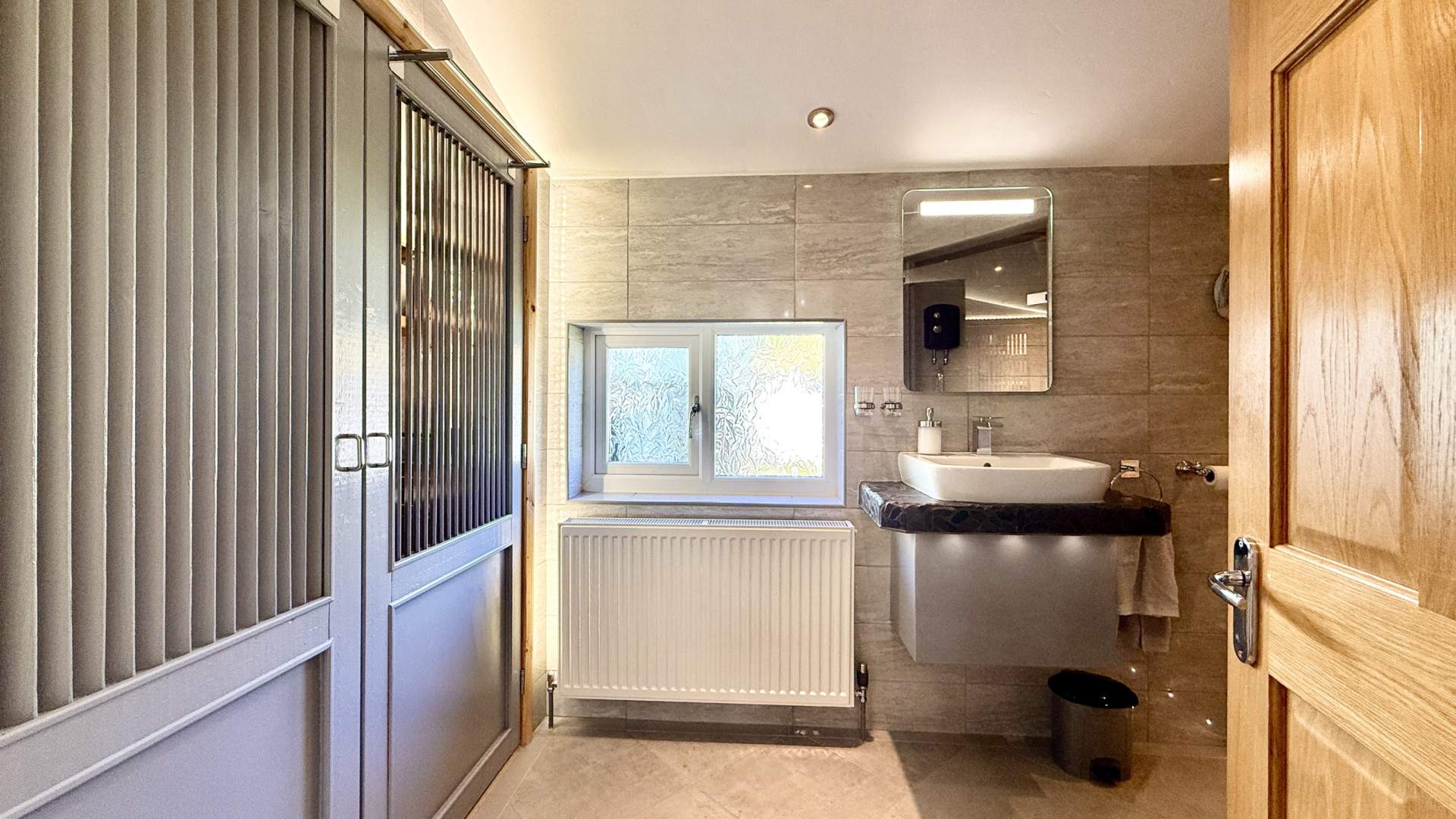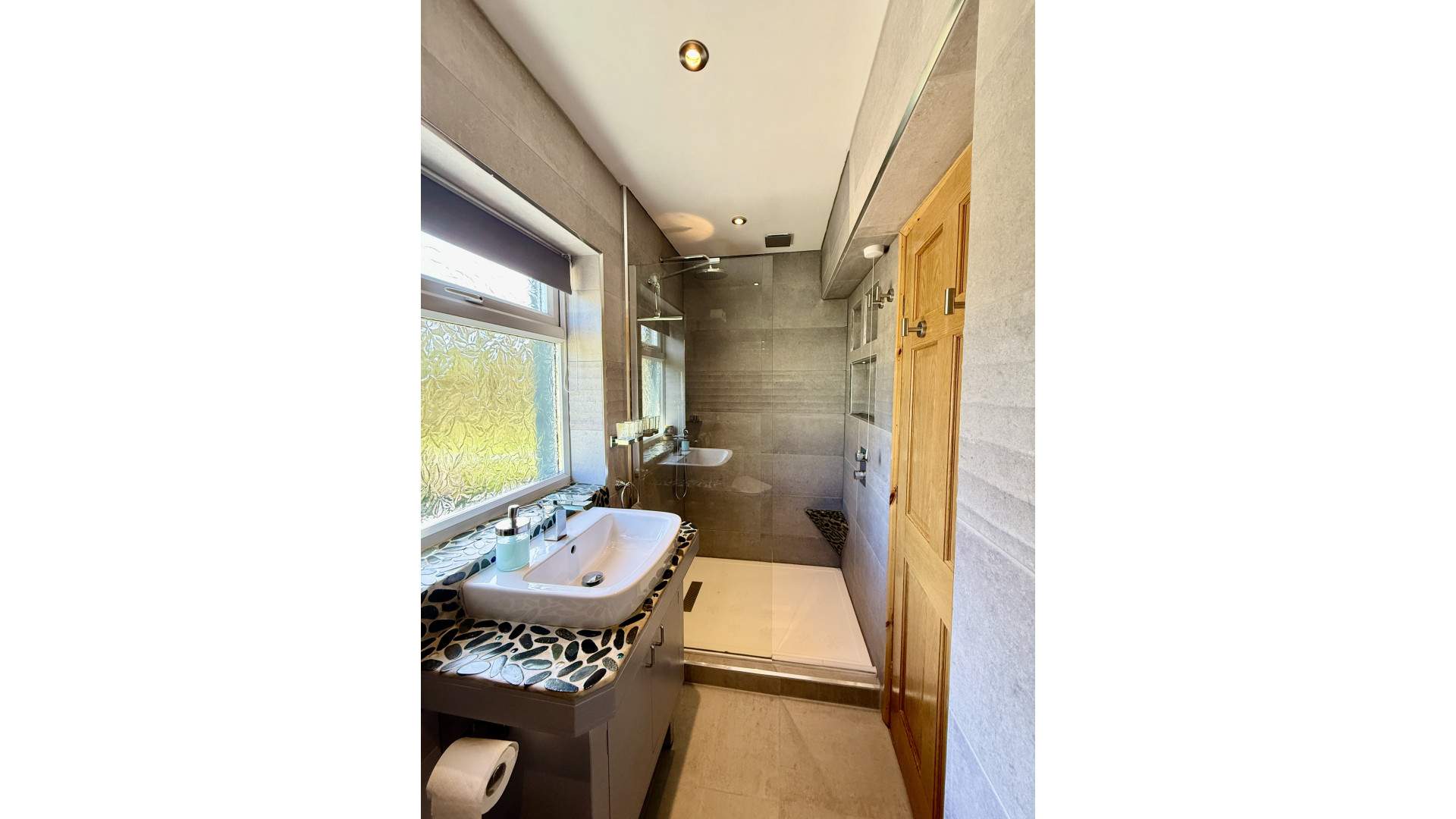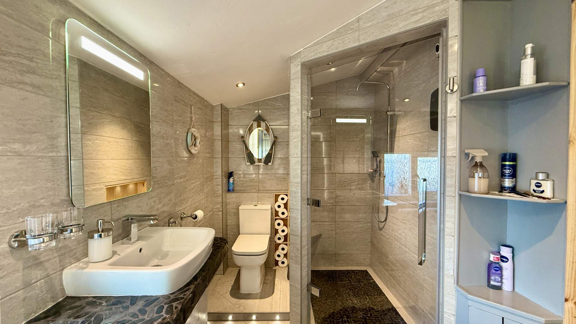 Spacious bathroom with a fantastic walk in shower next to a white WC and a wall hung sink with wall mounted mirror above. The sink is located next to the uPVC double glazed frosted window looking on to the rear aspect. A large double storage cupboard is on your left with lighting with shelving next to the shower cubicle on your right. The bathroom is finished with recessed ceiling lights, tiled walls and tiled flooring throughout.