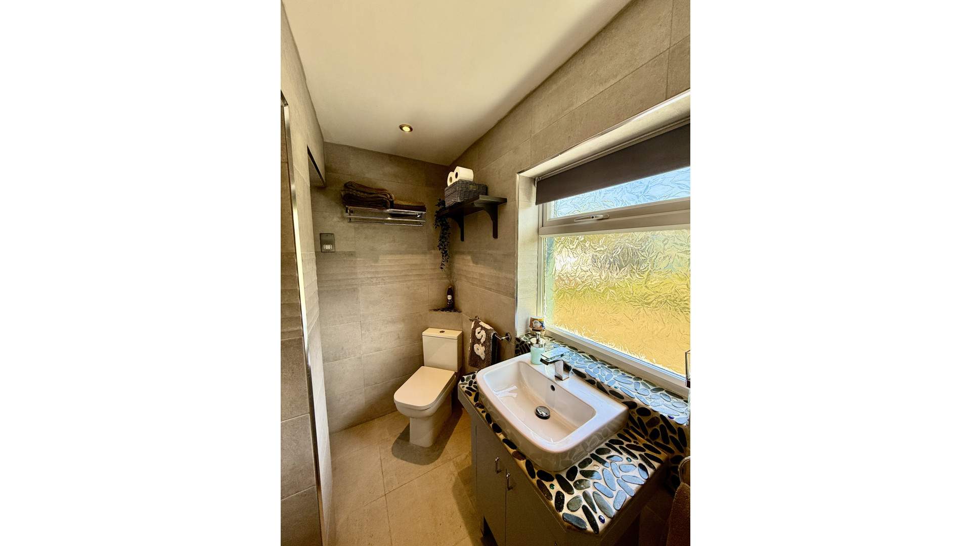 Bright bathroom with a white three piece suite comprising of a walk in shower with glass shower screen on your right, the WC is in the left corner of the room. There is a wall hung cupboard with double doors which has the sink on top positioned in front of the uPVC double glazed frosted window looking on to the side aspect. The bathroom is finished with a ceiling light, tiled walls and tiled flooring throughout.