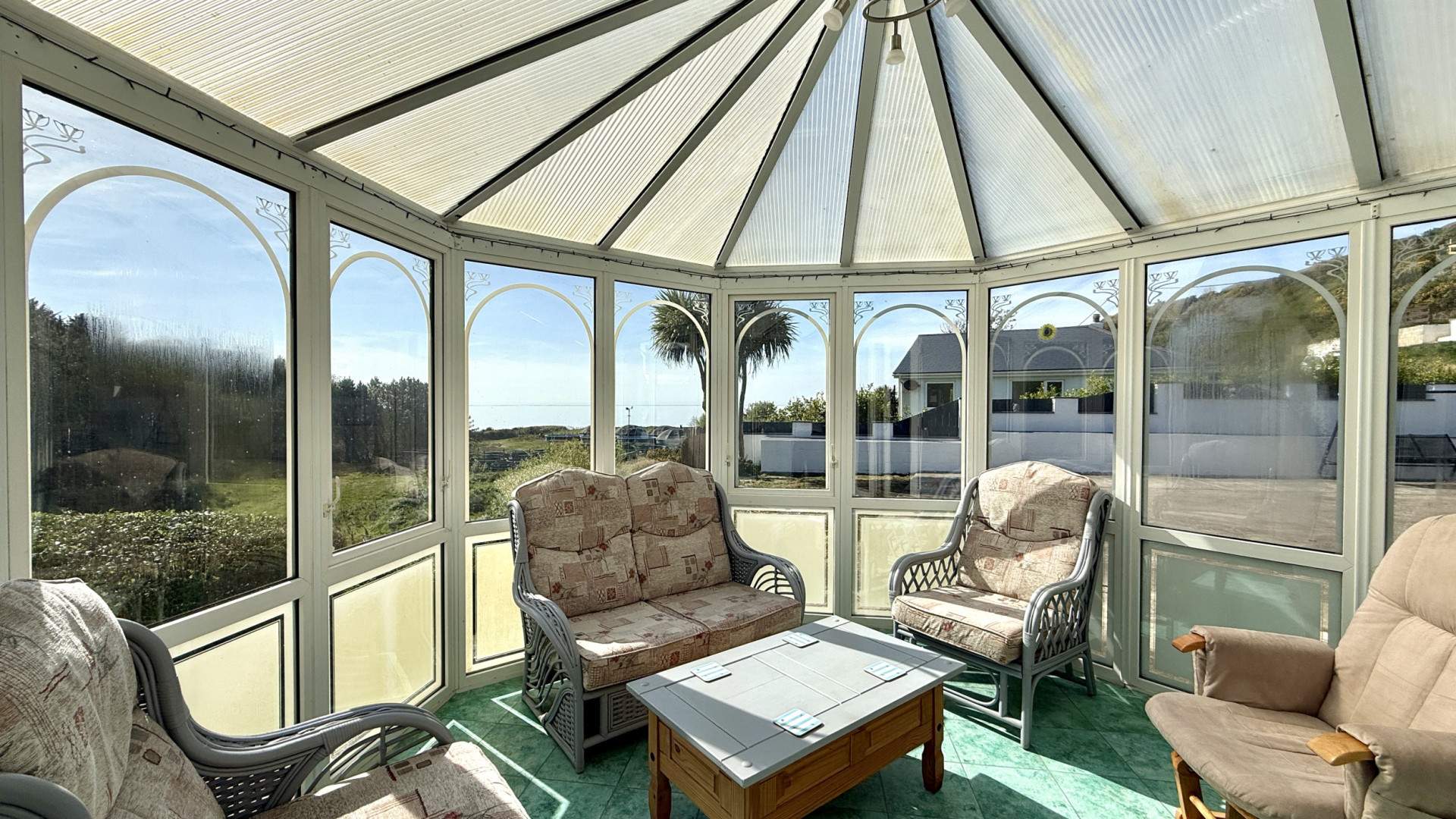 Pentaganol shaped conservatory with uPVC double glazed windows to all sides and a uPVC double glazed door opening on to the side aspect