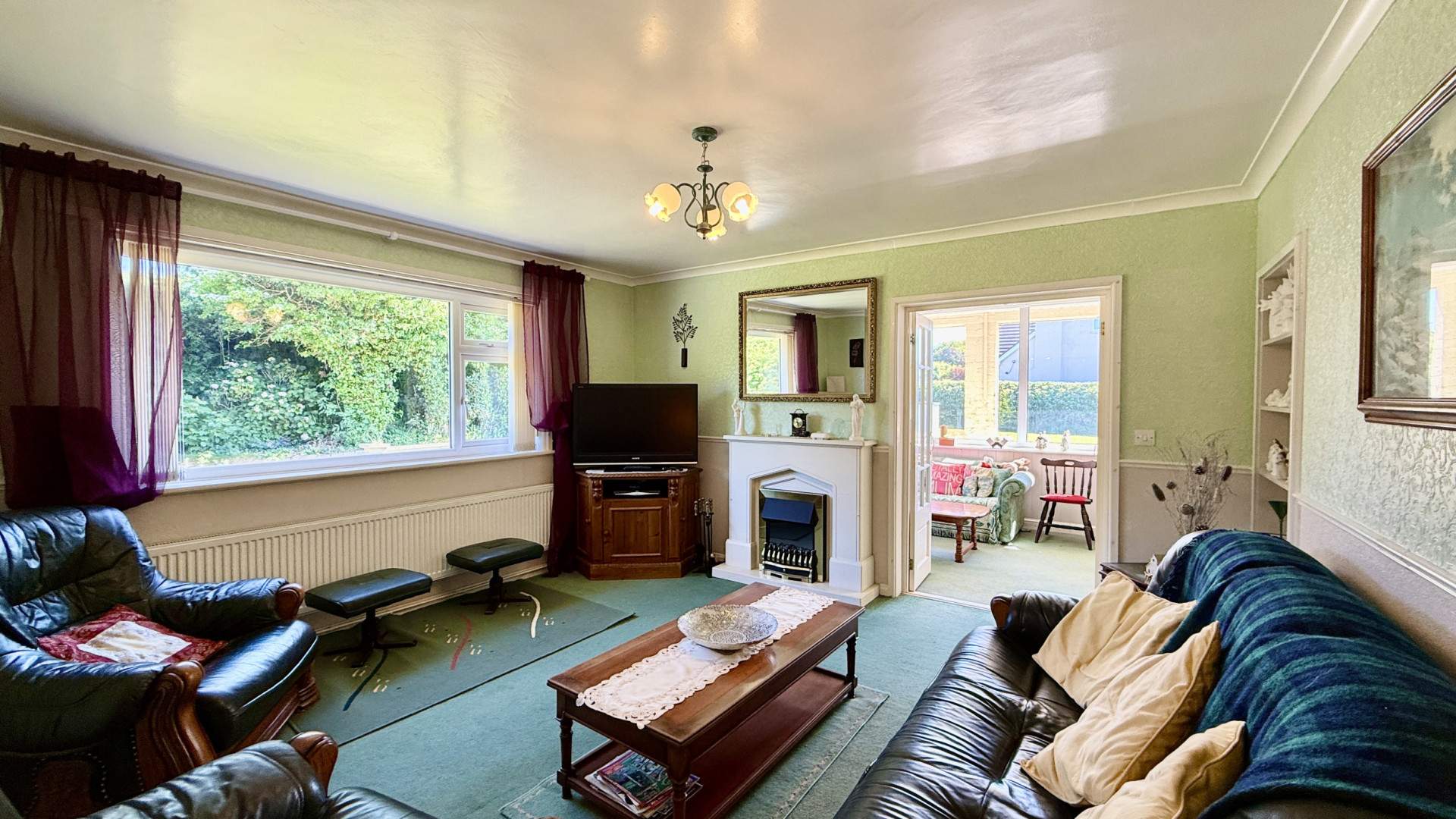 Spacious lounge with a uPVC double glazed window providing views on to the front aspect. Ahead of you when entering the lounge from the hallway is the electric fire with white hearth and surround. To the right of the fireplace is a set of paned double doors which lead to the snug room. The lounge is finished with a ceiling light and carpeted flooring.