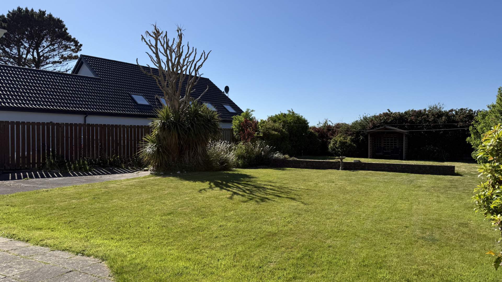 To the front of the property is off road parking for two vehicles in addition to the attached single garage. Outside the front door is a lawned area with the boundary being a knee-high wall with decorative concrete blocks to all sides. There is a small hedge to one end and a flower bed the end. The path in front of the property is a mixture of pebbles and concrete path which navigates around the edge of the property to the rear garden.