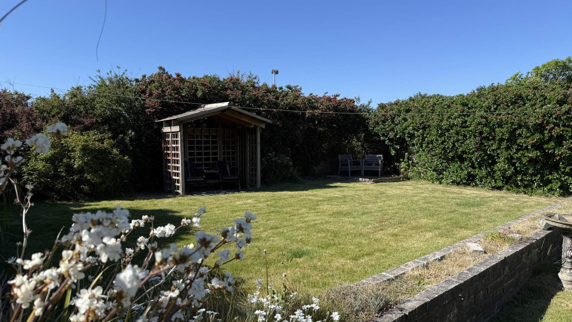 To the rear of the property is a large lawn with the boundary being a mixture of hedging and wooden fencing. There is a large, private patio area outside the conservatory door and next to the storage room which has two uPVC double glazed windows and a frosted glass door.