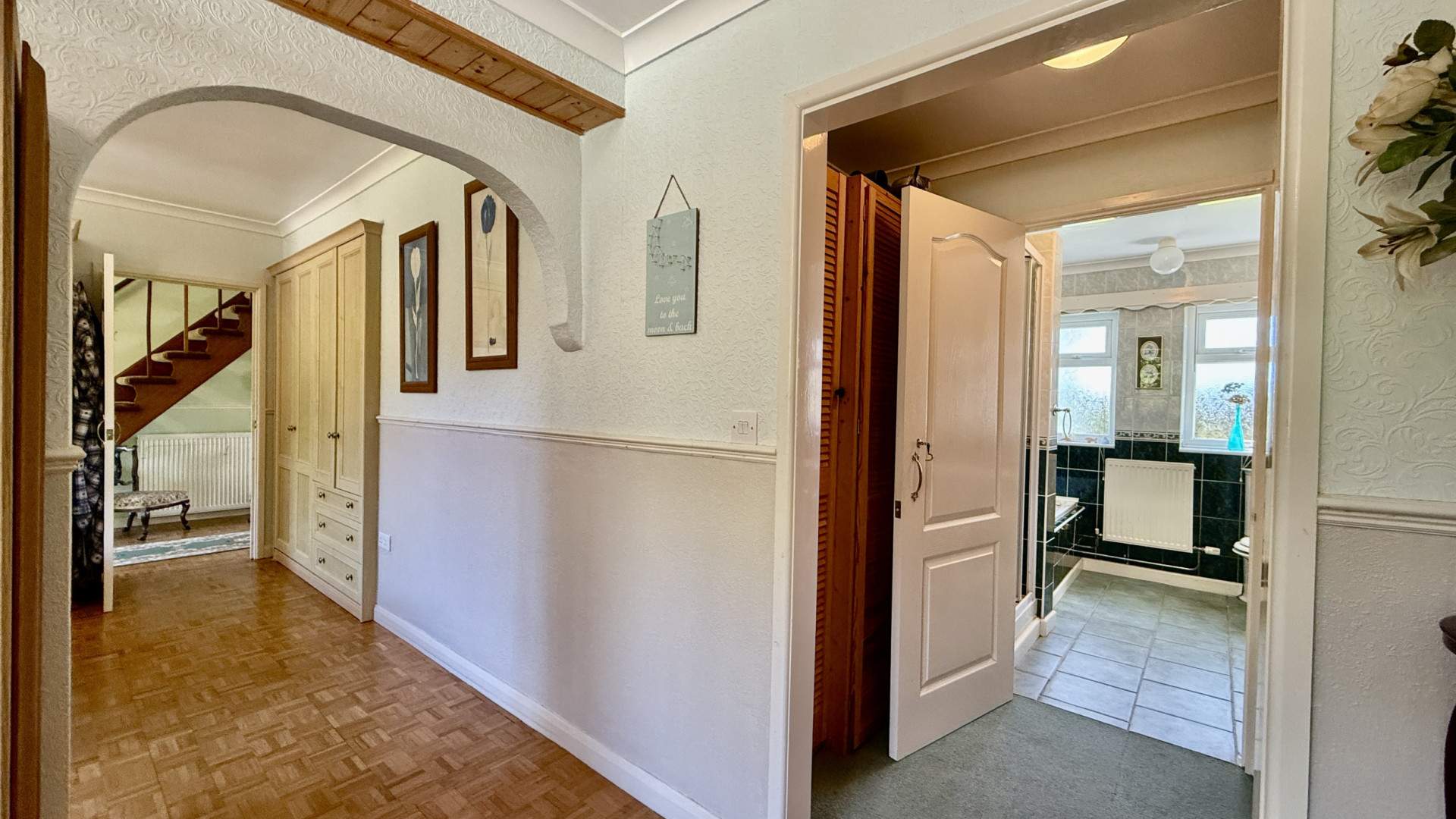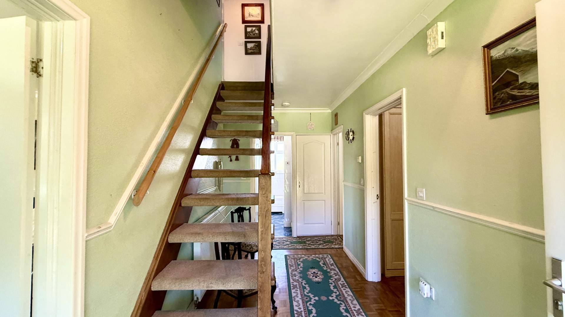 A wide spacious hallway with a wooden staircase set to the left along with the doors accessing the lounge and kitchen. The first door on your right leads to the master bedroom, the second door on the right accesses the dining room. The hallway is finished with a ceiling light, wooden flooring and the staircase is carpeted.