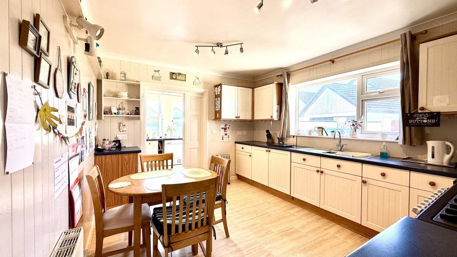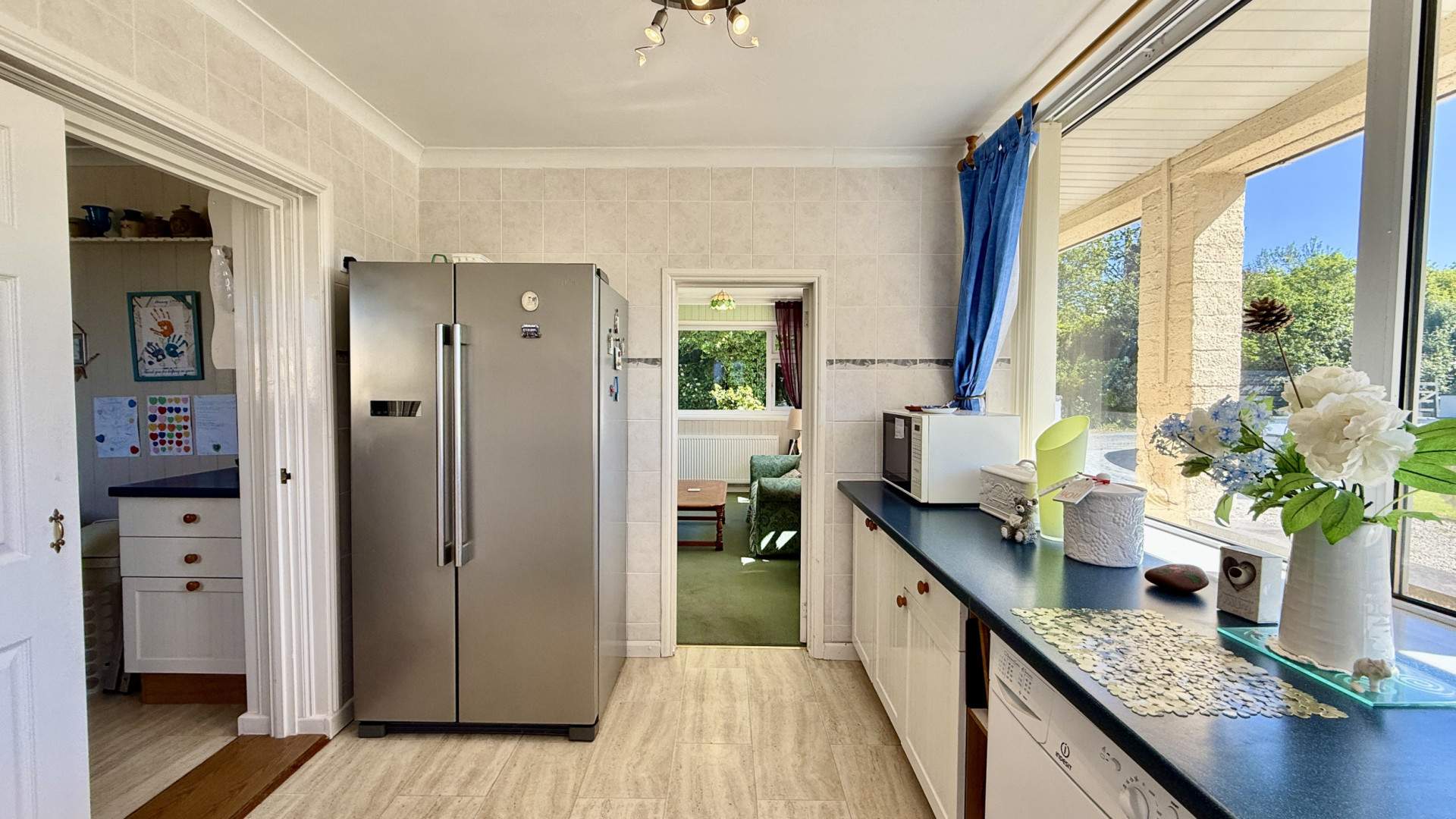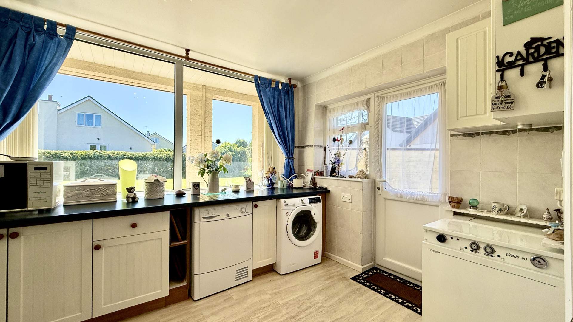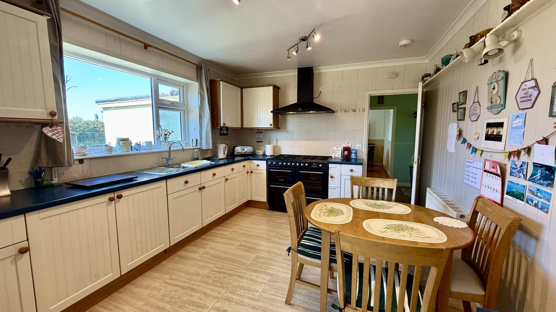 Airy and bright with a uPVC double glazed window providing views on to the rear aspect. When entering the kitchen from the hallway, kitchen cupboards with a dark blue countertop are to your right and run along under the window. The Cannon multi range cooker with extractor fan is on your right with the stainless-steel sink and a half with drainer positioned under the window. There are floor and wall mounted cupboards, with wall mounted corner cupboards either side of the window. The wall mounted cupboards have lighting below and a bi-fold double door provides access to the utility room. The kitchen is finished with ceiling lights and vinyl flooring.