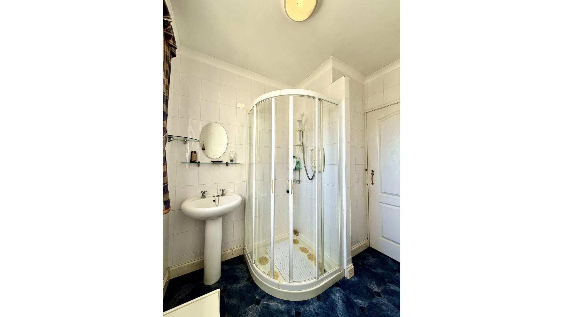 Located at the end of the hallway with a uPVC double glazed frosted window looking on to the rear aspect with a white three-piece suite. The white three-piece suite has a WC, pedestal sink with glass shelf and wall mounted mirror above. On your right when entering the bathroom is an electric corner shower. Behind the door when entering the bathroom are two storage cupboards. The bathroom is finished with a ceiling light and linoleum flooring.