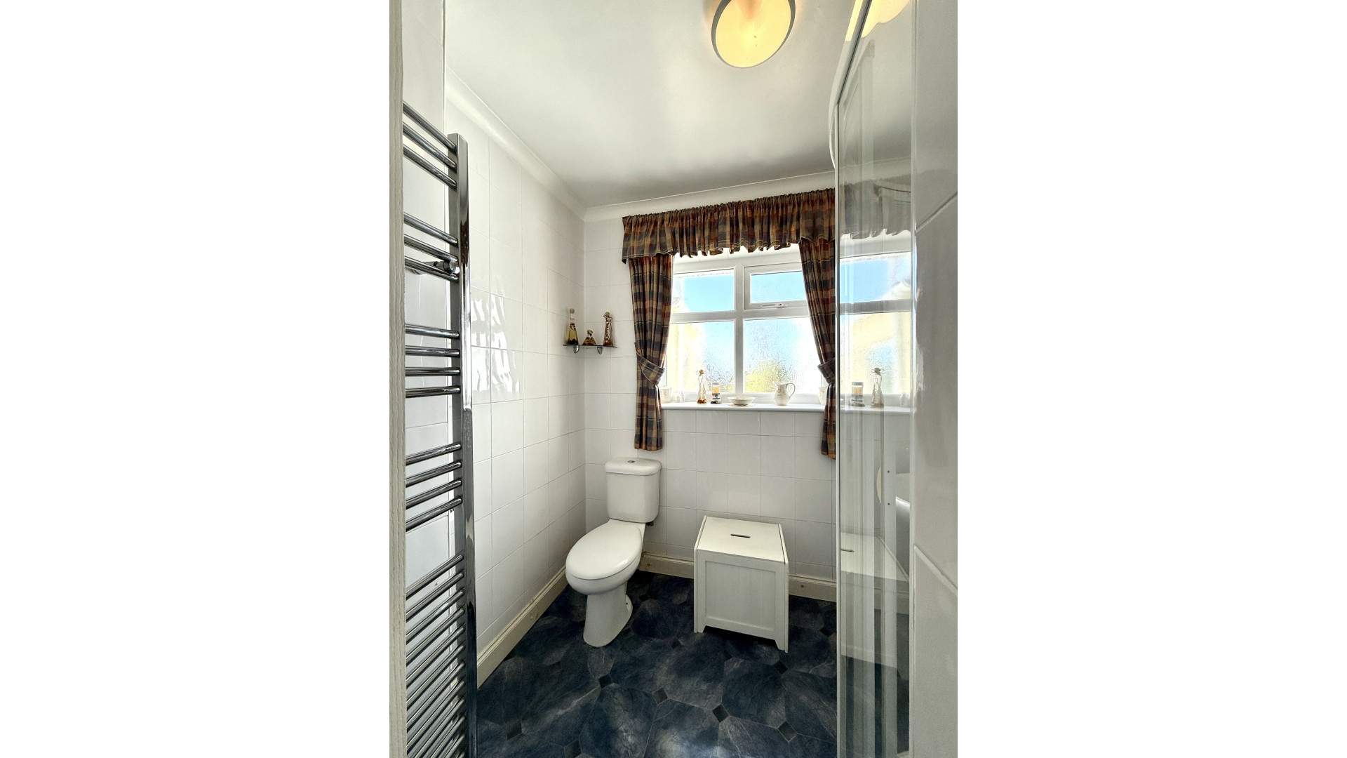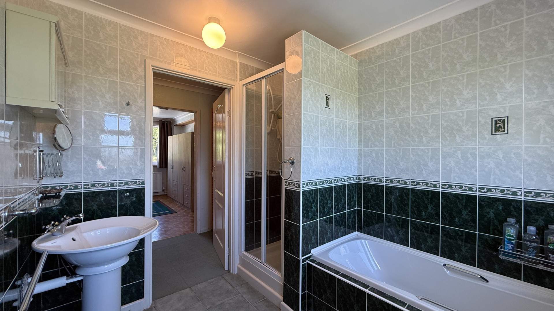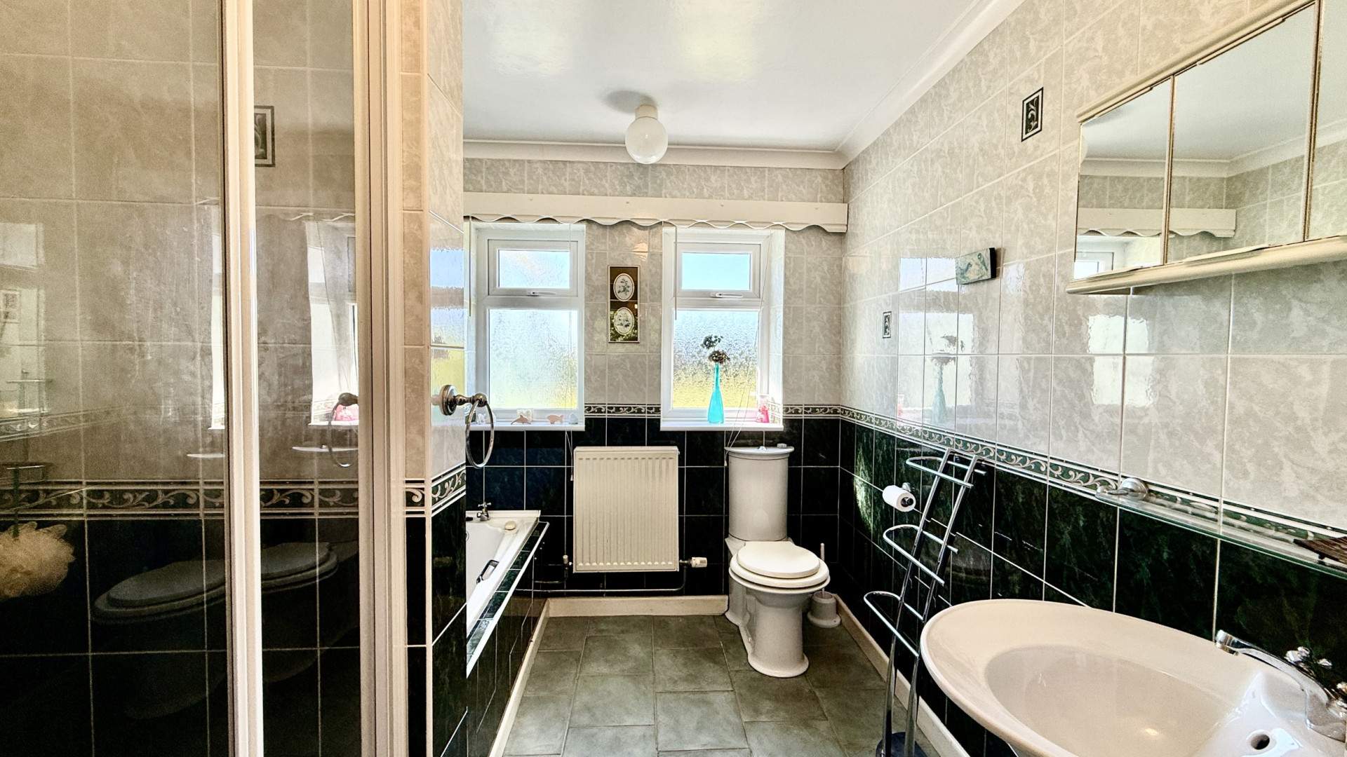 Airy bathroom with two uPVC double glazed frosted windows providing views to the rear aspect. The bathroom has a white four-piece suite comprising of a square shower cubicle to your left with a Sapphire electric shower and separate bath. The WC is positioned under the right-hand window with the circular pedestal sink on your right with wall mounted cupboard above. There are two ceiling lights with the floor and walls tiled throughout.