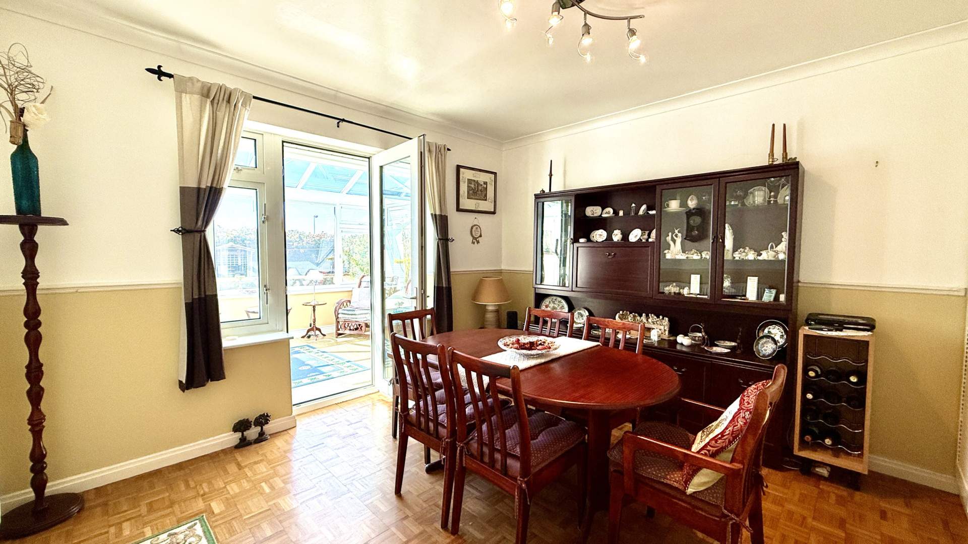 Spacious dining room with ample space for a six-seater table and sideboard. There is a triple built in cupboard for storage and a uPVC double glazed, paned door with windows either side accessing the conservatory. The dining room is finished with a ceiling light and wooden flooring.