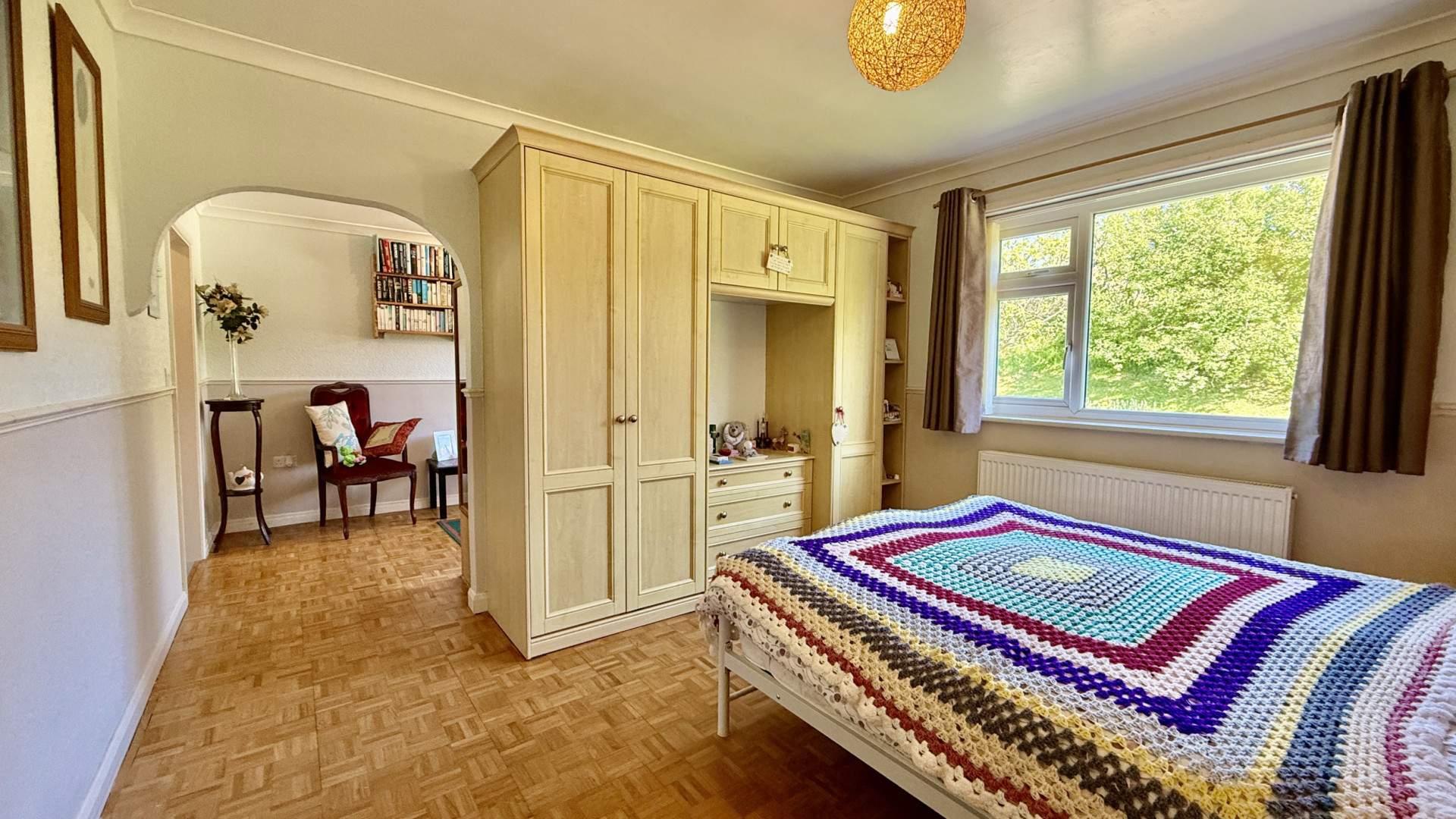 Large double bedroom with a uPVC double glazed window providing views to the front aspect. Behind the door is over the bed storage with bedside tables, further storage is provided with built in wardrobes and drawers. There is an arch leading to a walk in wardrobe area with seating and a further uPVC double glazed window looking on to the front aspect. The dressing room has additional storage with further wardrobes in the passageway leading to the ensuite bathroom. The bedroom and dressing room are finished with ceiling lights and wooden flooring, the passageway has a ceiling light and carpeted flooring.