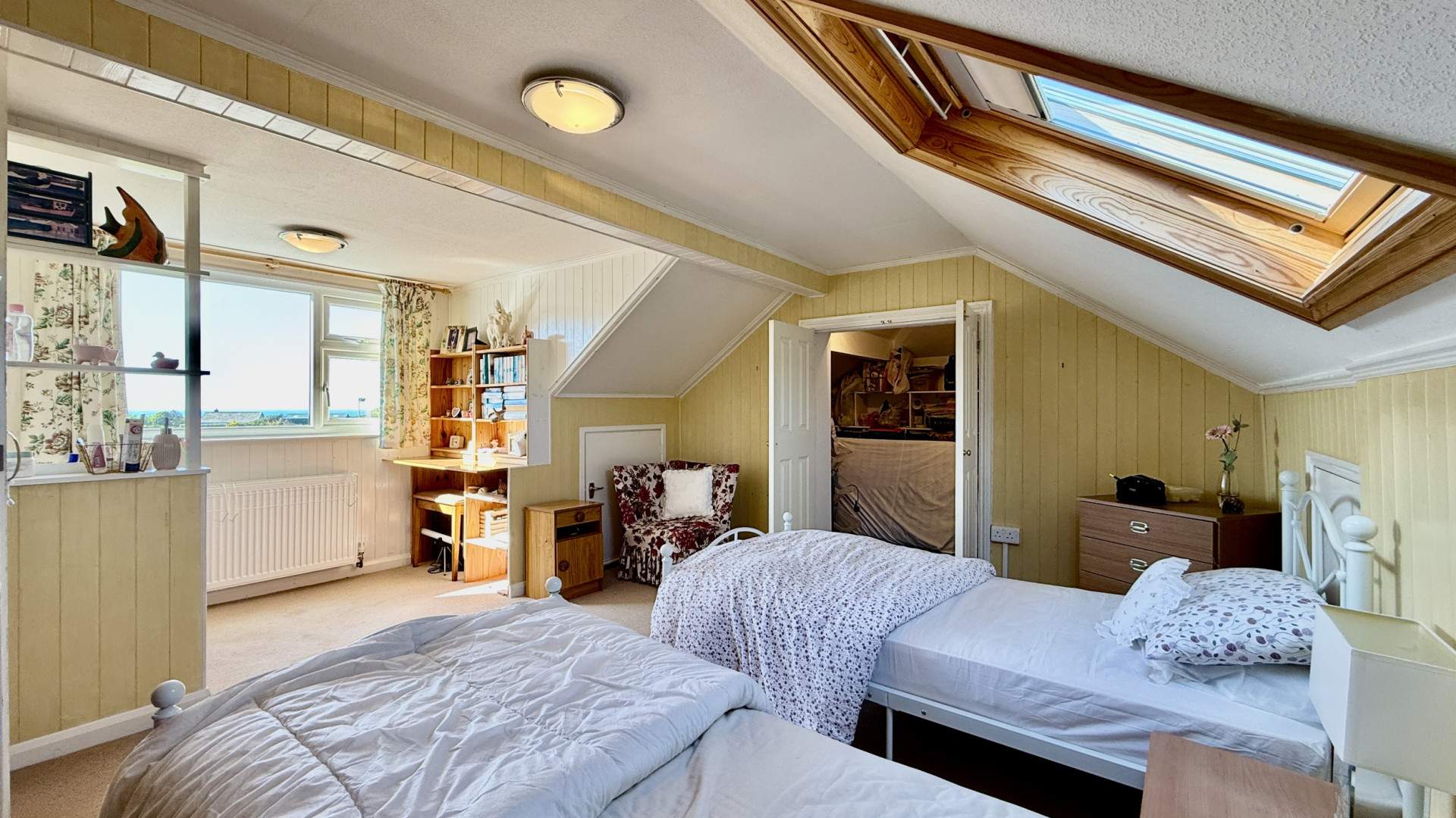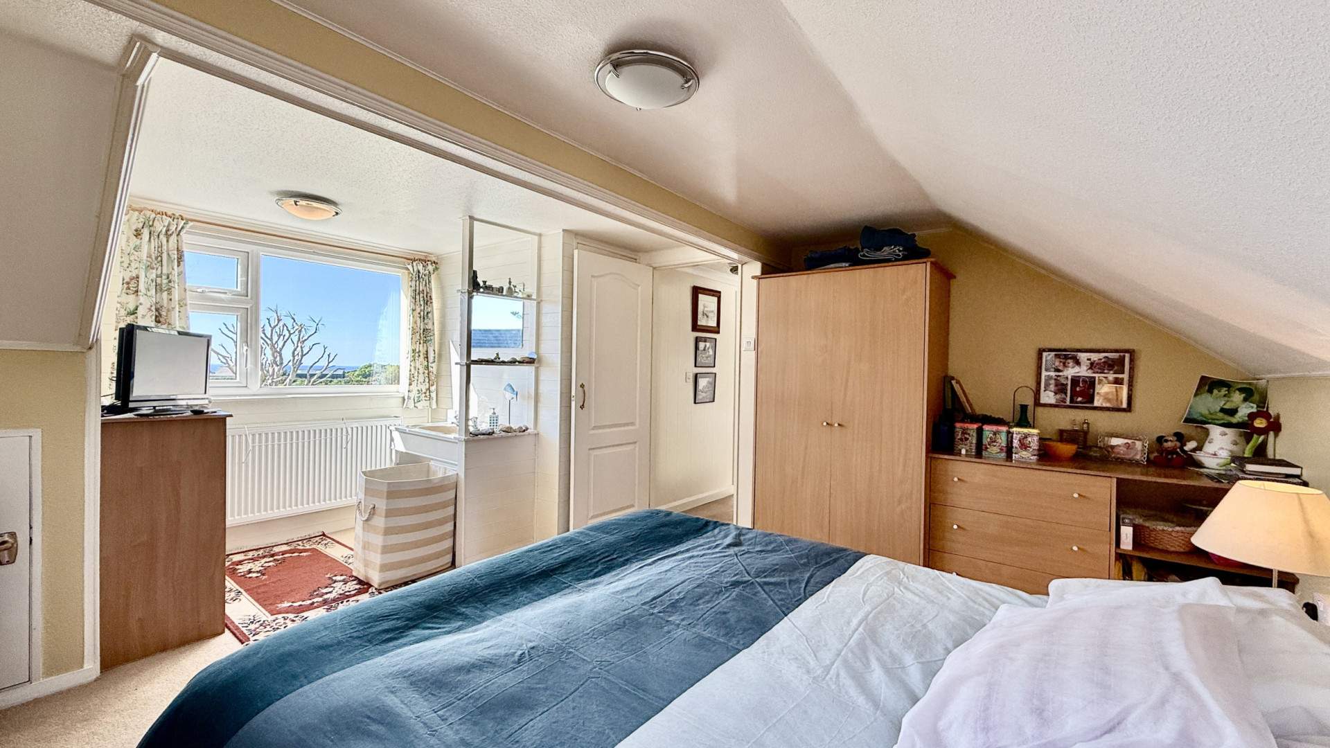 Large double bedroom located on your left when on the landing. There is a velux window the front aspect and a uPVC double glazed window looking on to the rear aspect and coastal views out to sea. Within the bedroom there is a storage cupboard behind the door and a large storage space behind the double doors at the far end of the bedroom. In the bedrooms there is a wash basin with wall mounted mirror above. The bedroom and storage cupboard have ceiling lights and are finished with carpeted flooring.